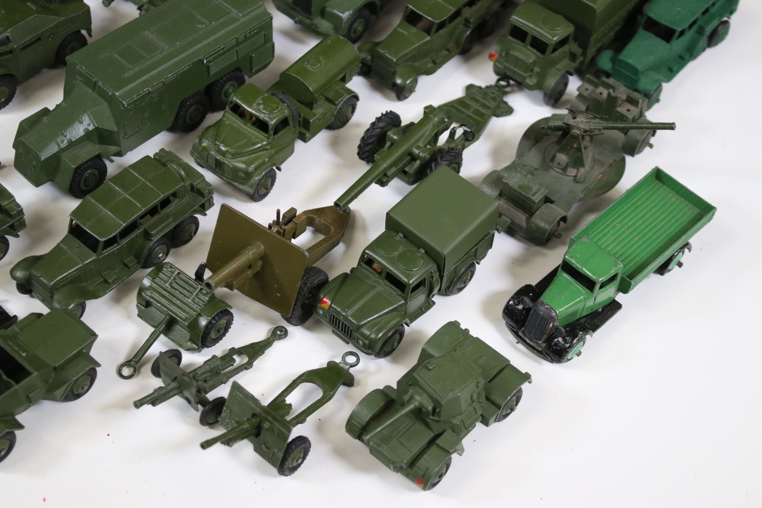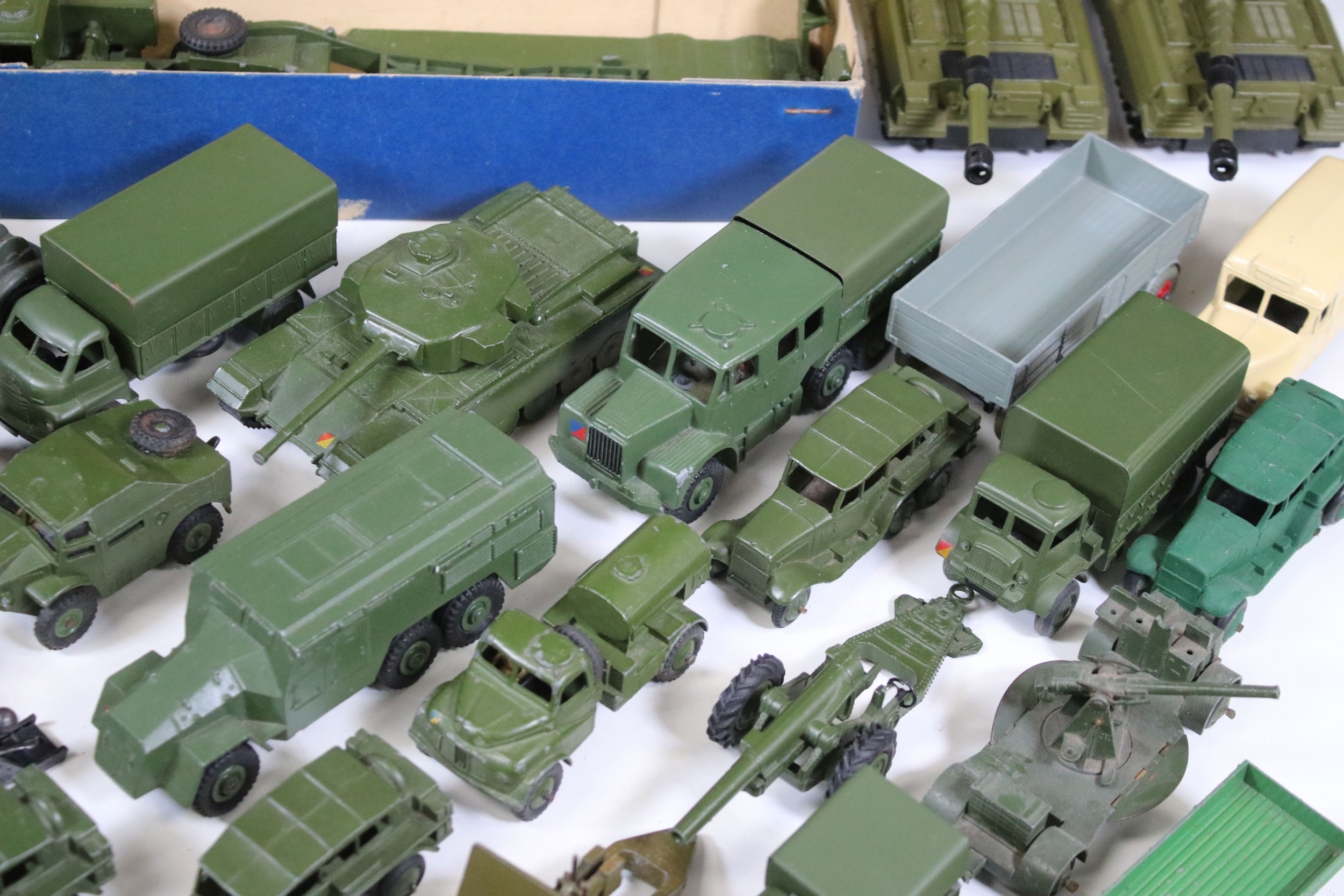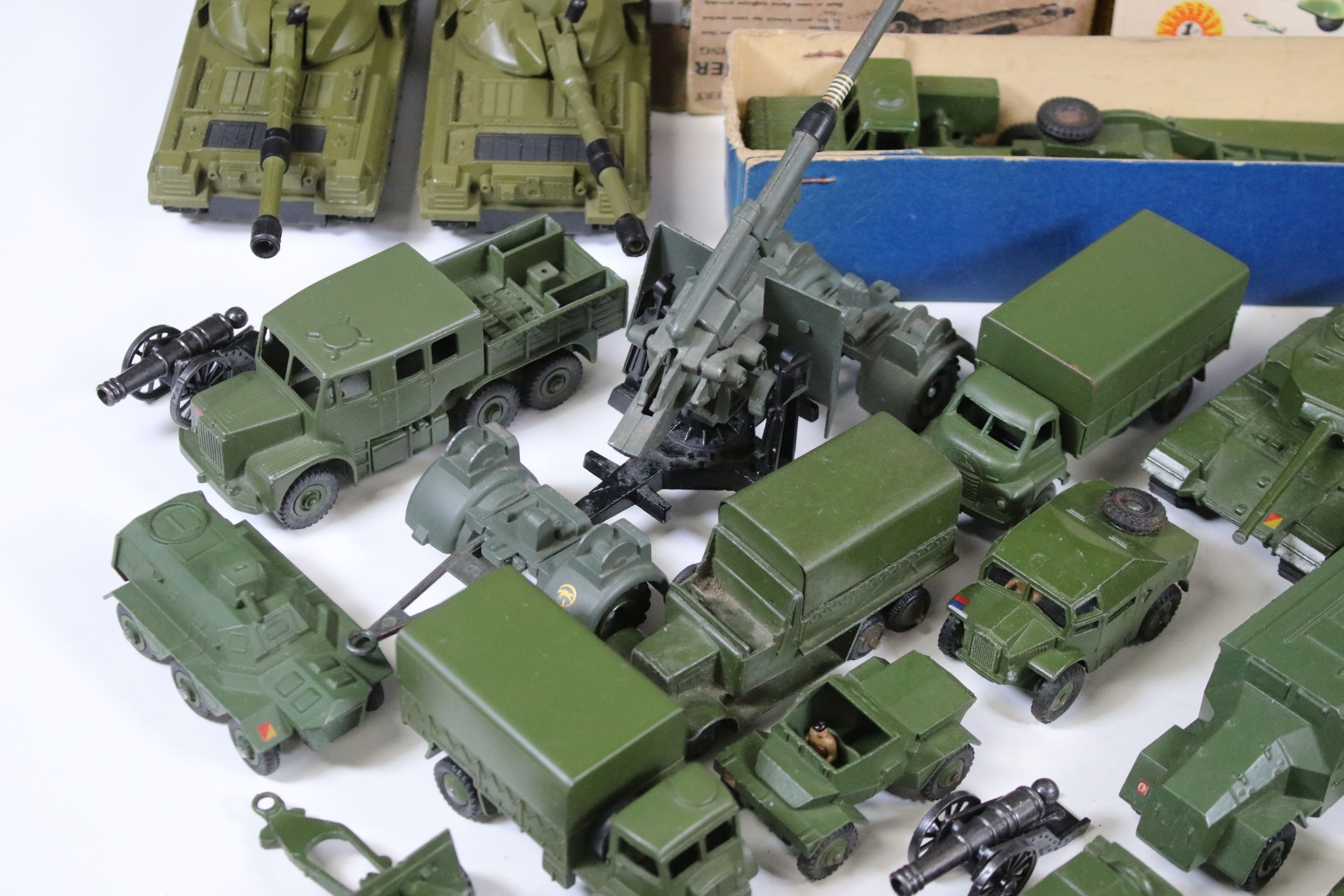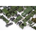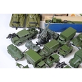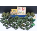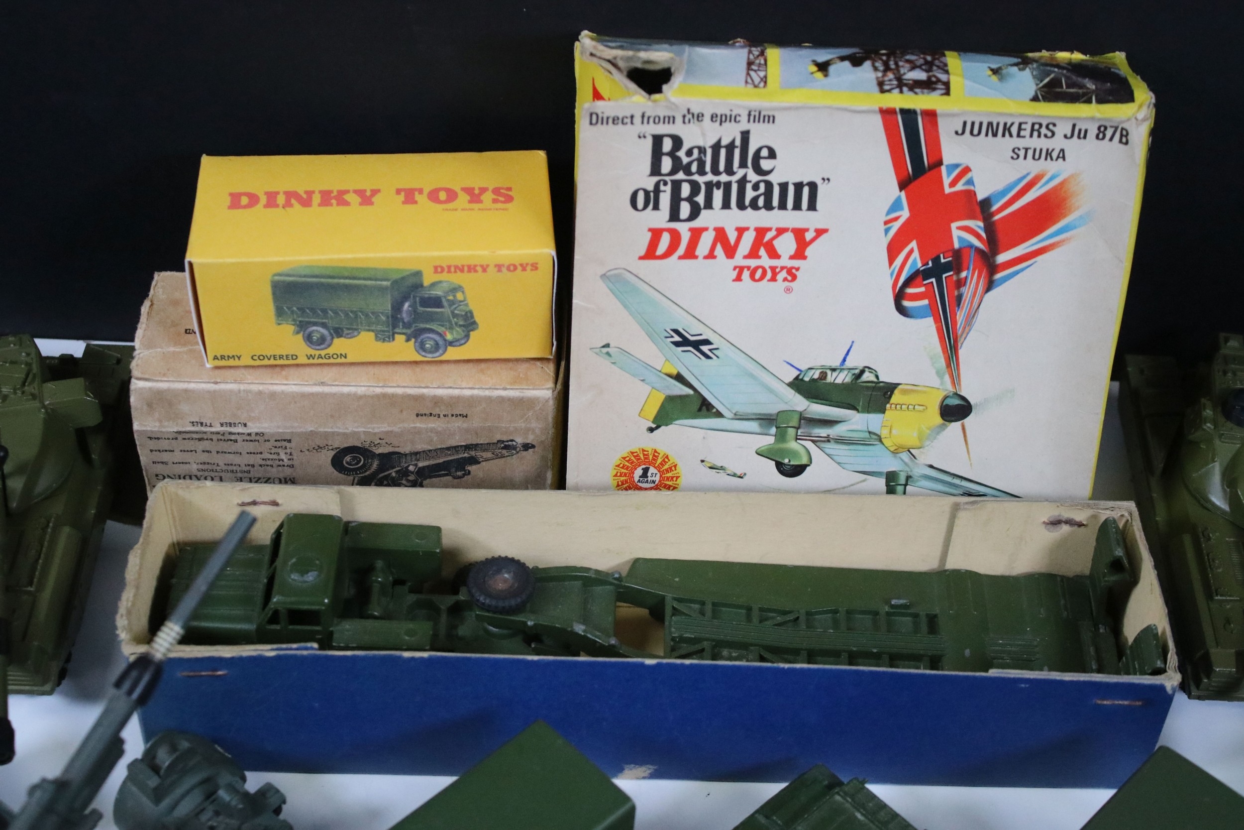 Around 35 Mid 20th C onwards military diecast models to include Dinky, Britains, etc featuring boxed Britains Royal Artillery 4.5' Howitzer Muzzle Loading, boxed Dinky 721 Battle Of Britain Junkers Ju 87B Stuka, Dinky 689 Medium Artillery Tractor, Dinky 621 3 Ton Army Wagon, Dinky Chieftain Tank 155mm Mobile Gun, Dinky 623 Army Wagon, etc, all showing varying amounts of playwear from vg-fair, all boxes have tatty end flaps and signs of storage and edge wear throughout