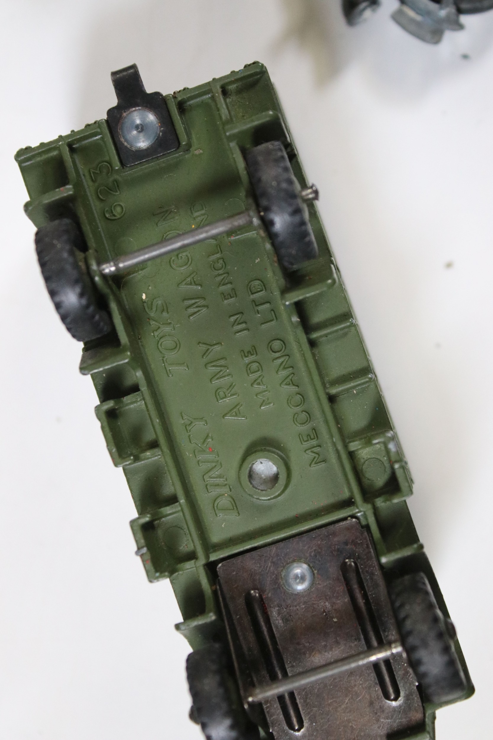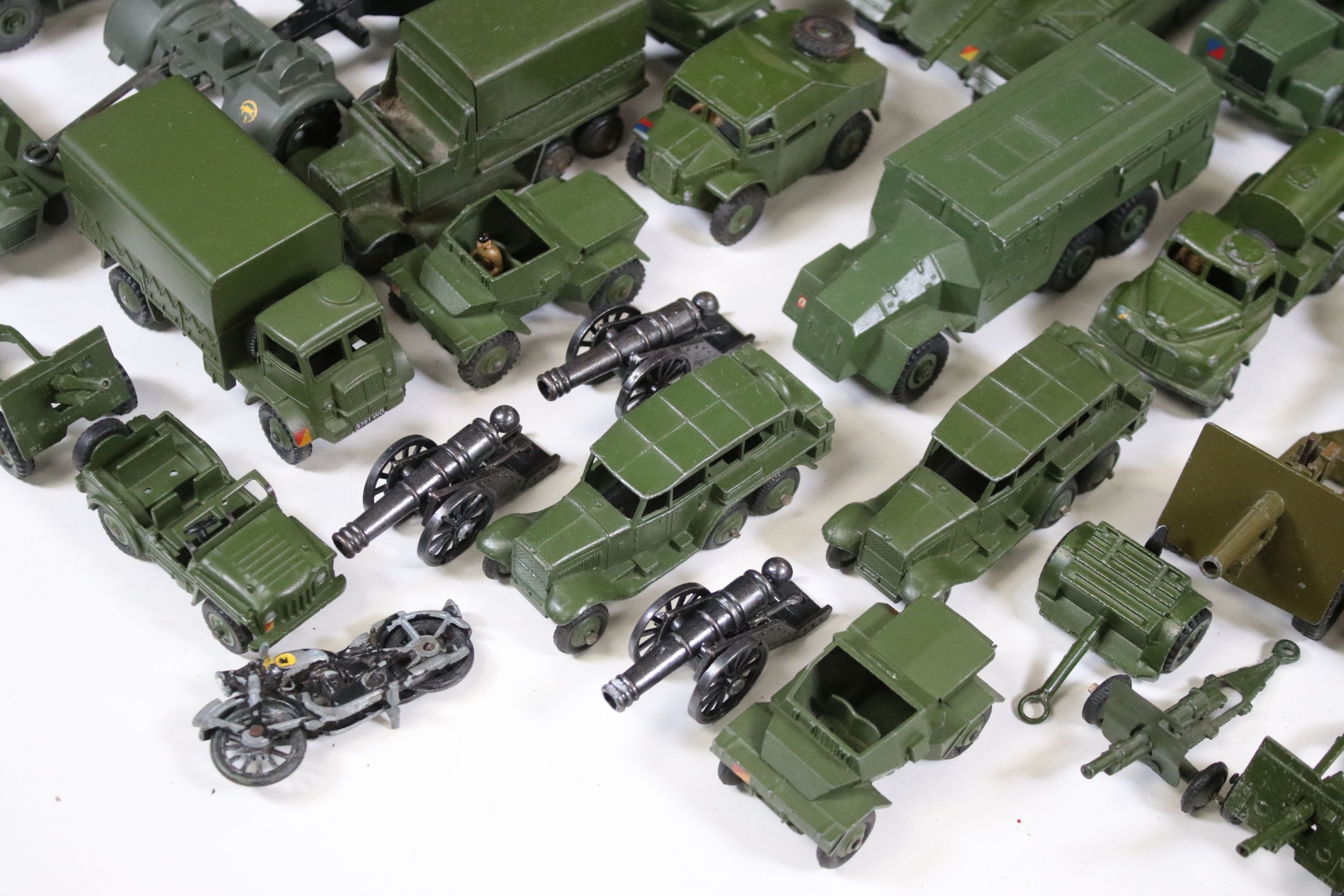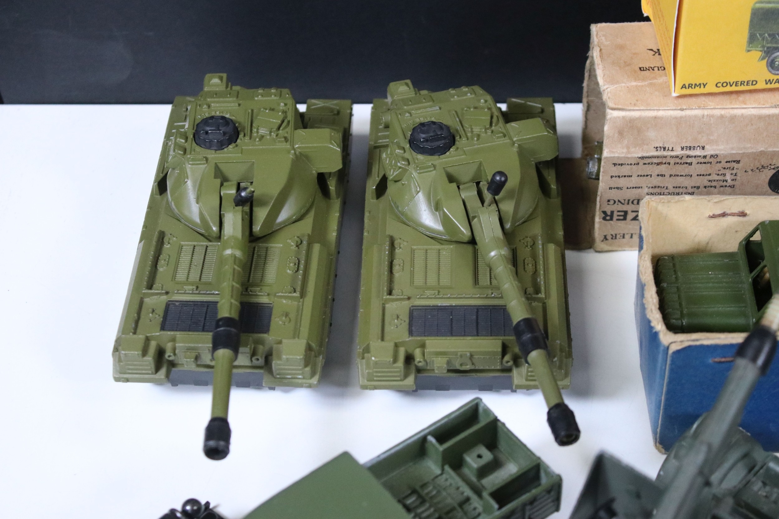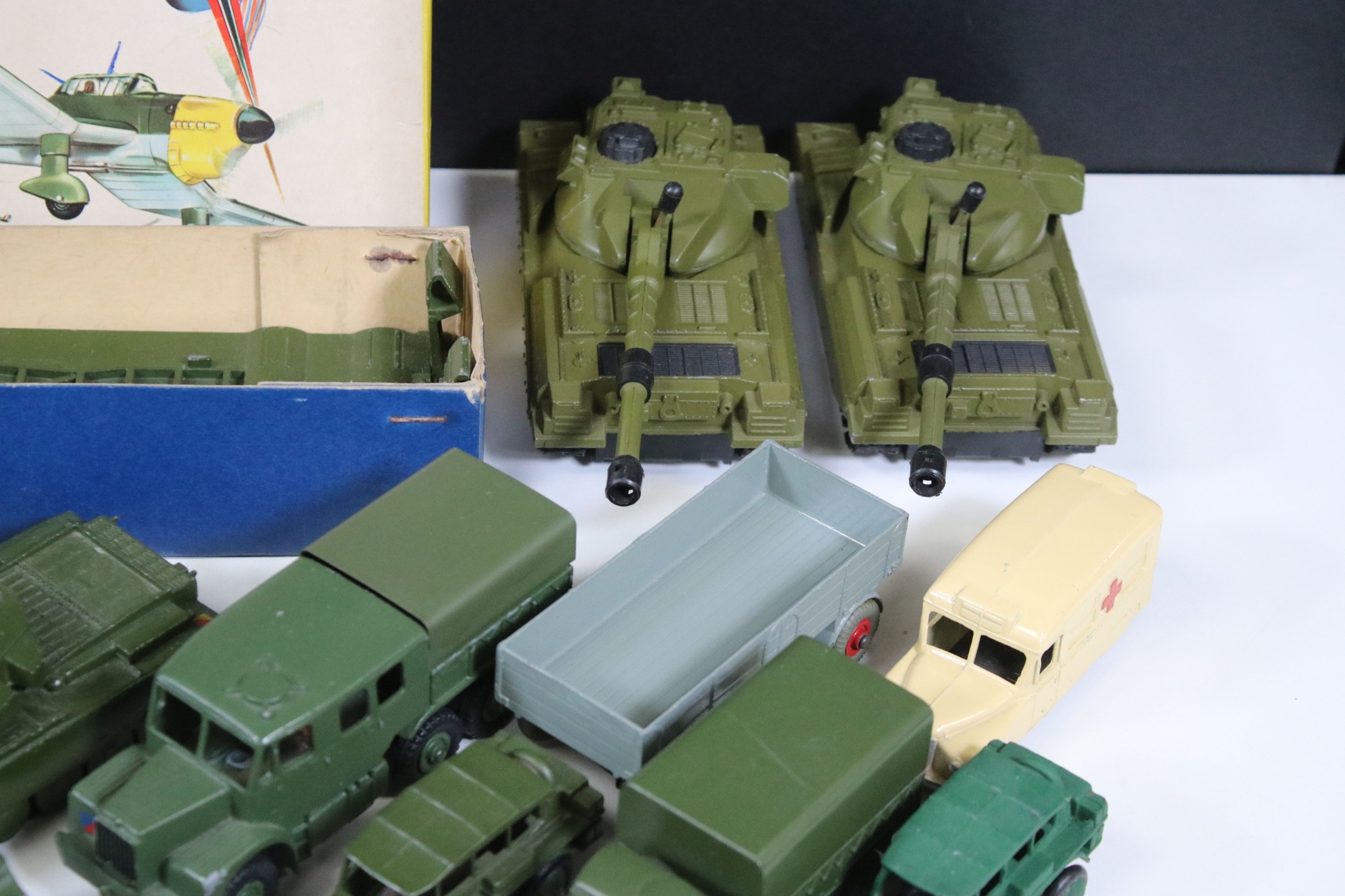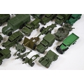 Around 35 Mid 20th C onwards military diecast models to include Dinky, Britains, etc featuring boxed Britains Royal Artillery 4.5' Howitzer Muzzle Loading, boxed Dinky 721 Battle Of Britain Junkers Ju 87B Stuka, Dinky 689 Medium Artillery Tractor, Dinky 621 3 Ton Army Wagon, Dinky Chieftain Tank 155mm Mobile Gun, Dinky 623 Army Wagon, etc, all showing varying amounts of playwear from vg-fair, all boxes have tatty end flaps and signs of storage and edge wear throughout