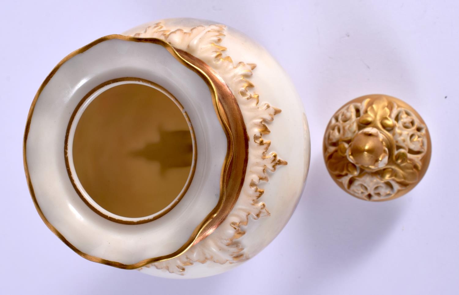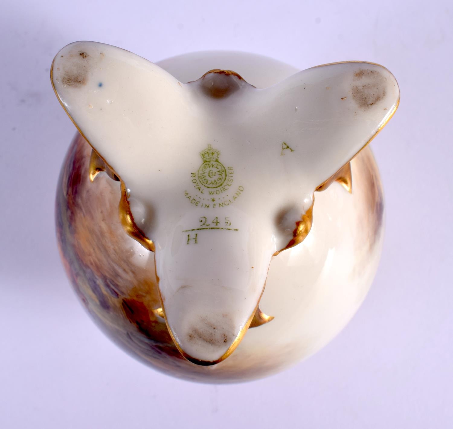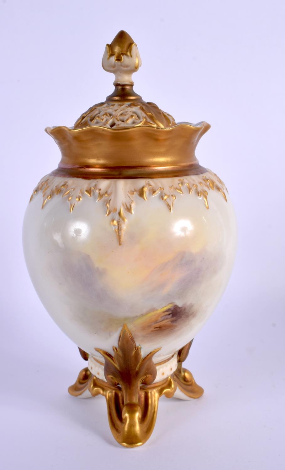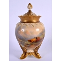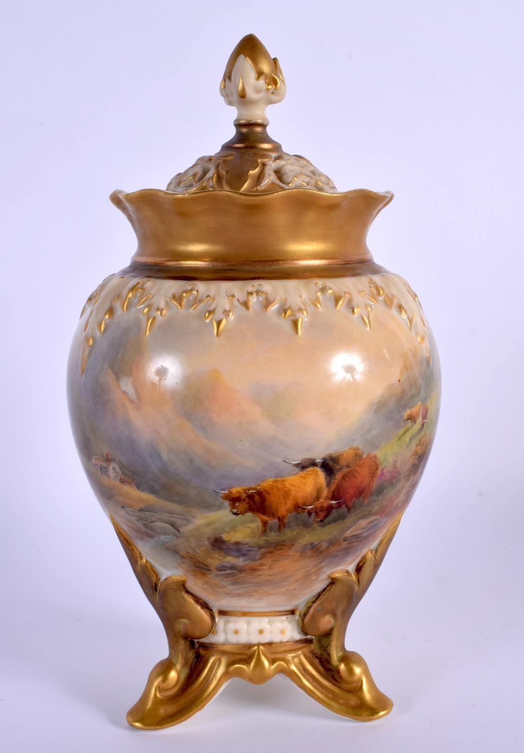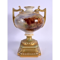 A ROYAL WORCESTER PORCELAIN VASE AND COVER by James Stinton, painted with highland cattle. 19 cm x 7 cm.