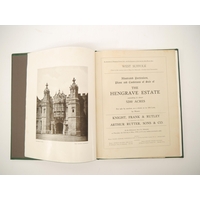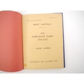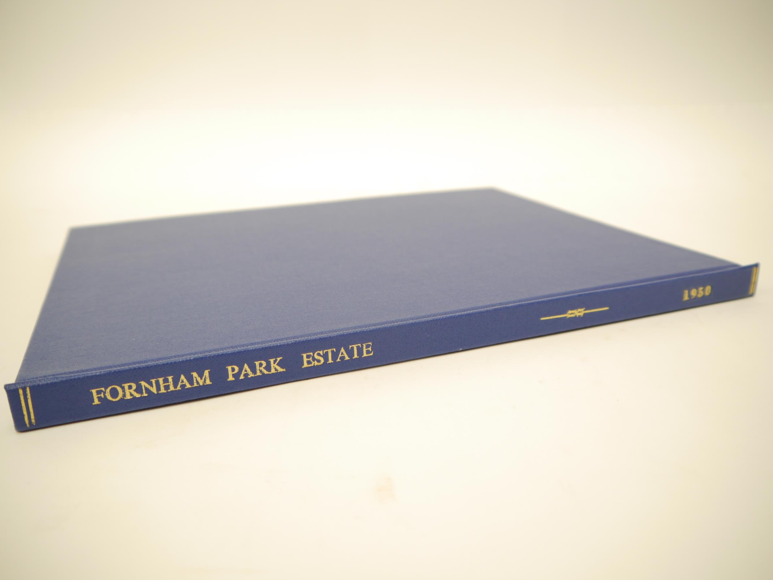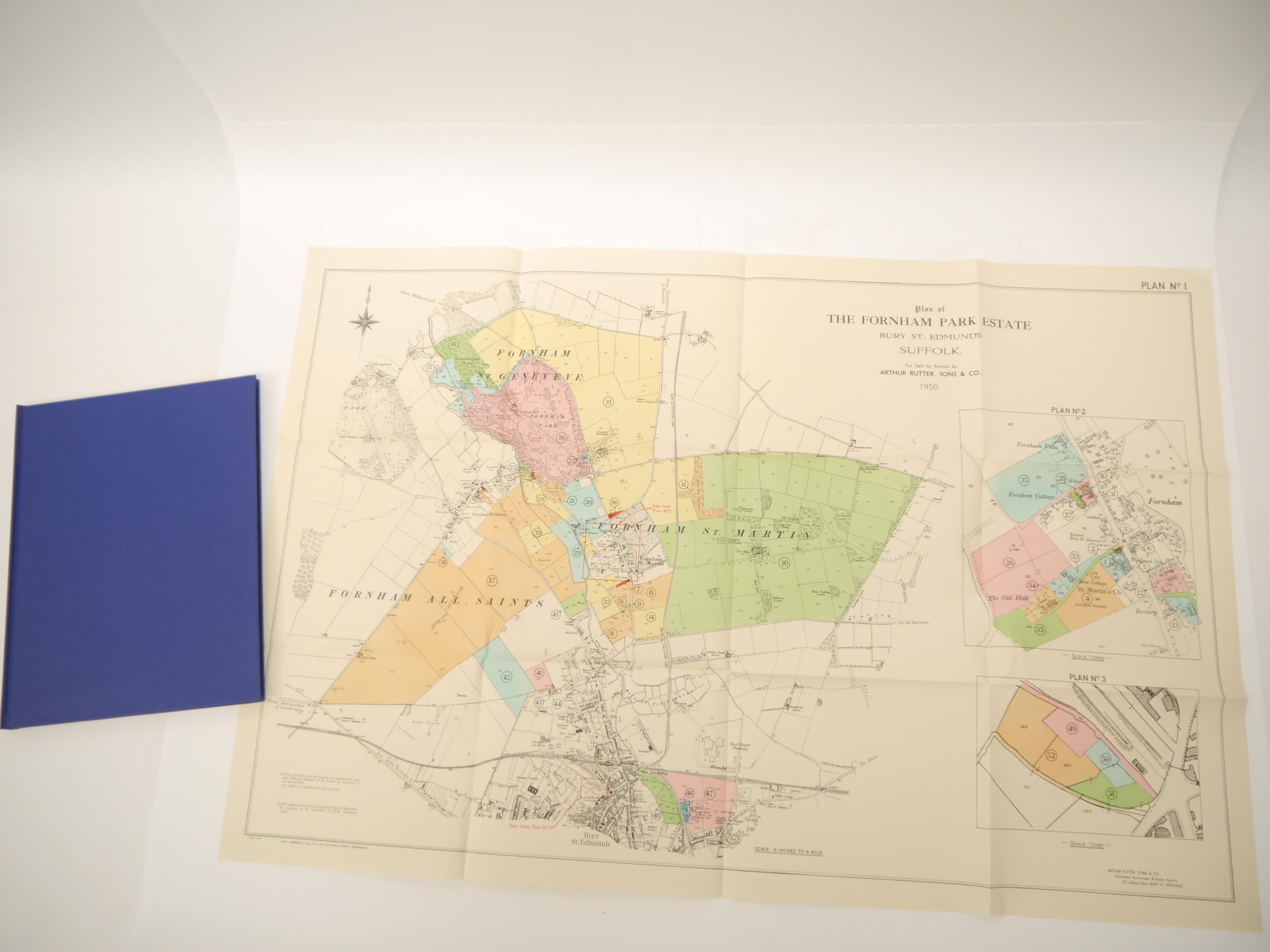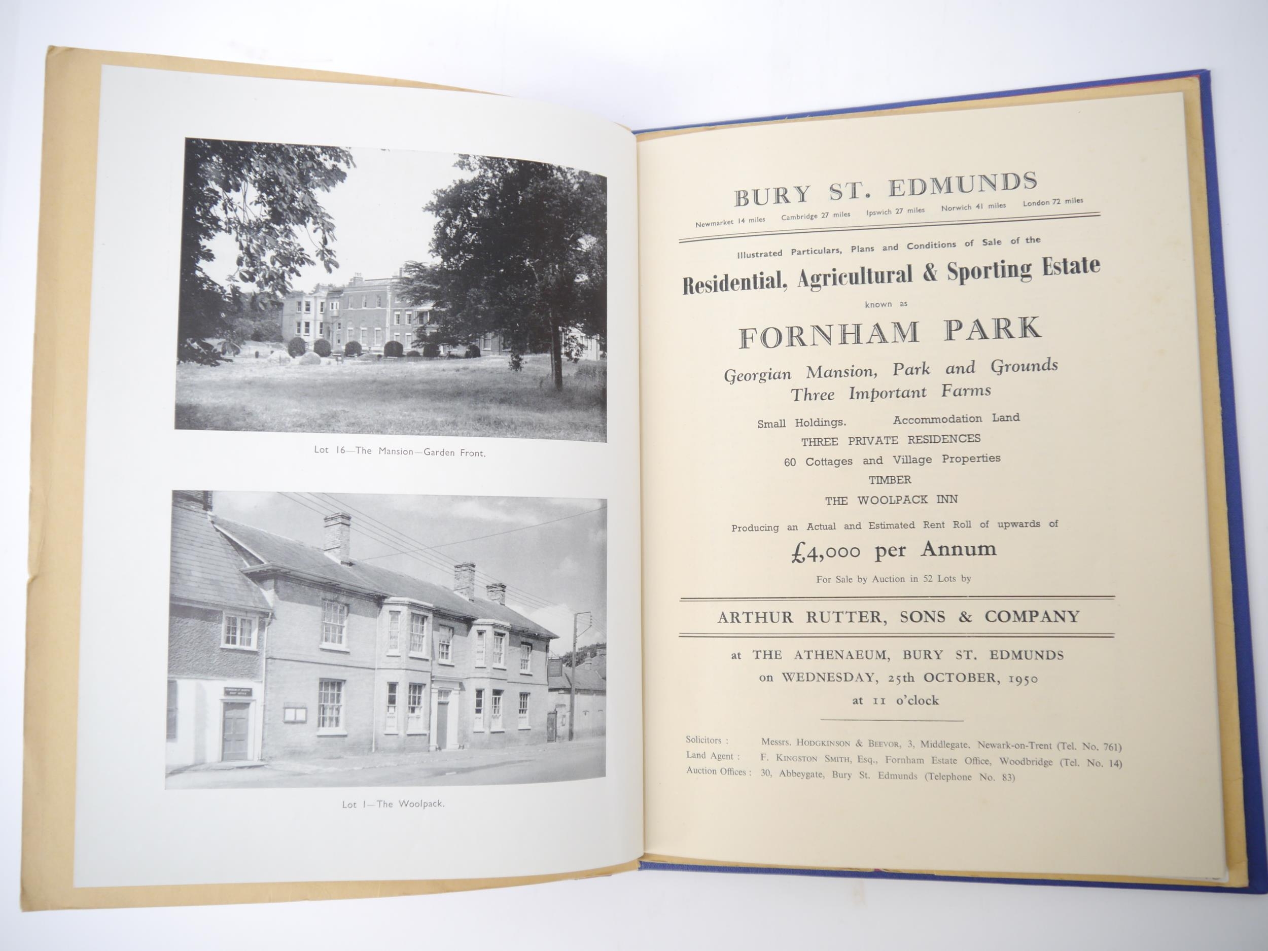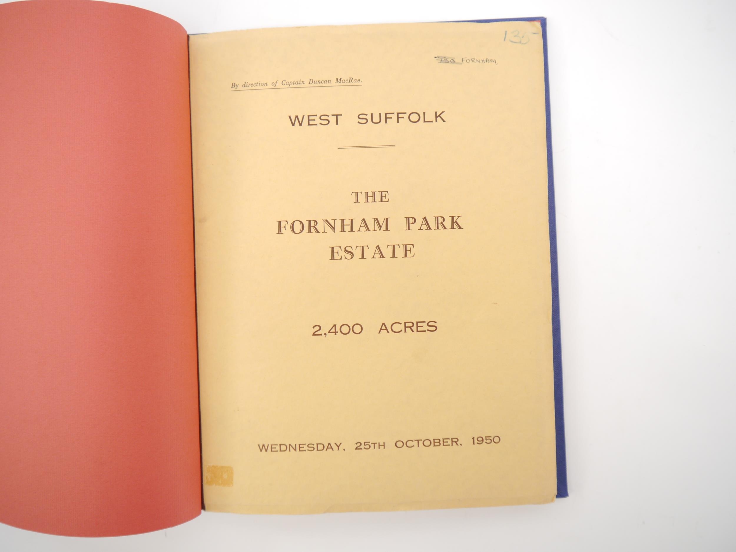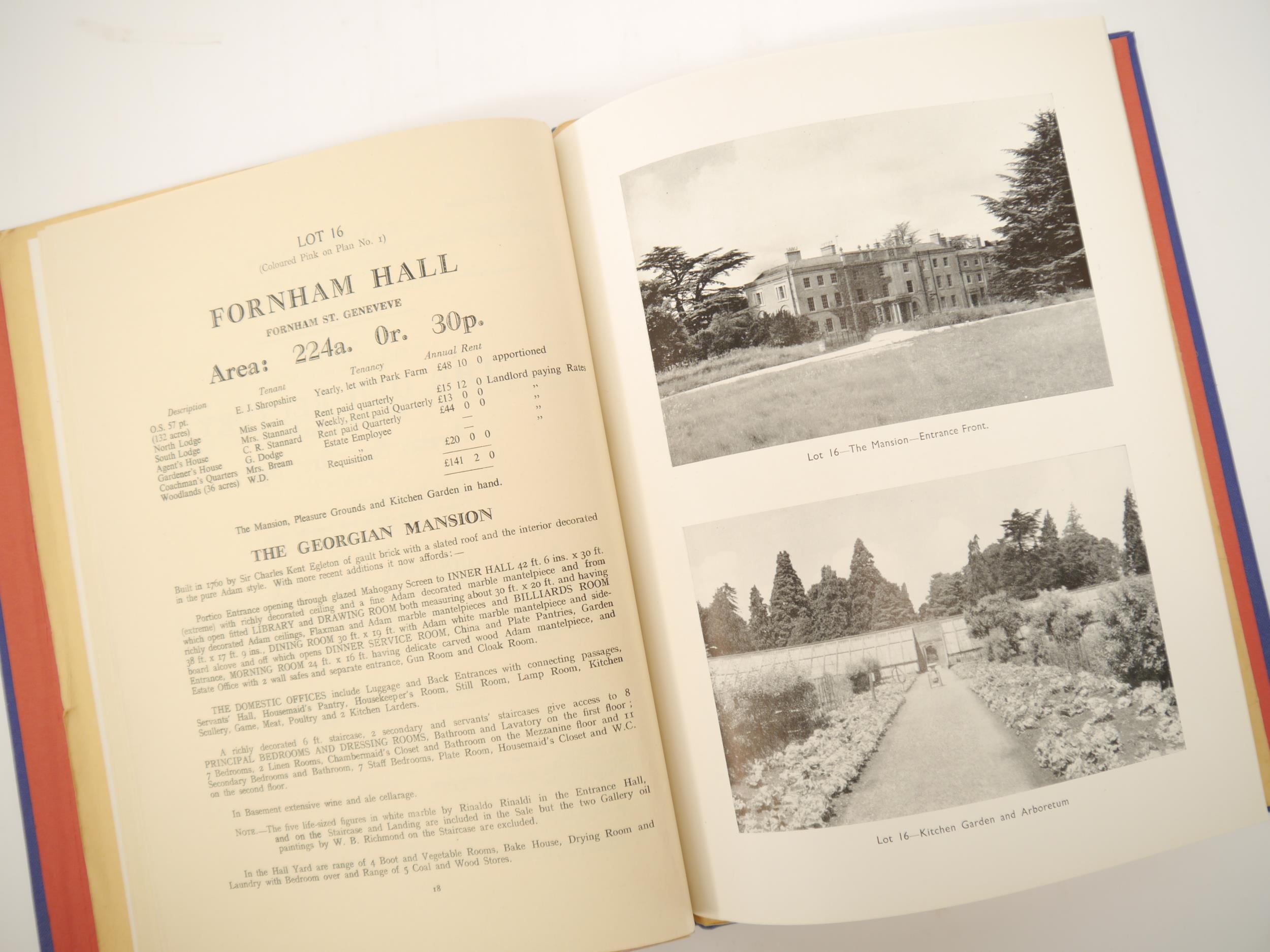 'West Suffolk - The Fornham Park Estate', 1950 sale particulars, "of the Residential, Agricultural & Sporting Estate known as Fornham Park, Georgian Mansion, Park & Grounds, Three Important Farms, Small Holdings...Three Private Residences, 60 Cottages and Village Properties, Timber, The Woolpack Inn", 46,[1]pp catalogue, 10 illustrations from photos on 5 full page plates as called for, plus large folding colour estate plan in rear pocket as called for, the whole catalogue encompassing property and land in Fornham St Martin, Fornham St Geneveve, Fornham All Saints & Bury St Edmunds, by direction of Captain Duncan MacRae, ex Ipswich and East Suffolk Record Office, and Richard Thurlow, Ipswich, Suffolk, with both of their bookplates/labels, original printed wraps, bound into modern blue cloth gilt