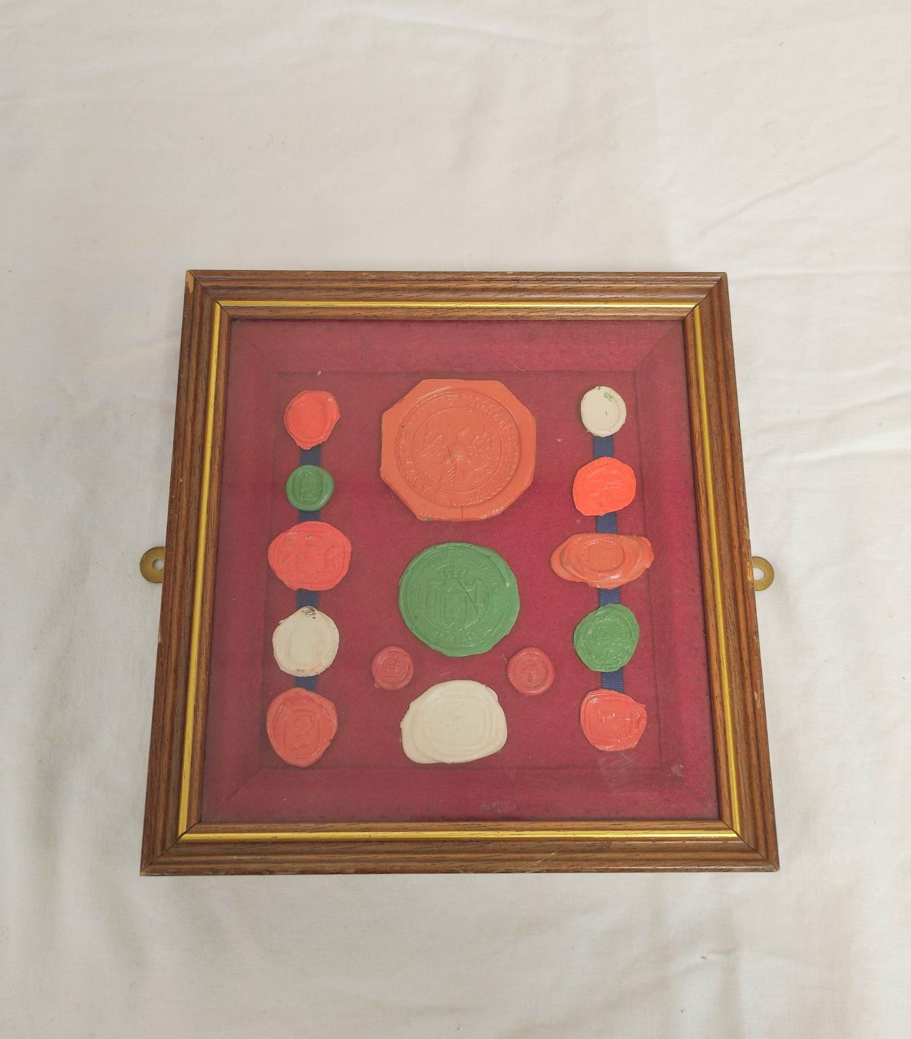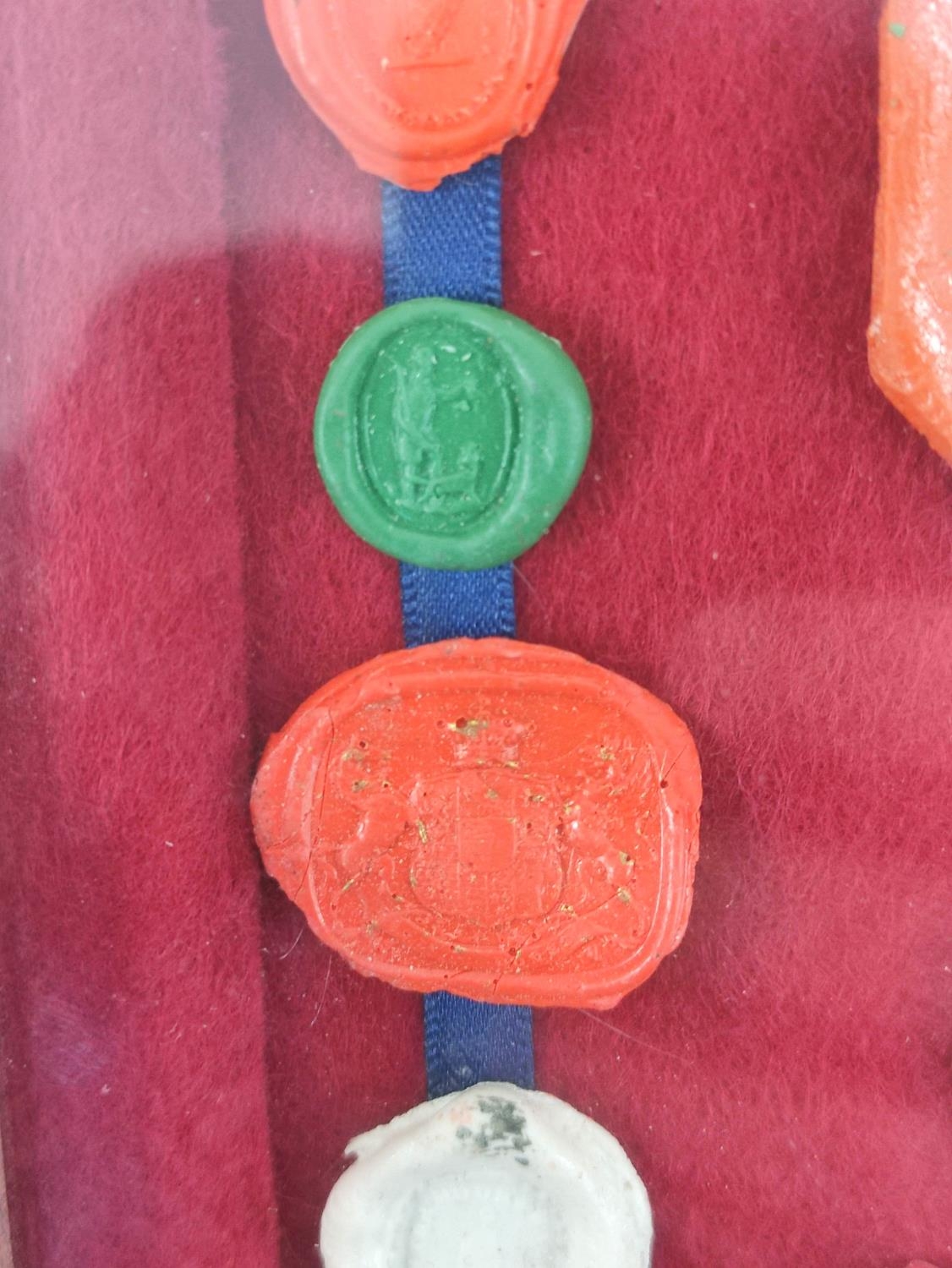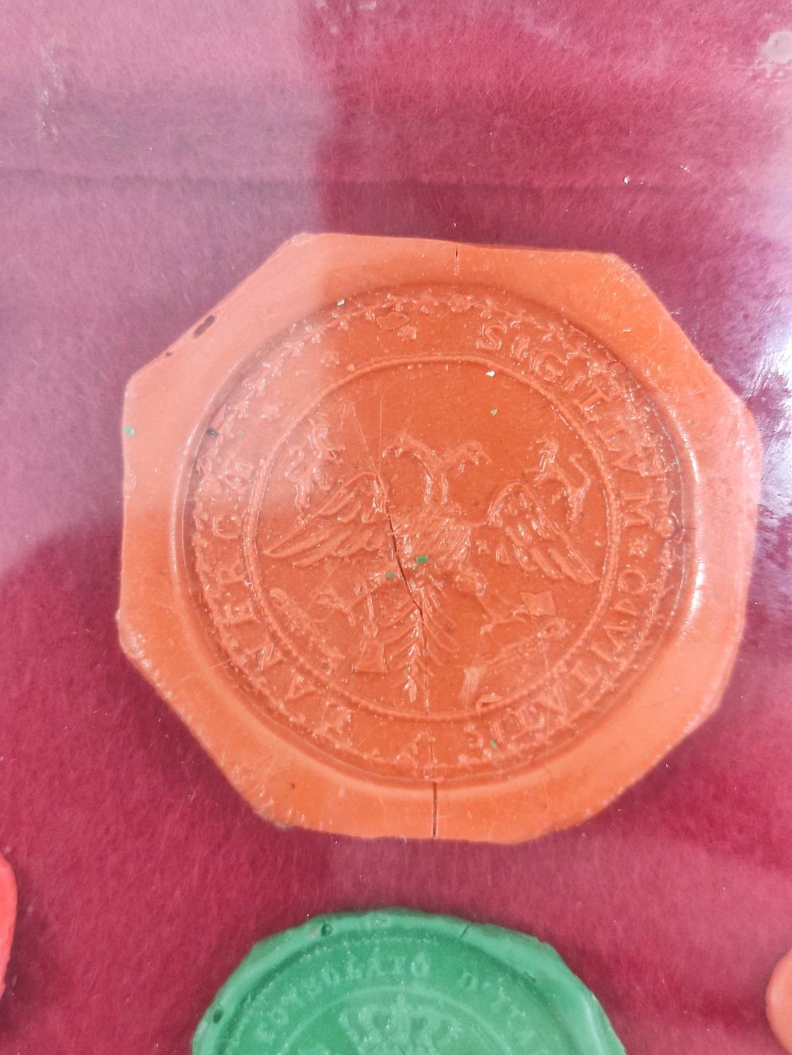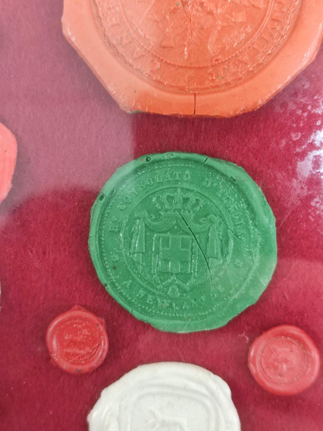 Fifteen framed 18th & 19th century wax postage seals to include a city seal (possibly Prussian) featuring a twin headed eagle flanked by dogs and an Italian consul seal etc.