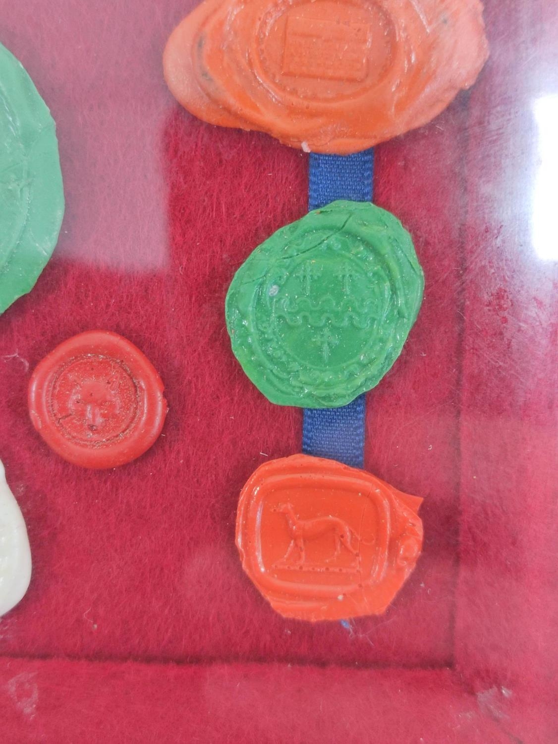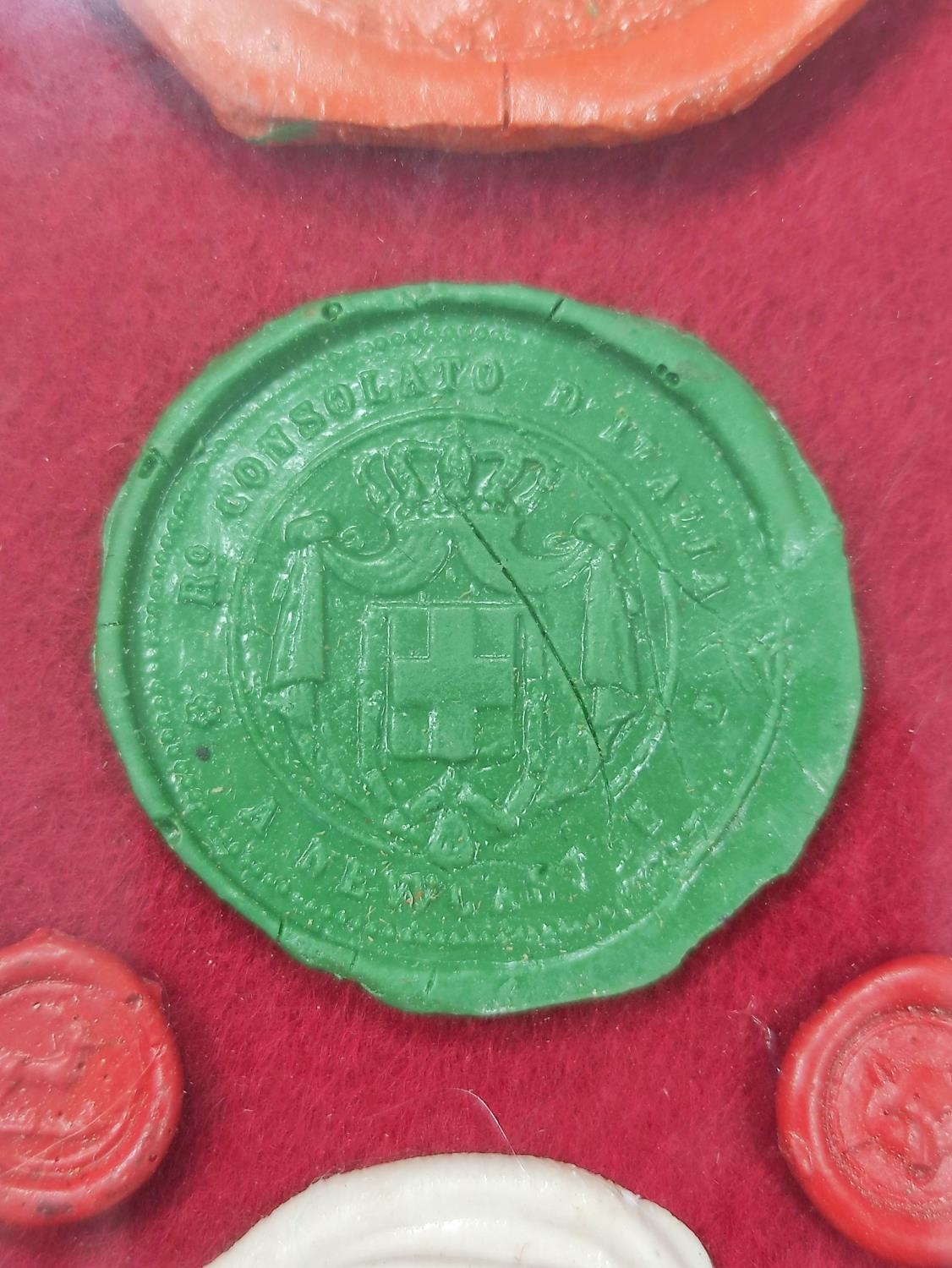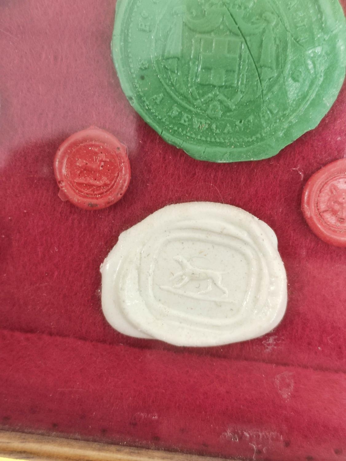 Fifteen framed 18th & 19th century wax postage seals to include a city seal (possibly Prussian) featuring a twin headed eagle flanked by dogs and an Italian consul seal etc.