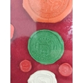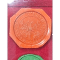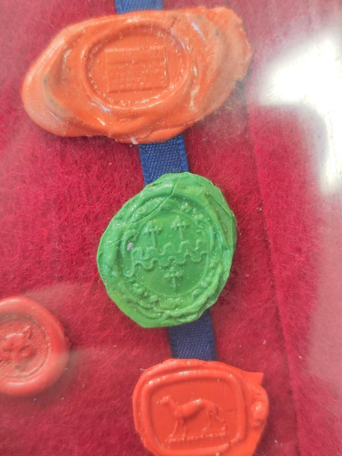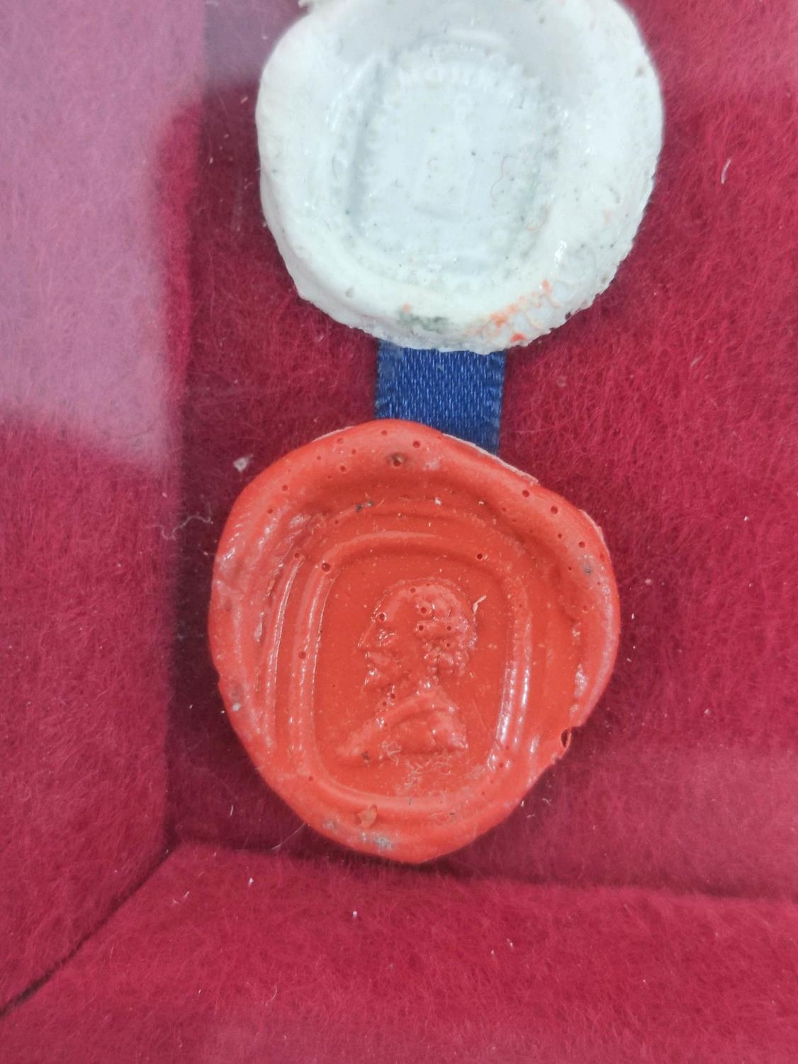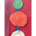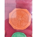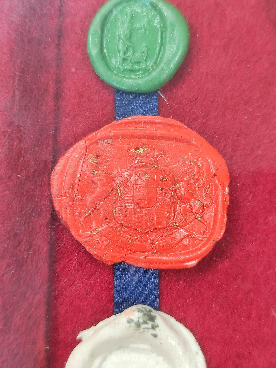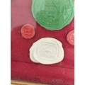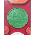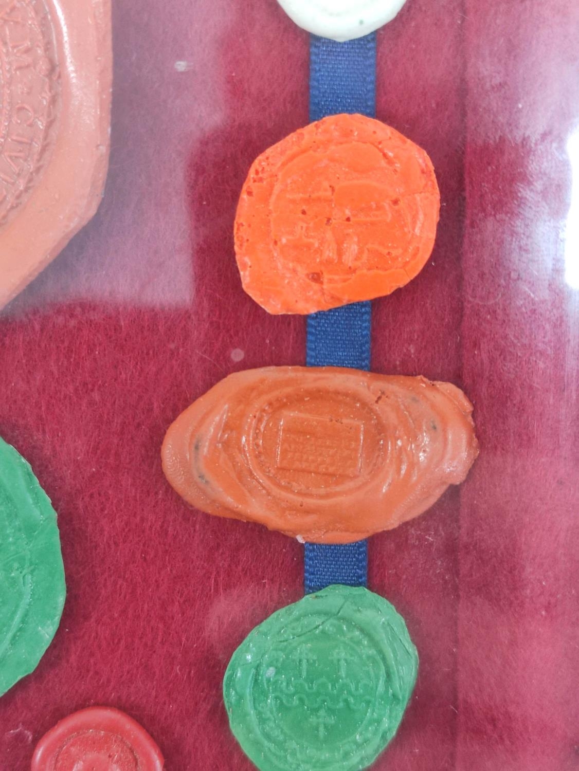 Fifteen framed 18th & 19th century wax postage seals to include a city seal (possibly Prussian) featuring a twin headed eagle flanked by dogs and an Italian consul seal etc.
