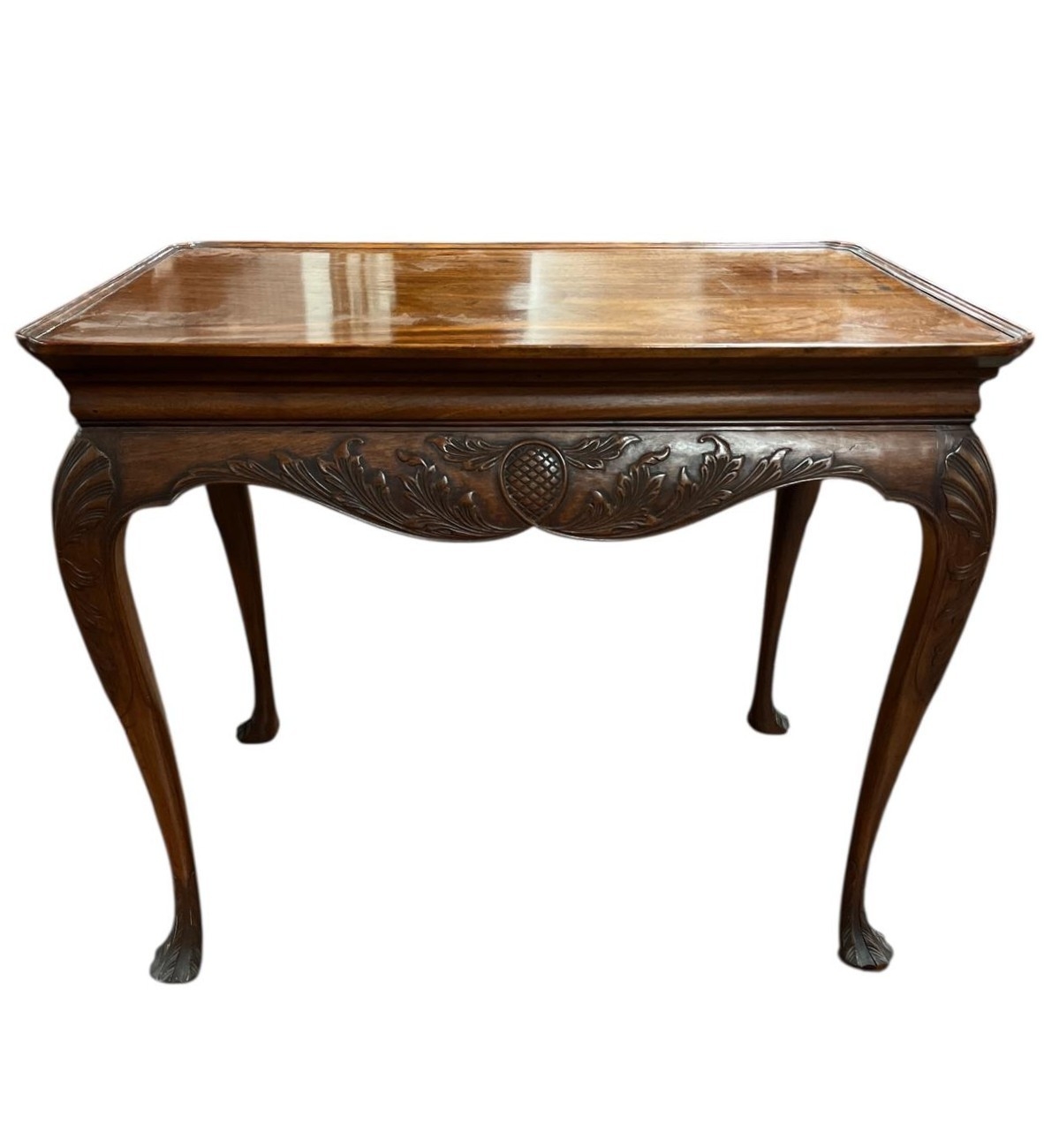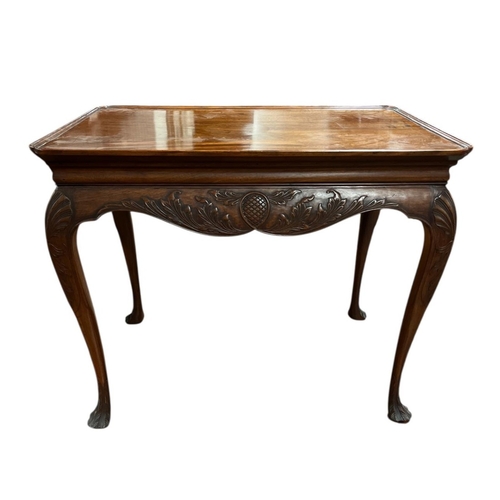 A GOOD GEORGIAN STYLE MAHOGANY SILVER TABLE the rectangular dish top above a foliate carved apron on carved cabriole legs 72cm (h) x 86cm (w) x 55cm (d)