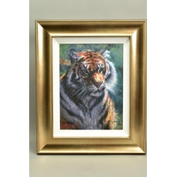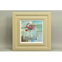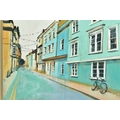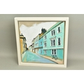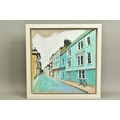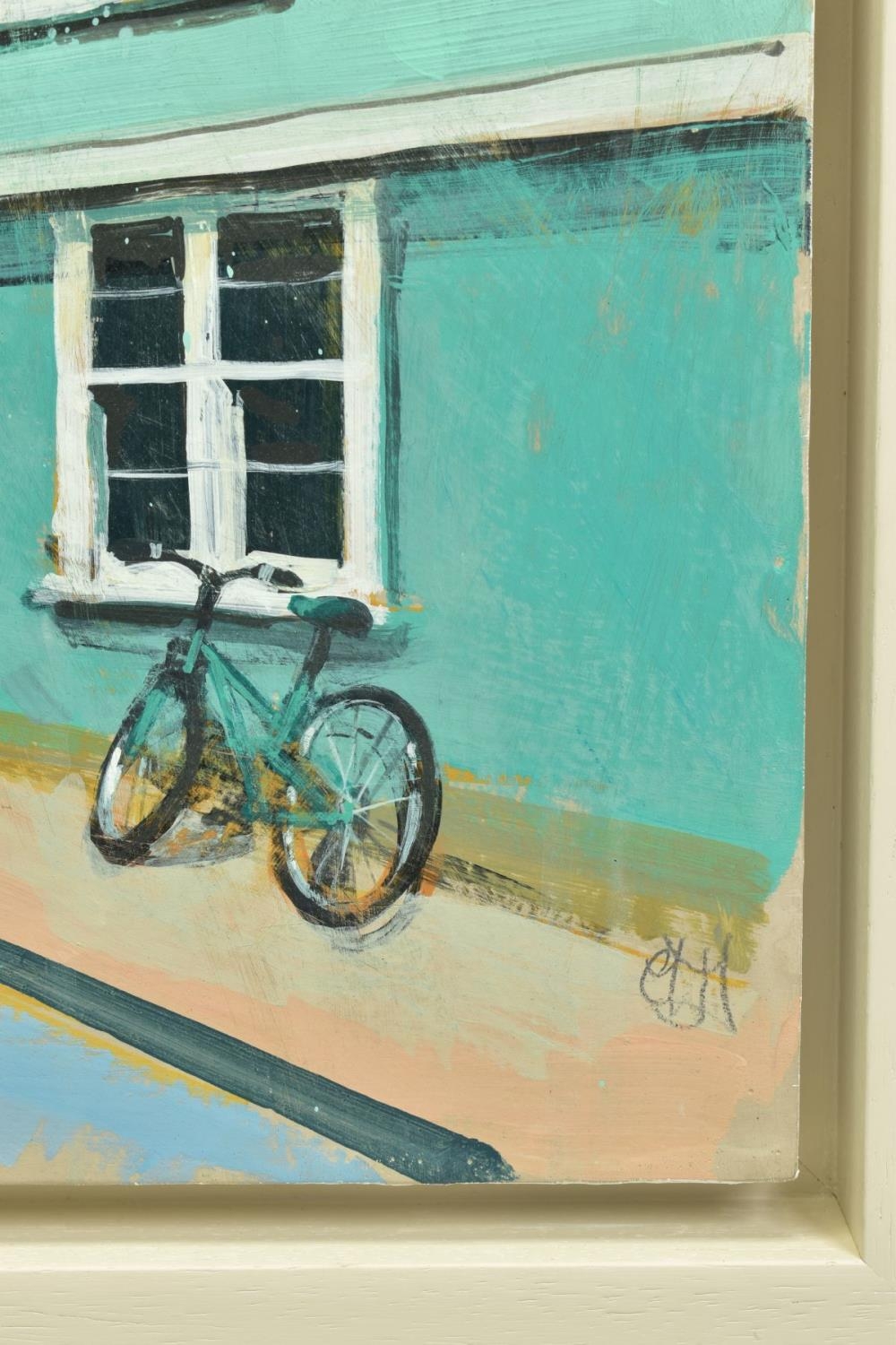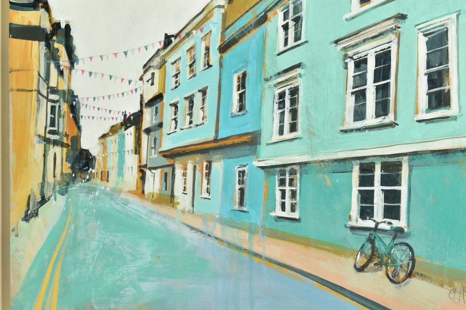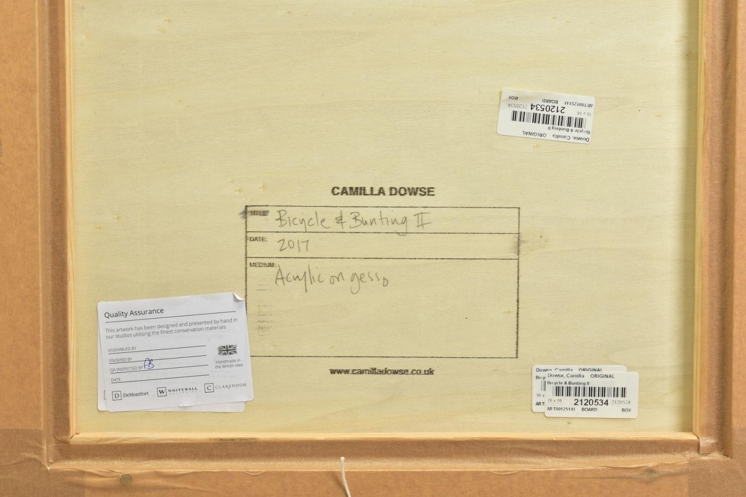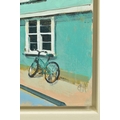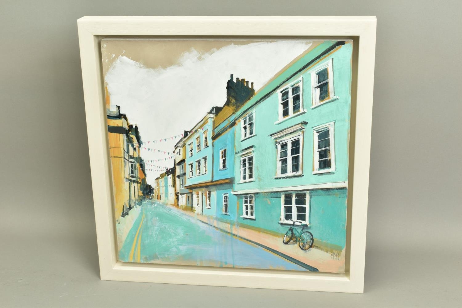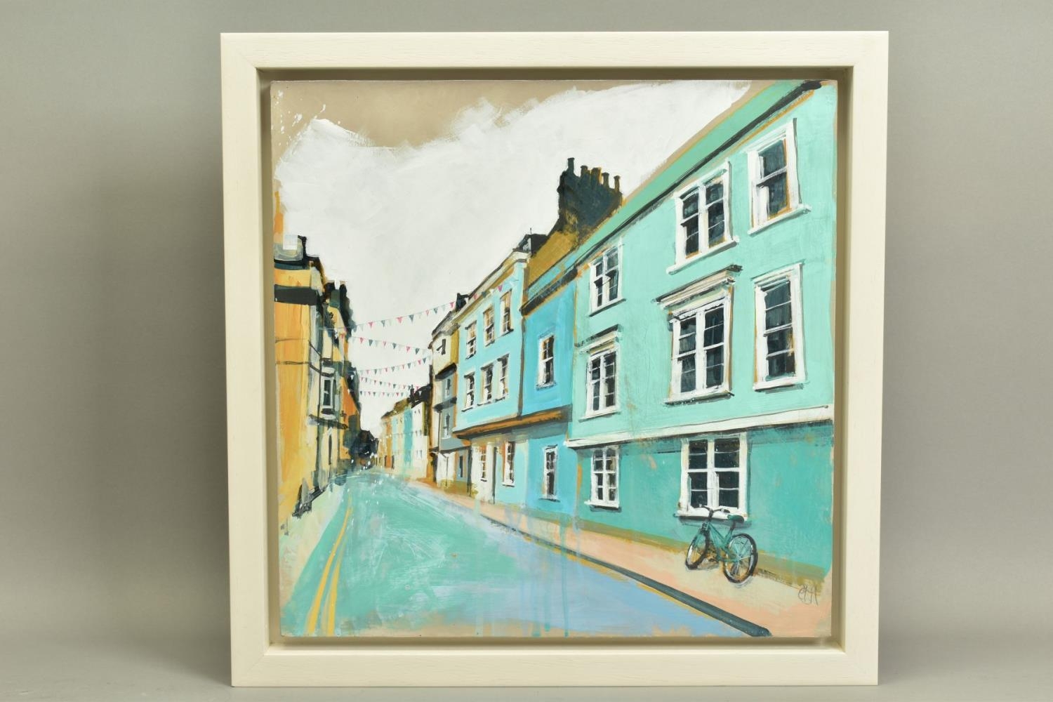 CAMILLA DOWSE (BRITISH 1968), 'Bicycle and Bunting II', a village street scene, initialled bottom left, oil on board, image size approximately 40cm x 40cm, frame size approximately 48cm x 48cm (condition: good condition) (A)