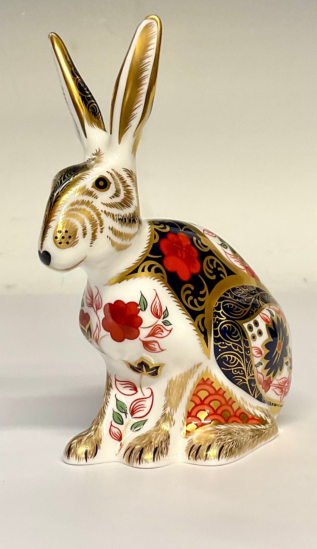 A Royal Crown Derby paperweight, Old Imari Hare, decorated in the 1128 pattern, a limited edition of 500, gold stopper, 13cm high, printed mark in red