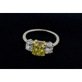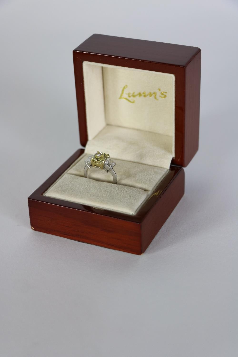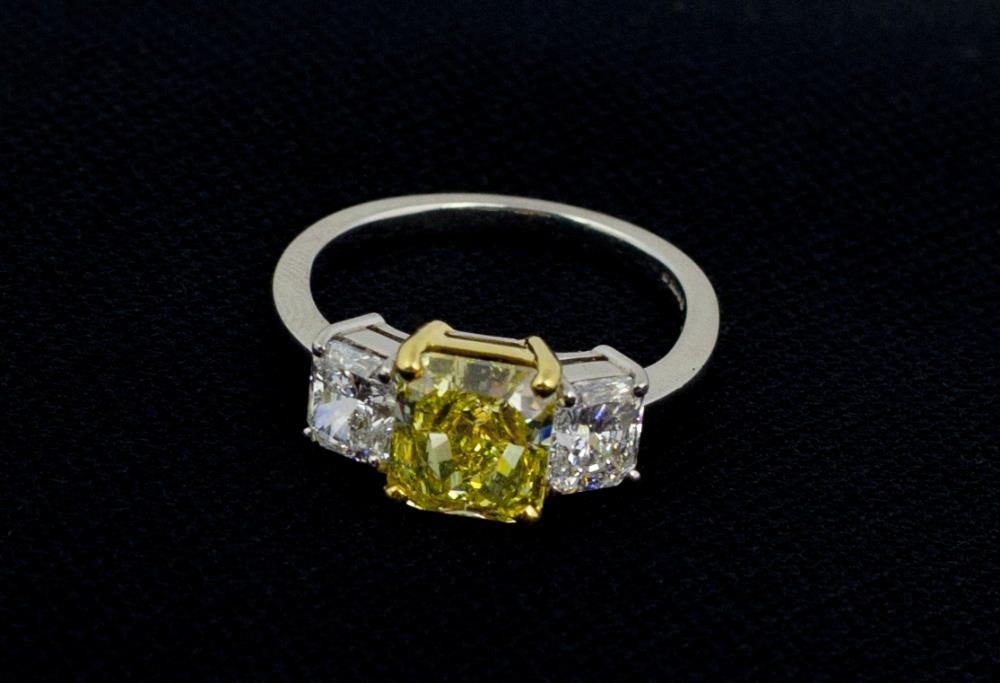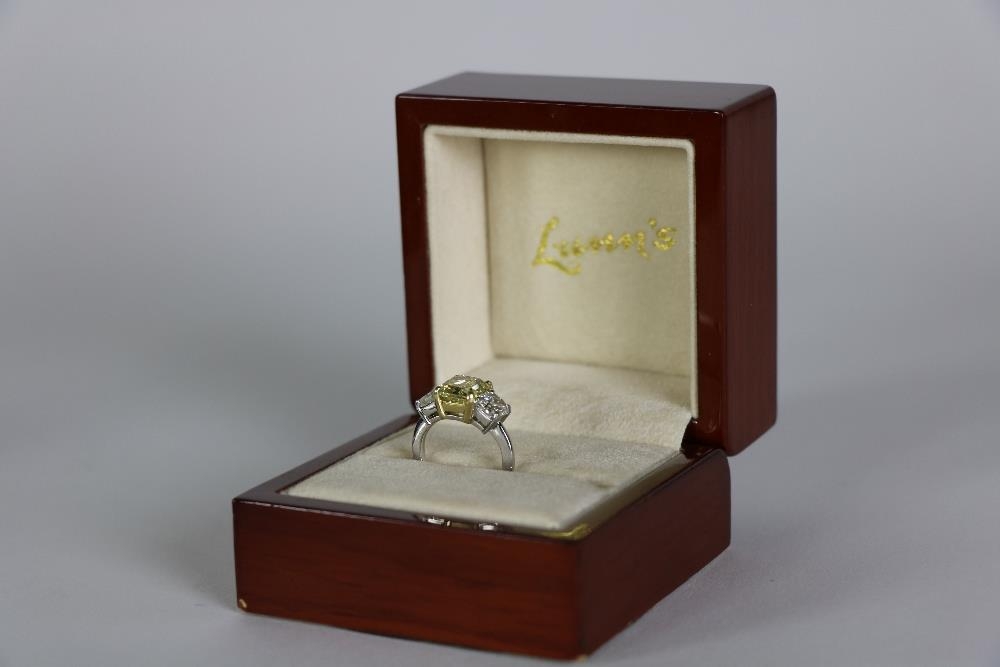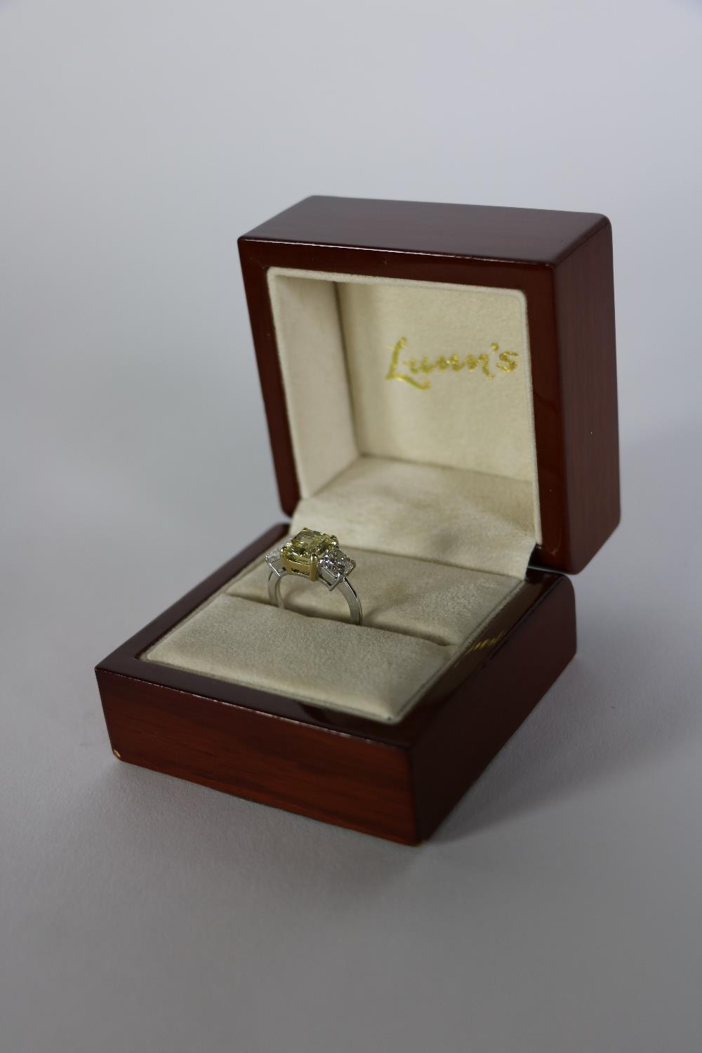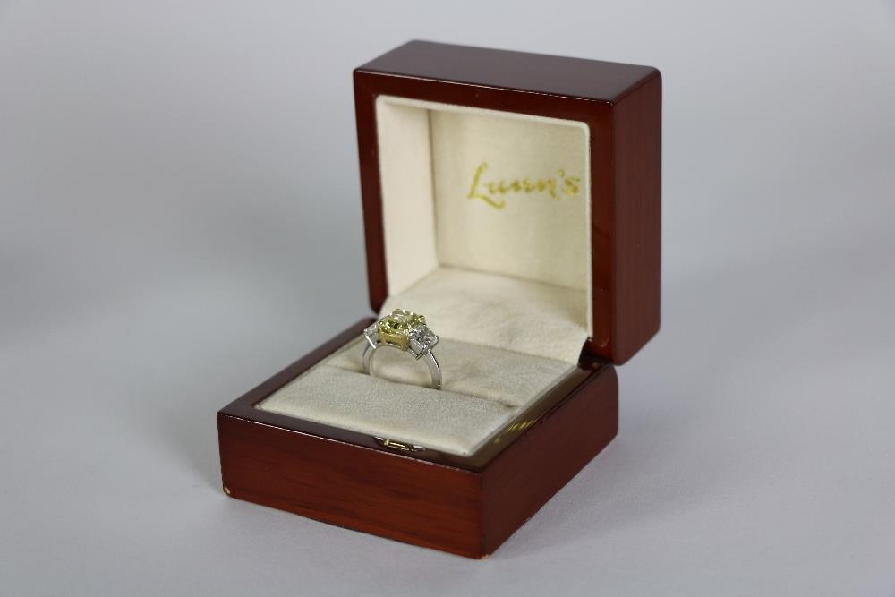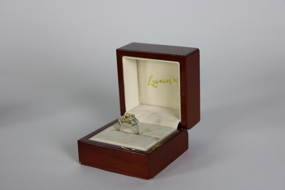 An exquisite 3 stone diamond Ring, by Lunns of Belfast, with 2.93ct fancy intense yellow centre stone (VS2) flanked by two radiant cut diamonds, each 1ct, one D colour and clarity VS2, the second E colour and SI1 clarity, all set in a platinum and yellow gold mount. (1)* With Letter of Authenticity and other Documentation. Ring Size J