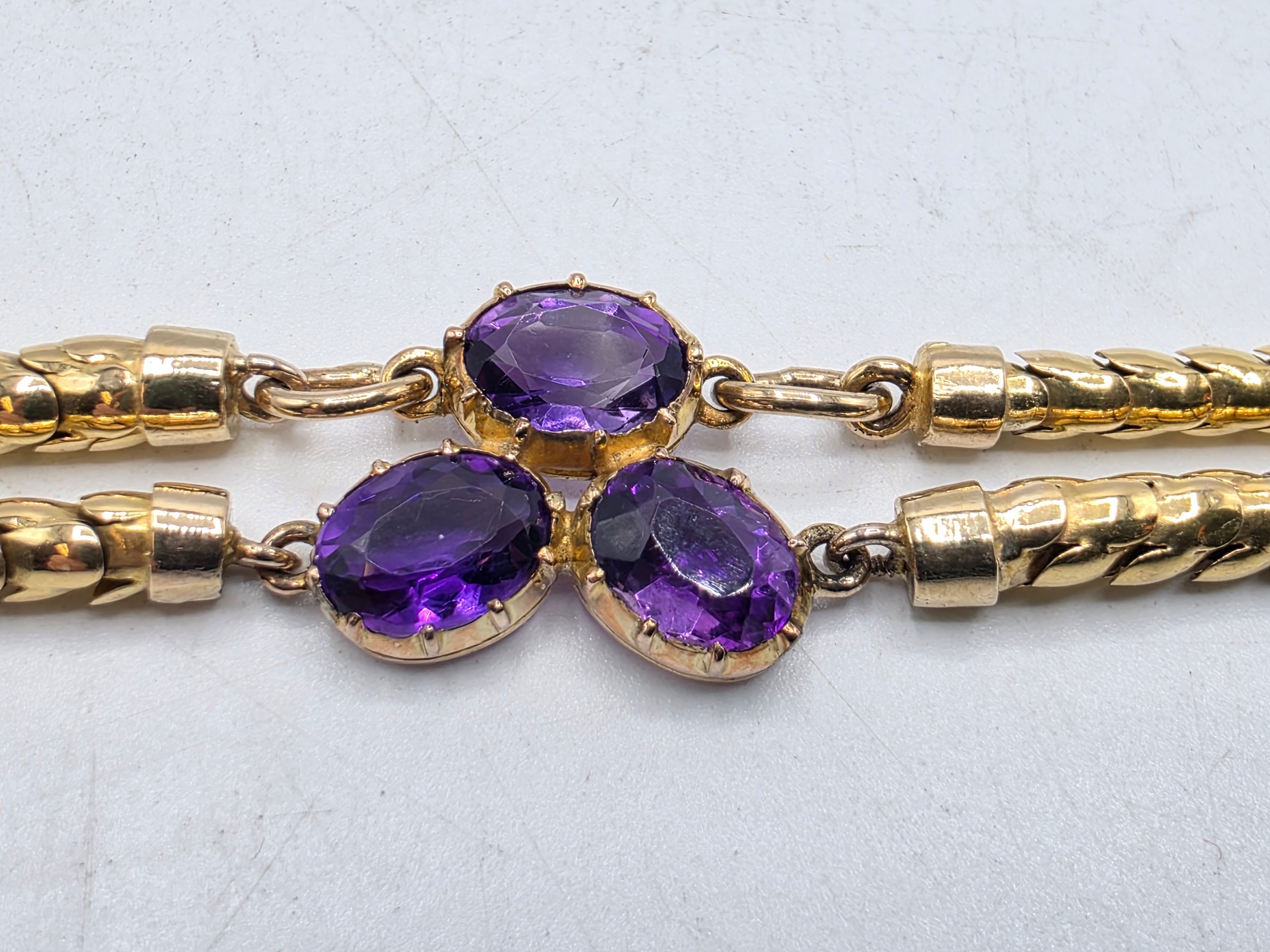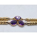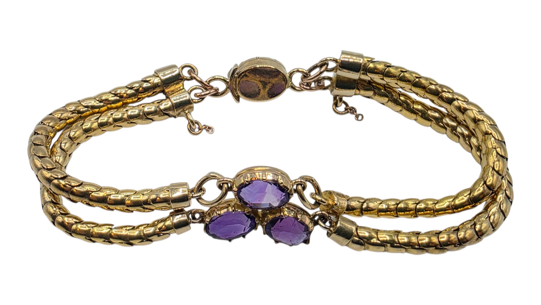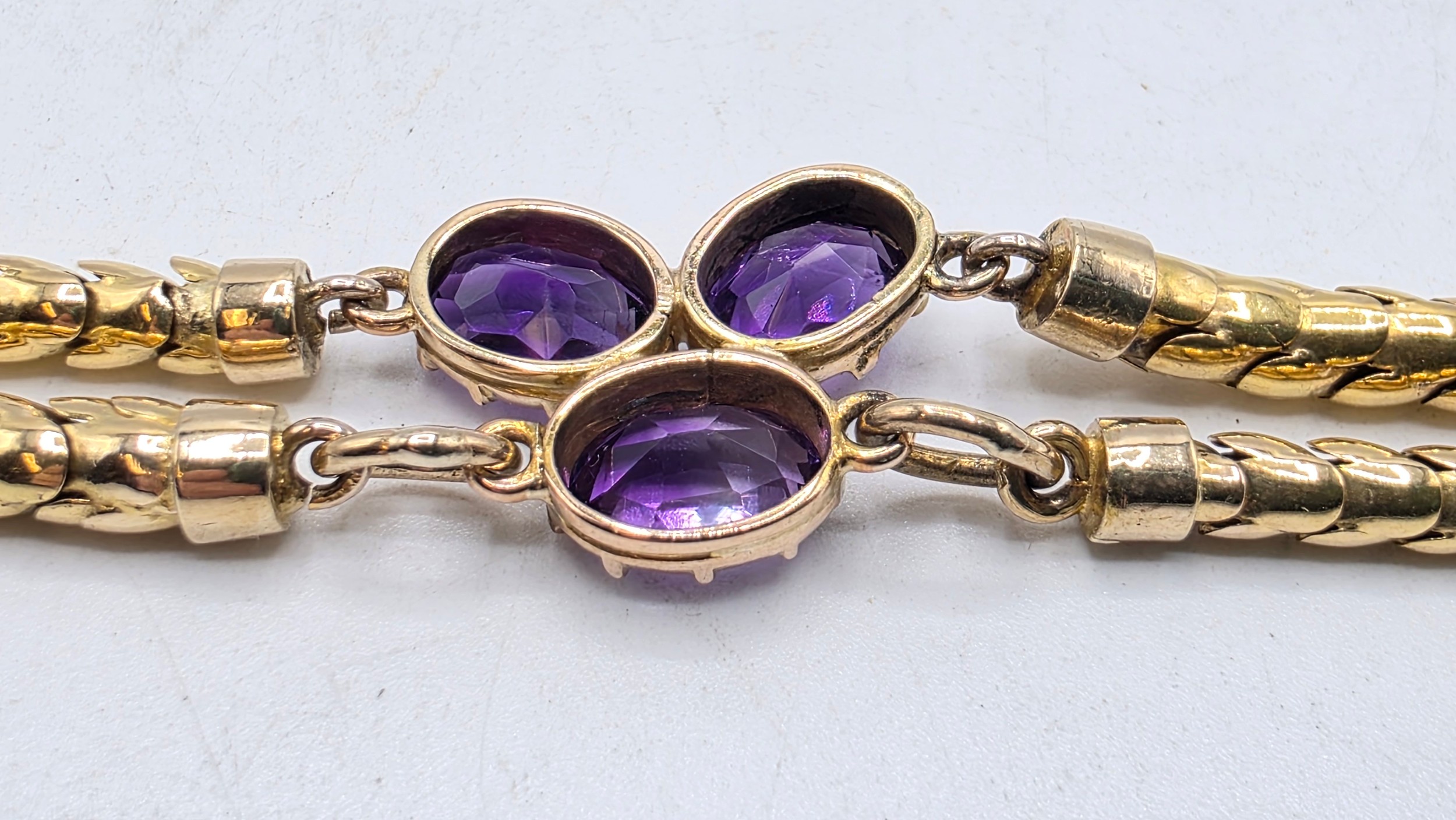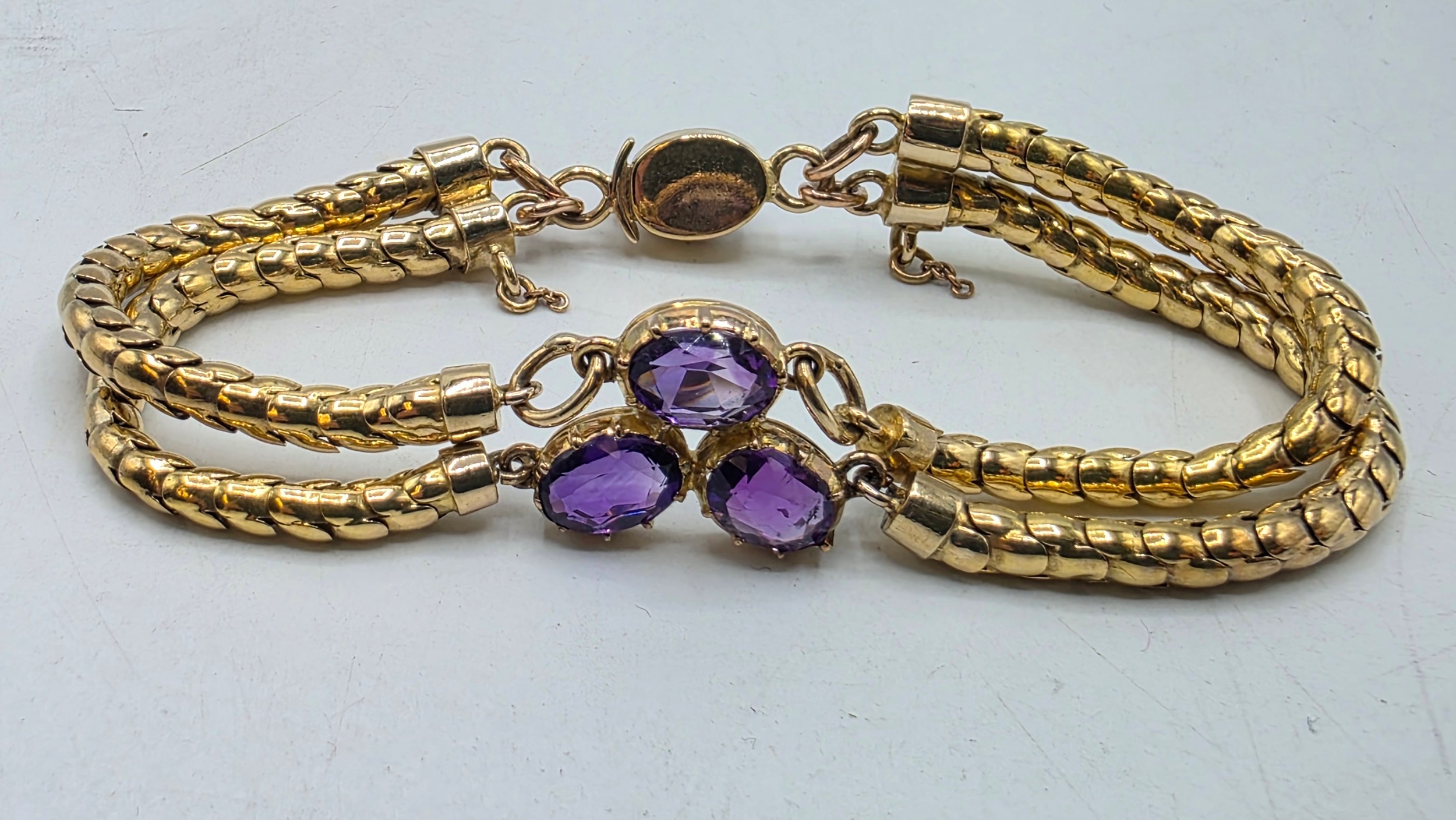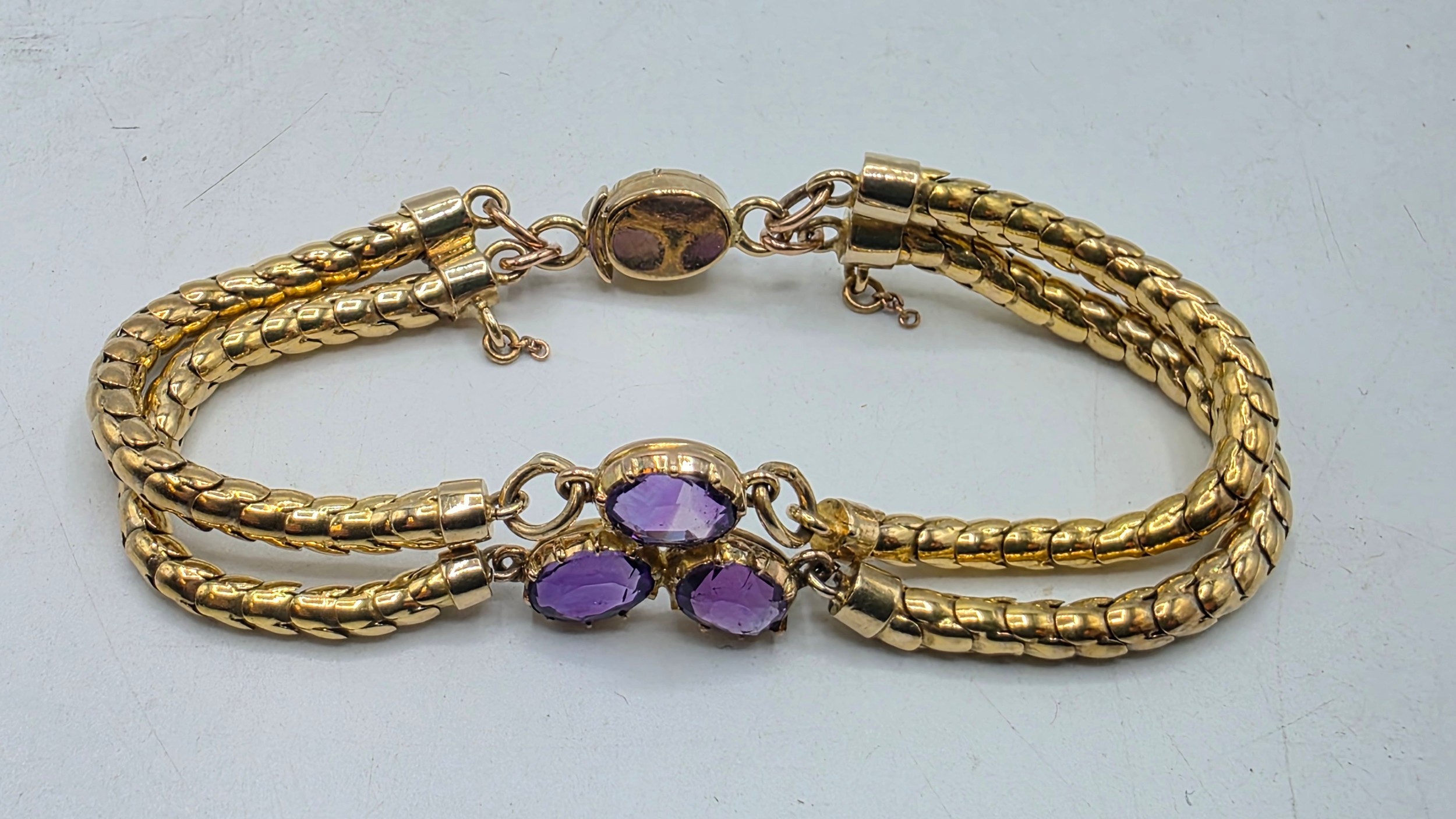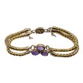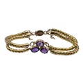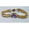 An unmarked yellow metal and amethyst double snake link bracelet set with four free cut oval amethysts. 19cm. 15g.