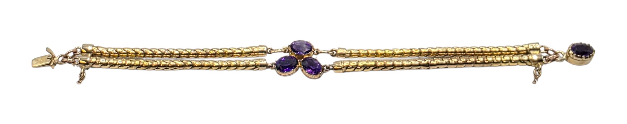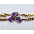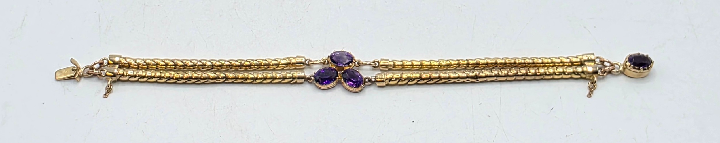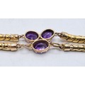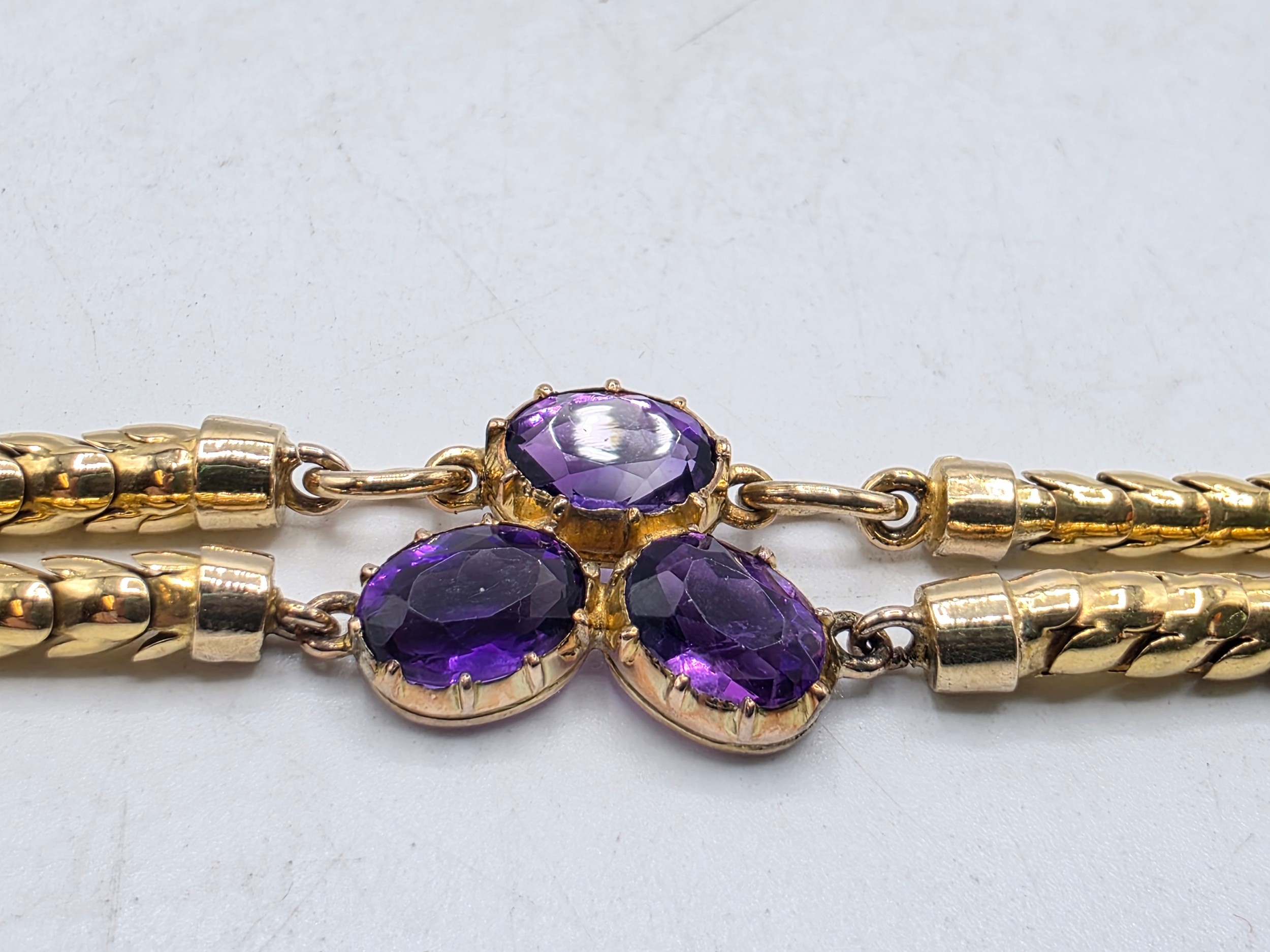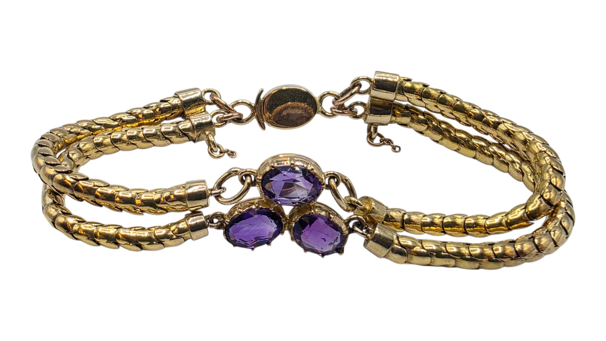 An unmarked yellow metal and amethyst double snake link bracelet set with four free cut oval amethysts. 19cm. 15g.