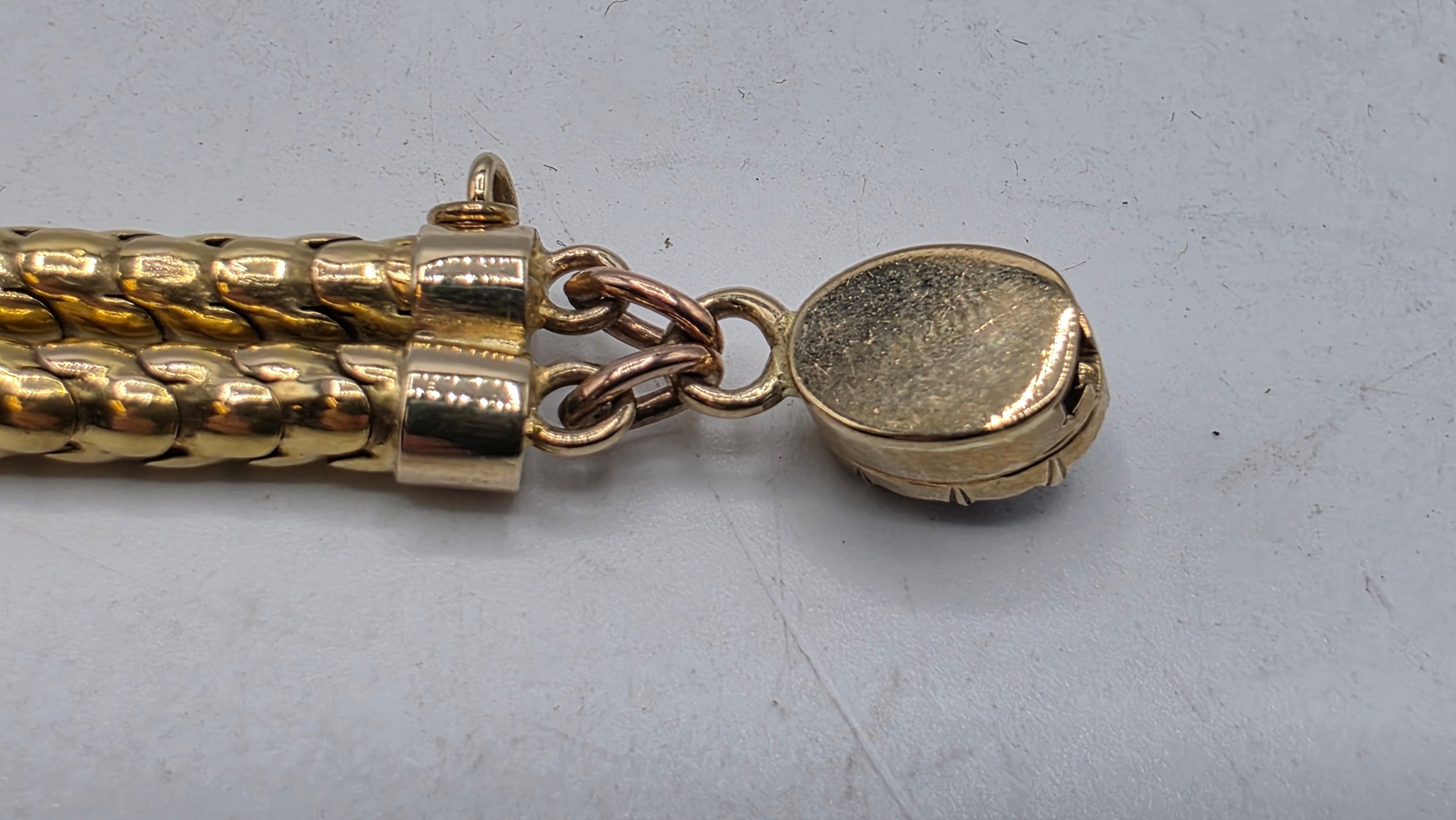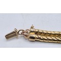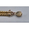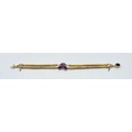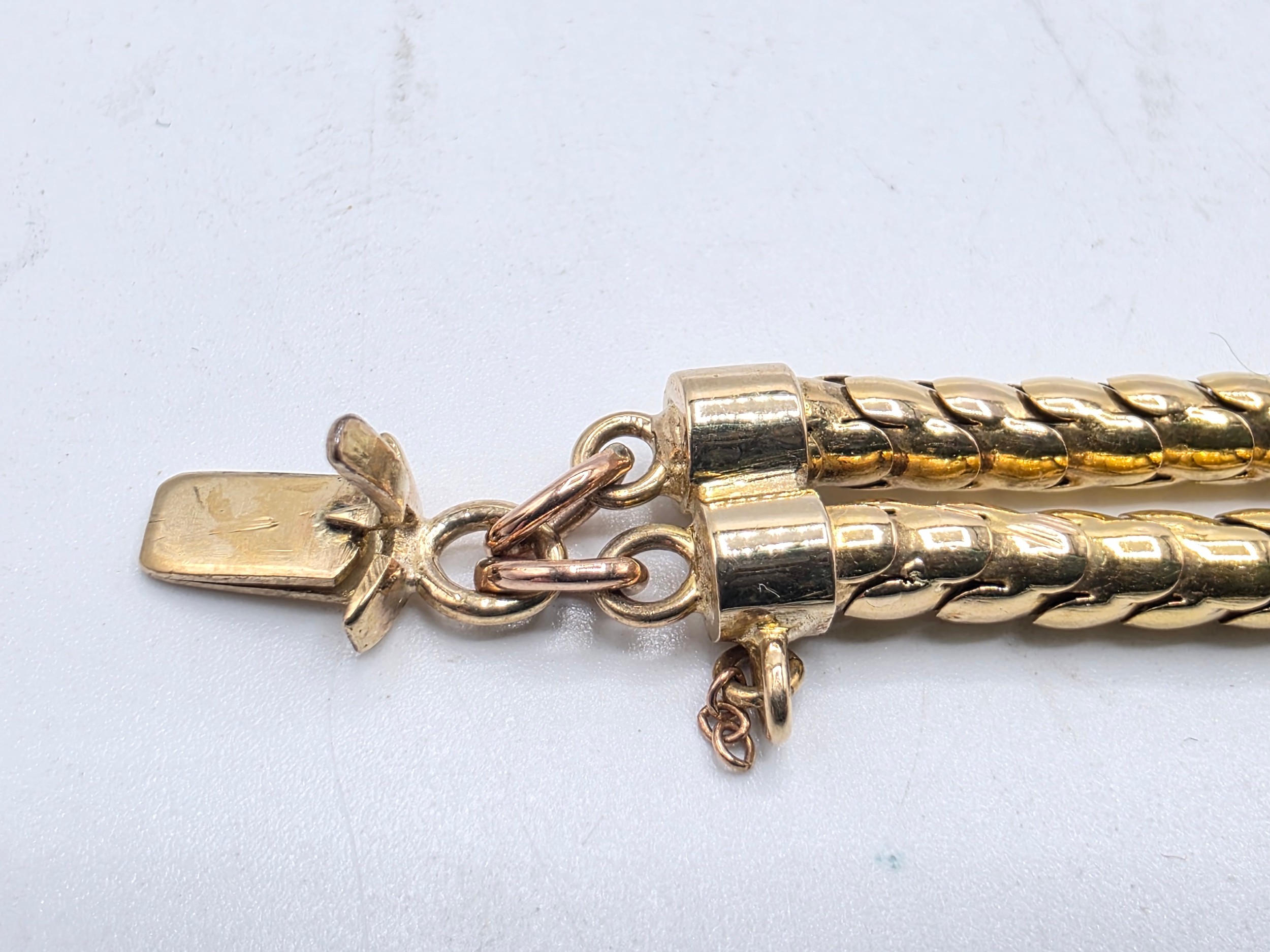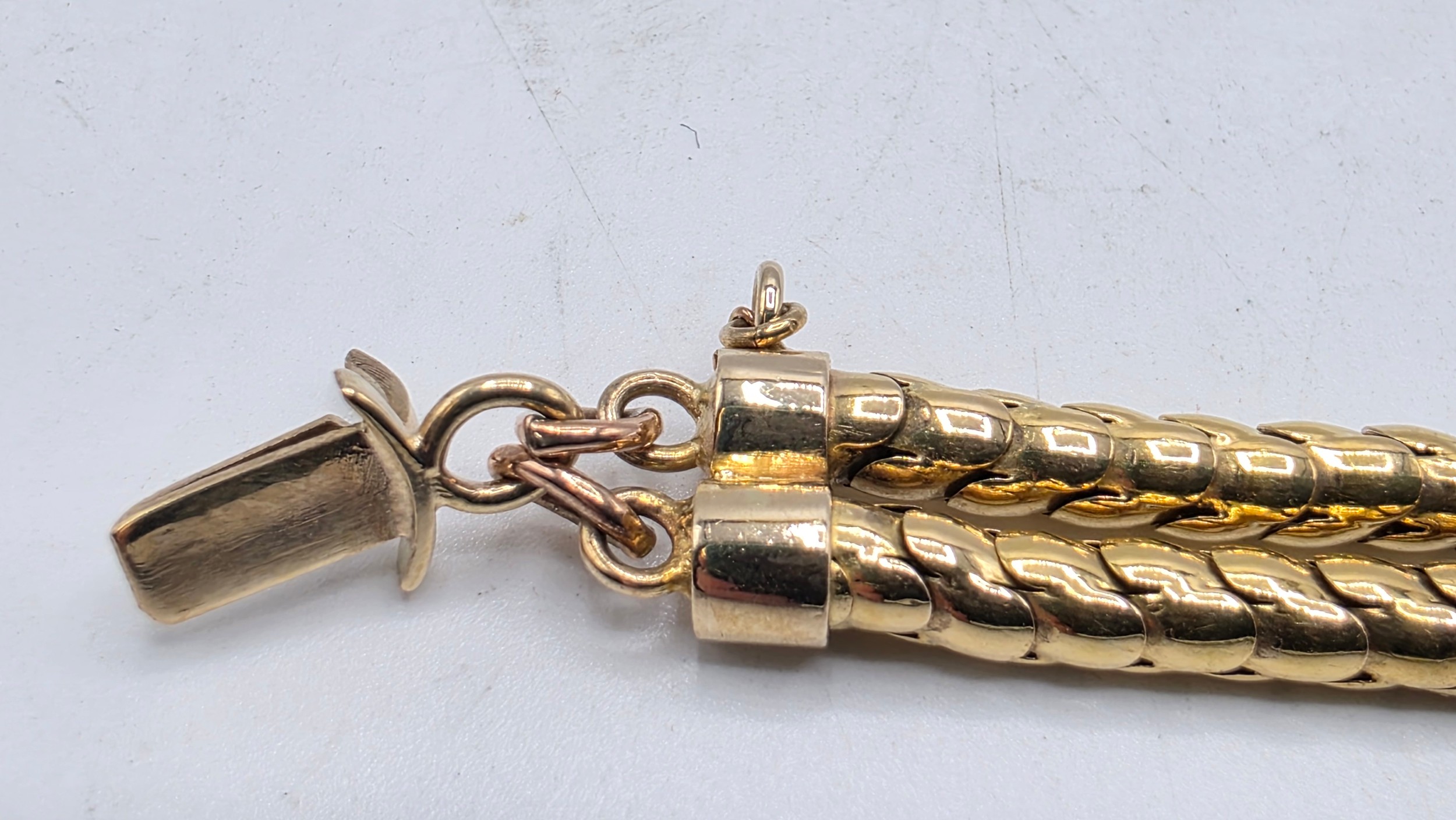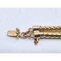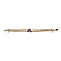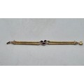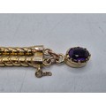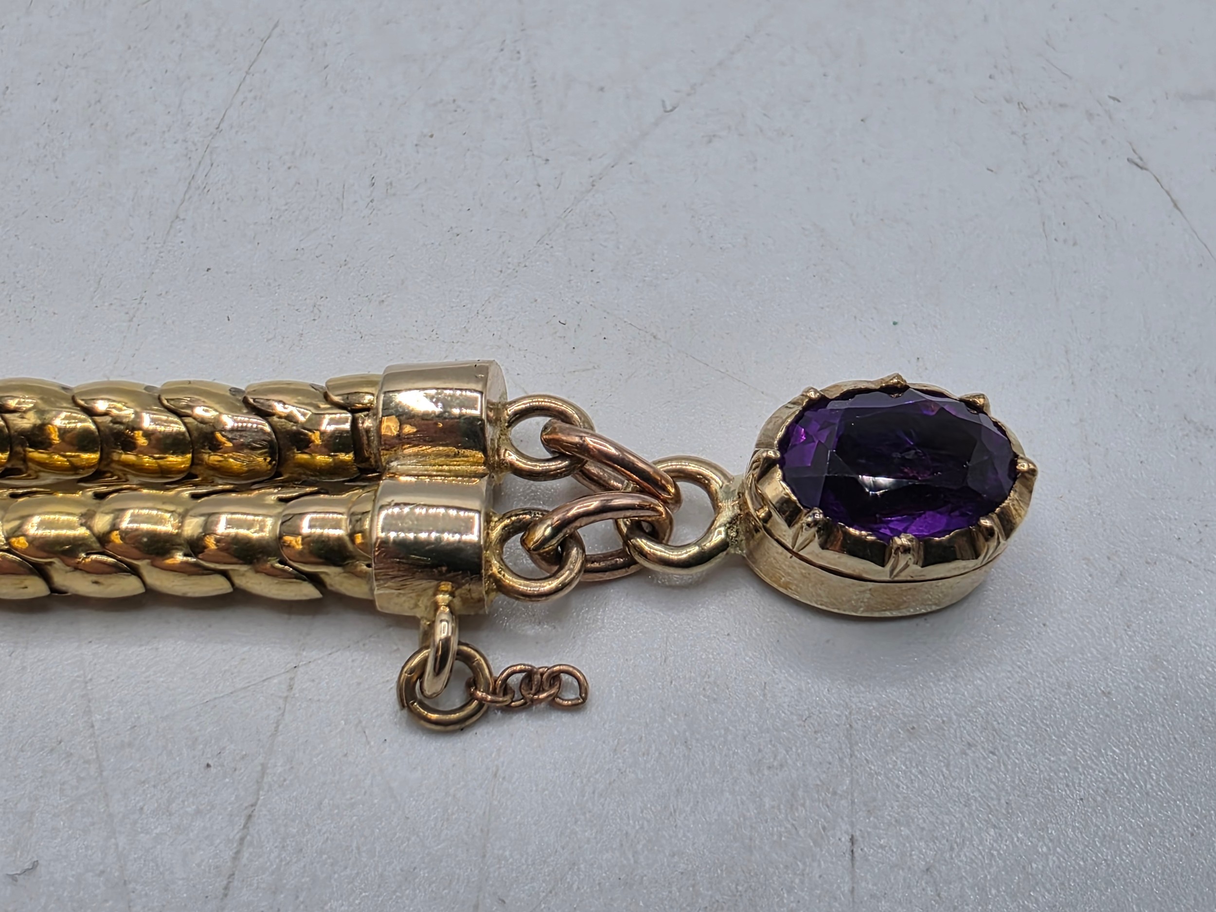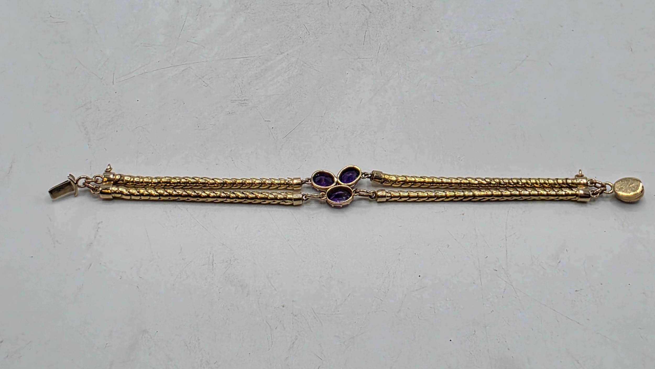 An unmarked yellow metal and amethyst double snake link bracelet set with four free cut oval amethysts. 19cm. 15g.