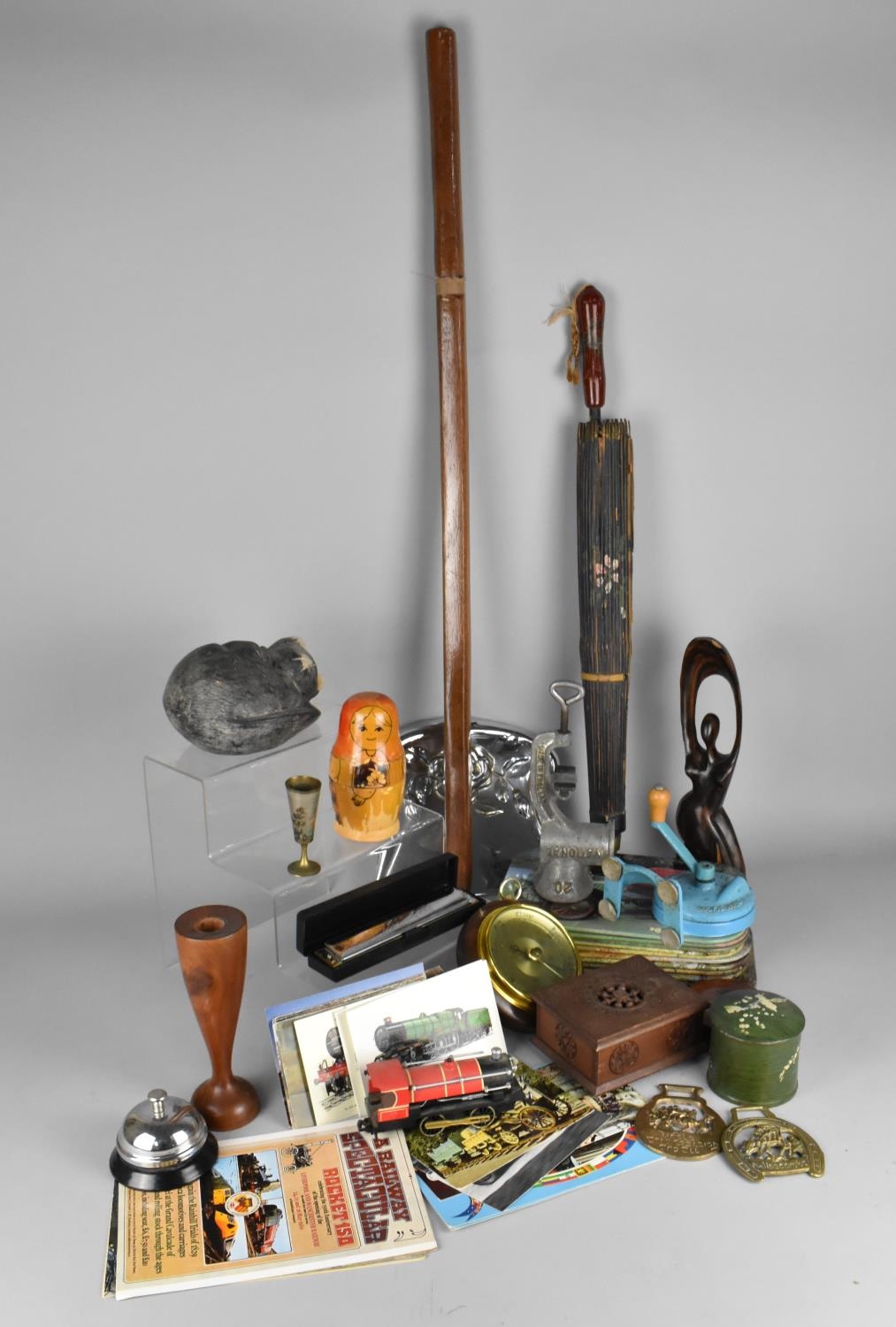 A Collection of Various 20th Century Sundries to Comprise Placed, Ornaments, Russian Doll, Mince, Train Postcards, Japanese Items etc