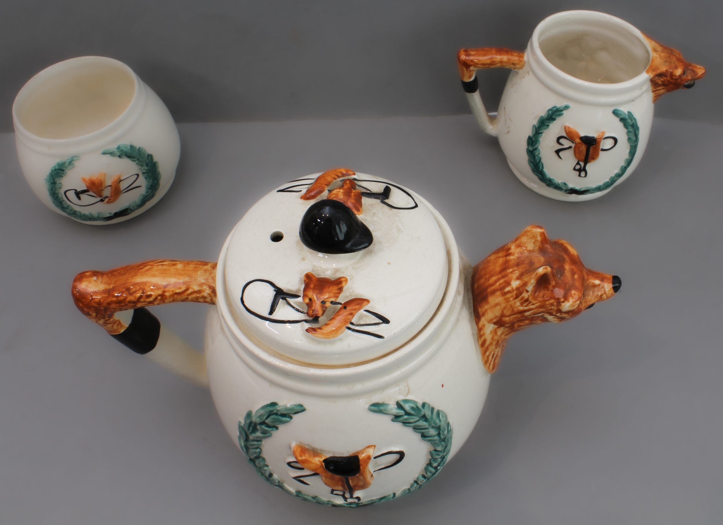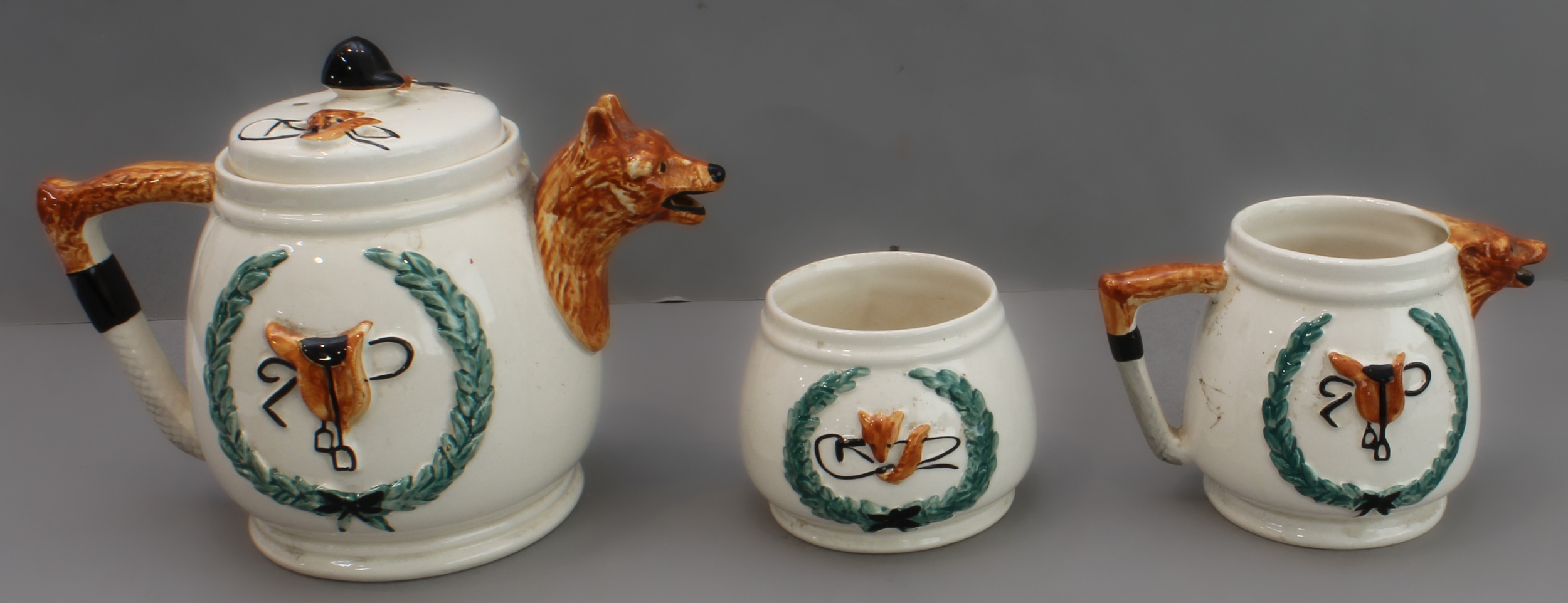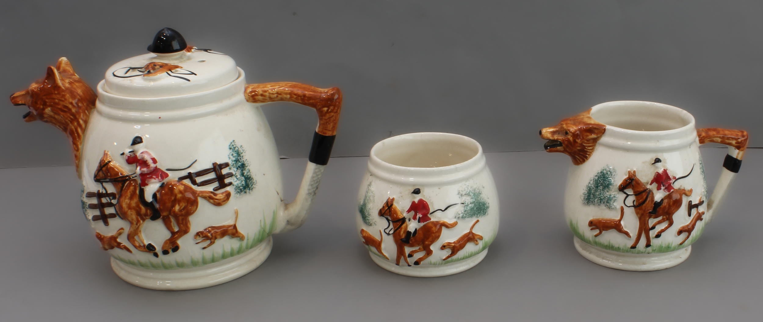 1. a three-piece ceramic tea service with foxhunting decoration in high relief and fox mask spouts (teapot, cream jug and sugar bowl);