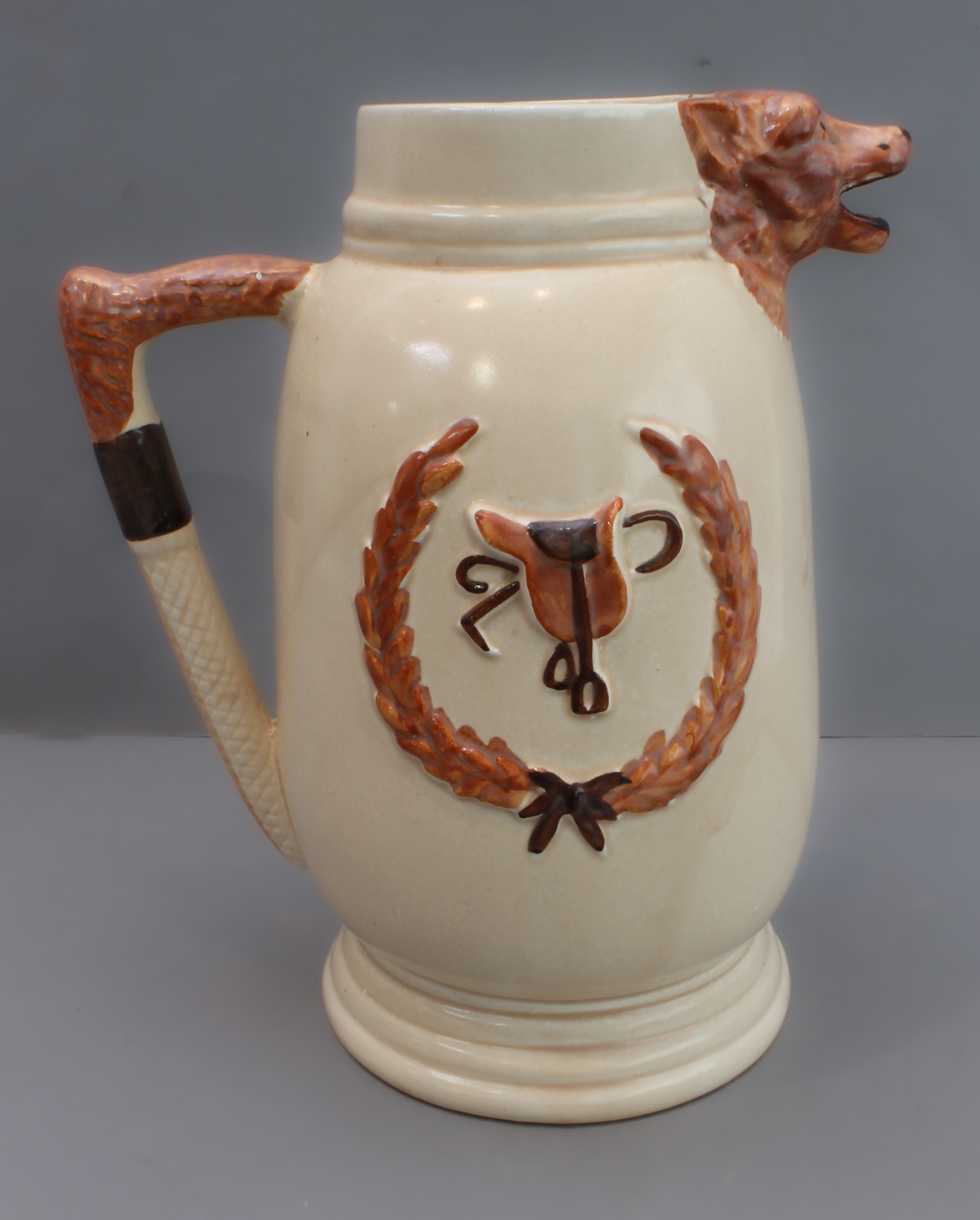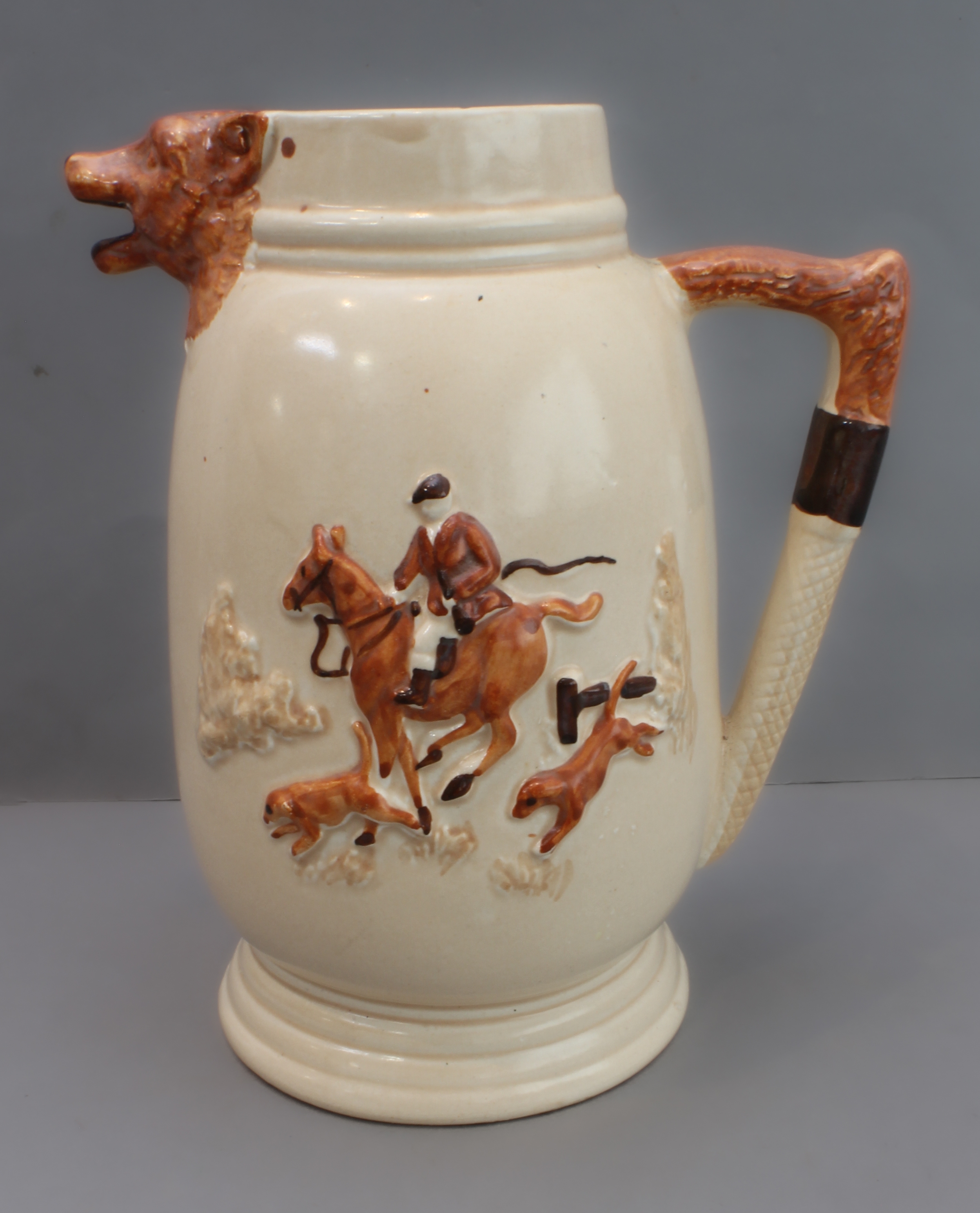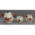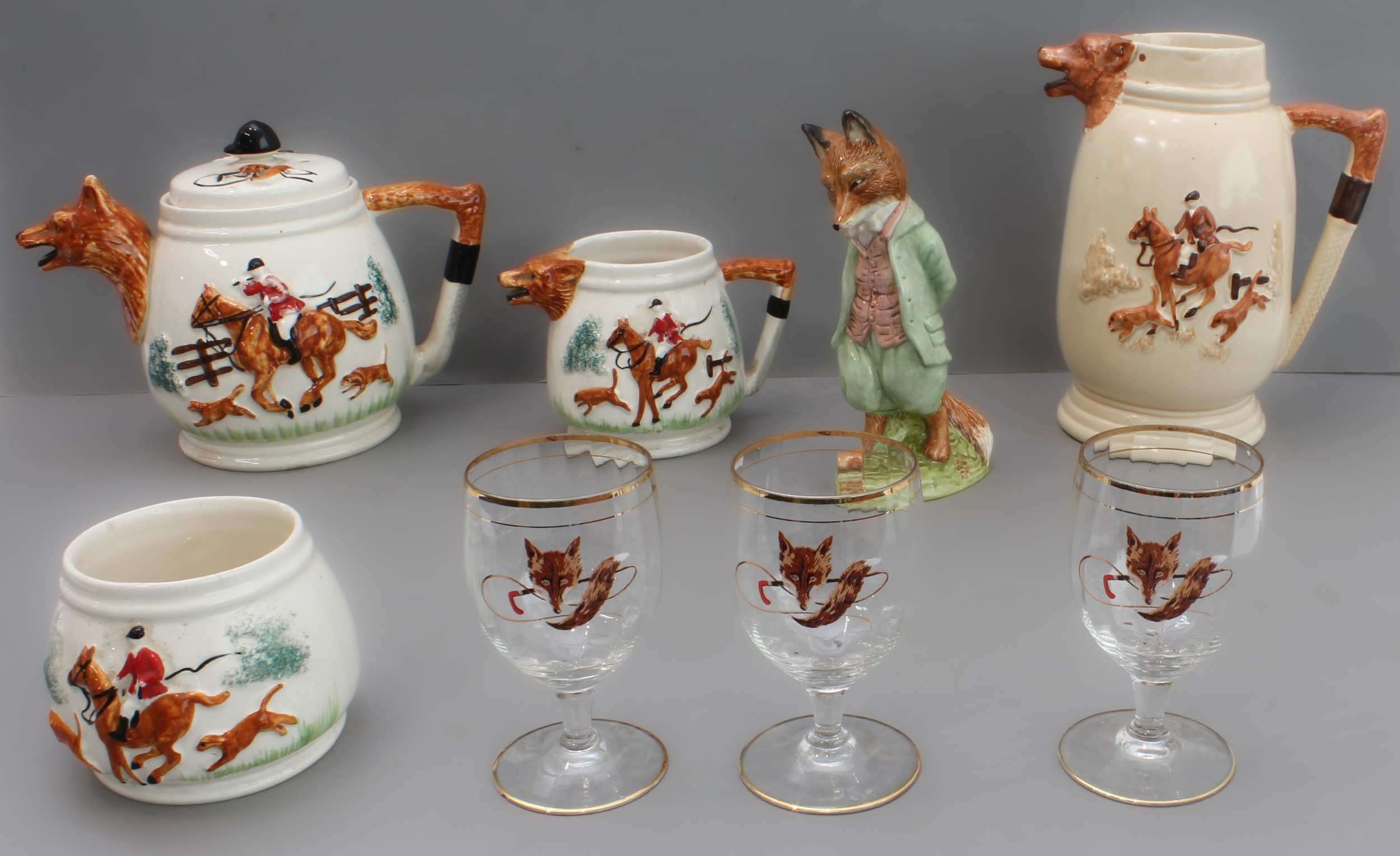 1. a three-piece ceramic tea service with foxhunting decoration in high relief and fox mask spouts (teapot, cream jug and sugar bowl);