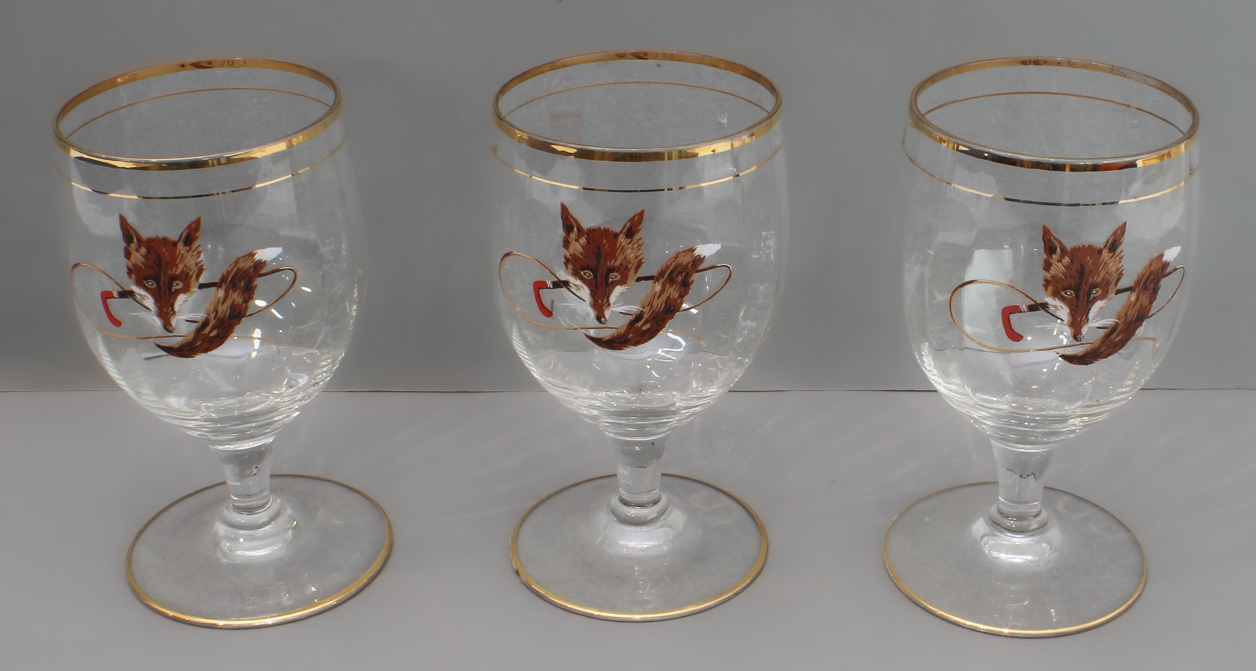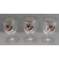 4. a set of three drinking glasses decorated with fox masks and crops.