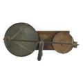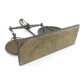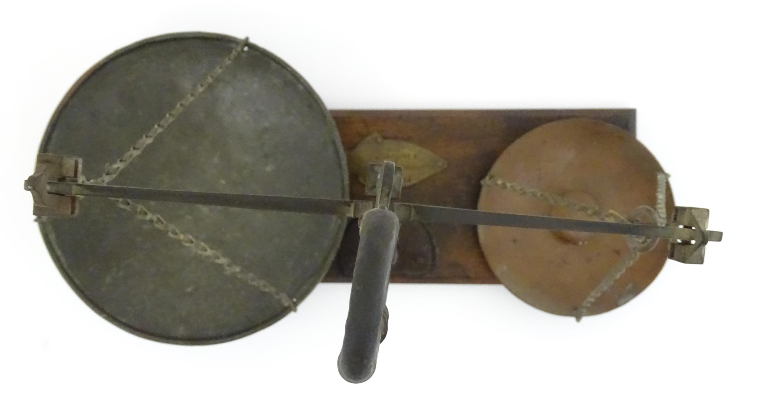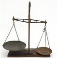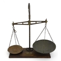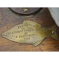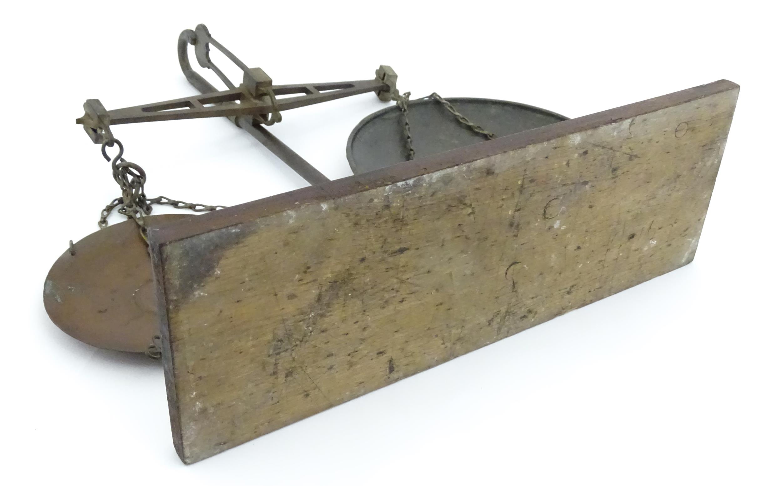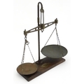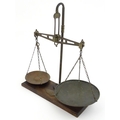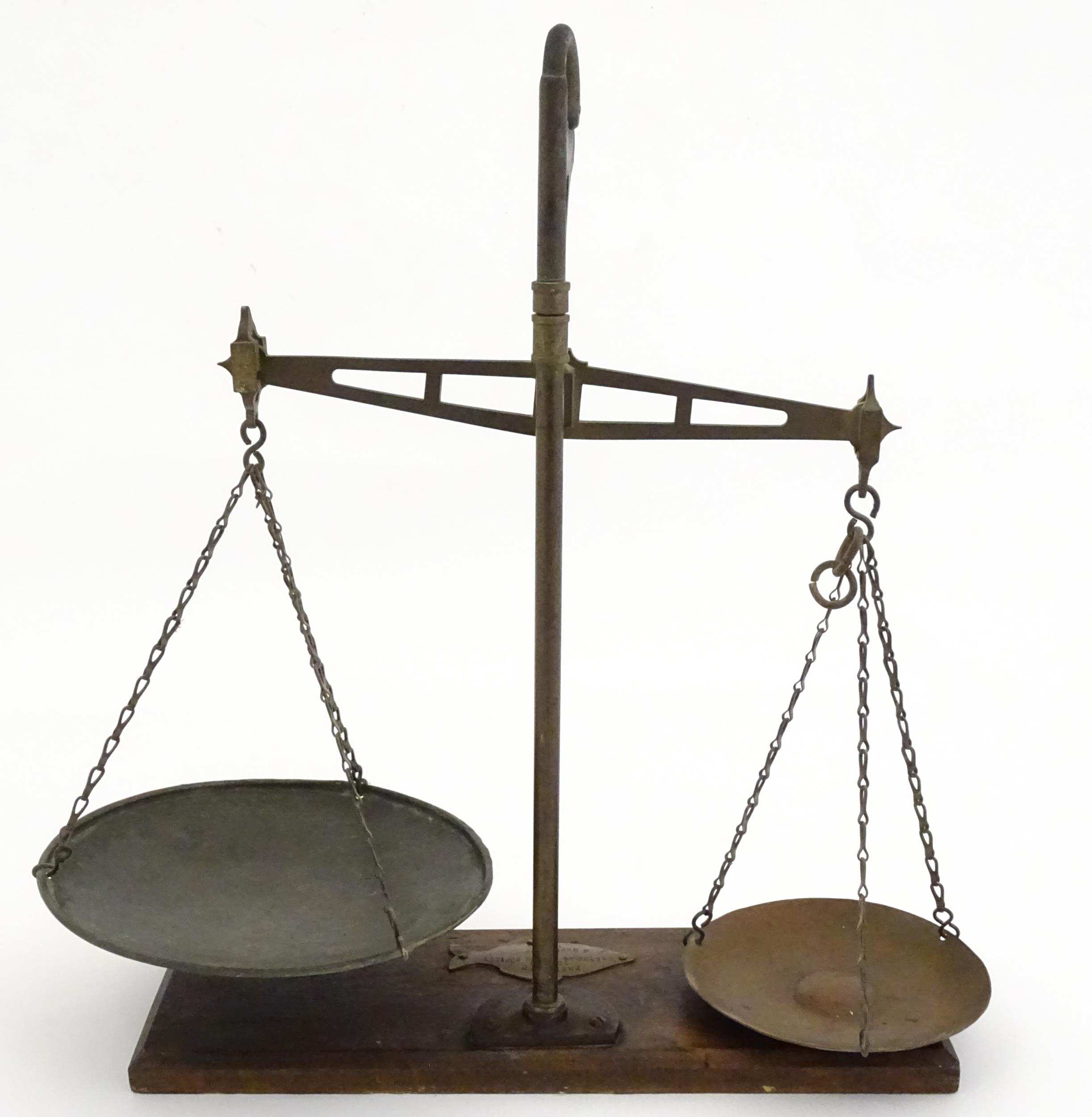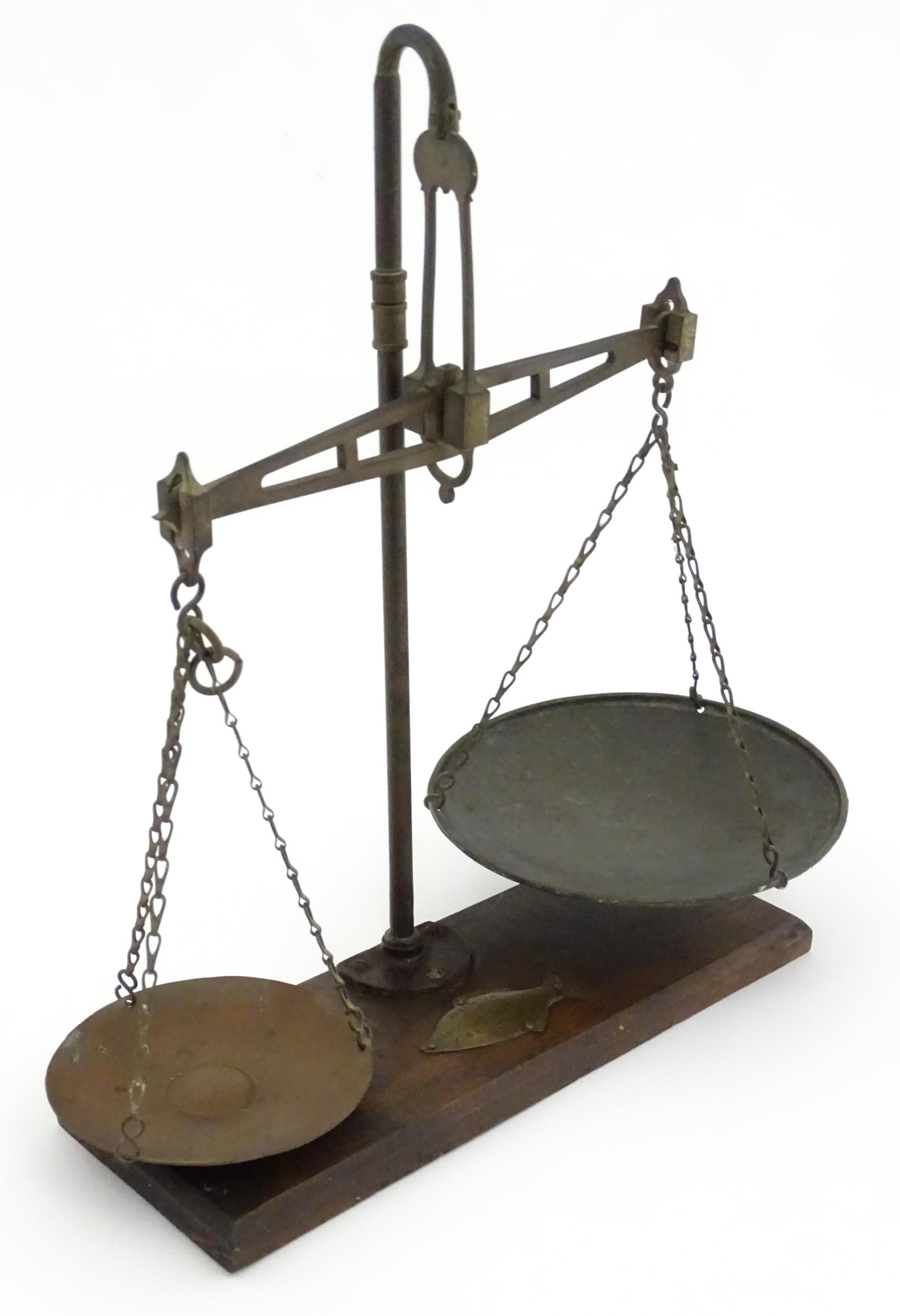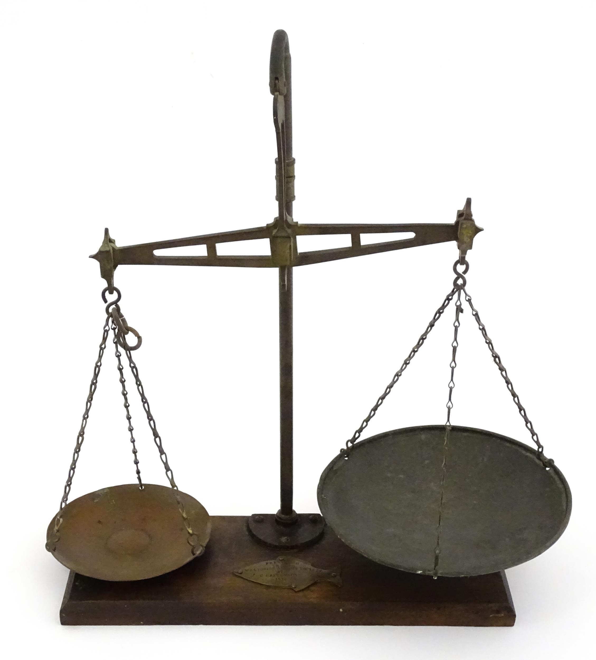 An early 20thC brass balance weighing scale, the wooden base with plaque in the form of a fish, marked 'Presented to the Waltonian Angling Society by G. Greenwood 1936.' Approx 19 3/4" high