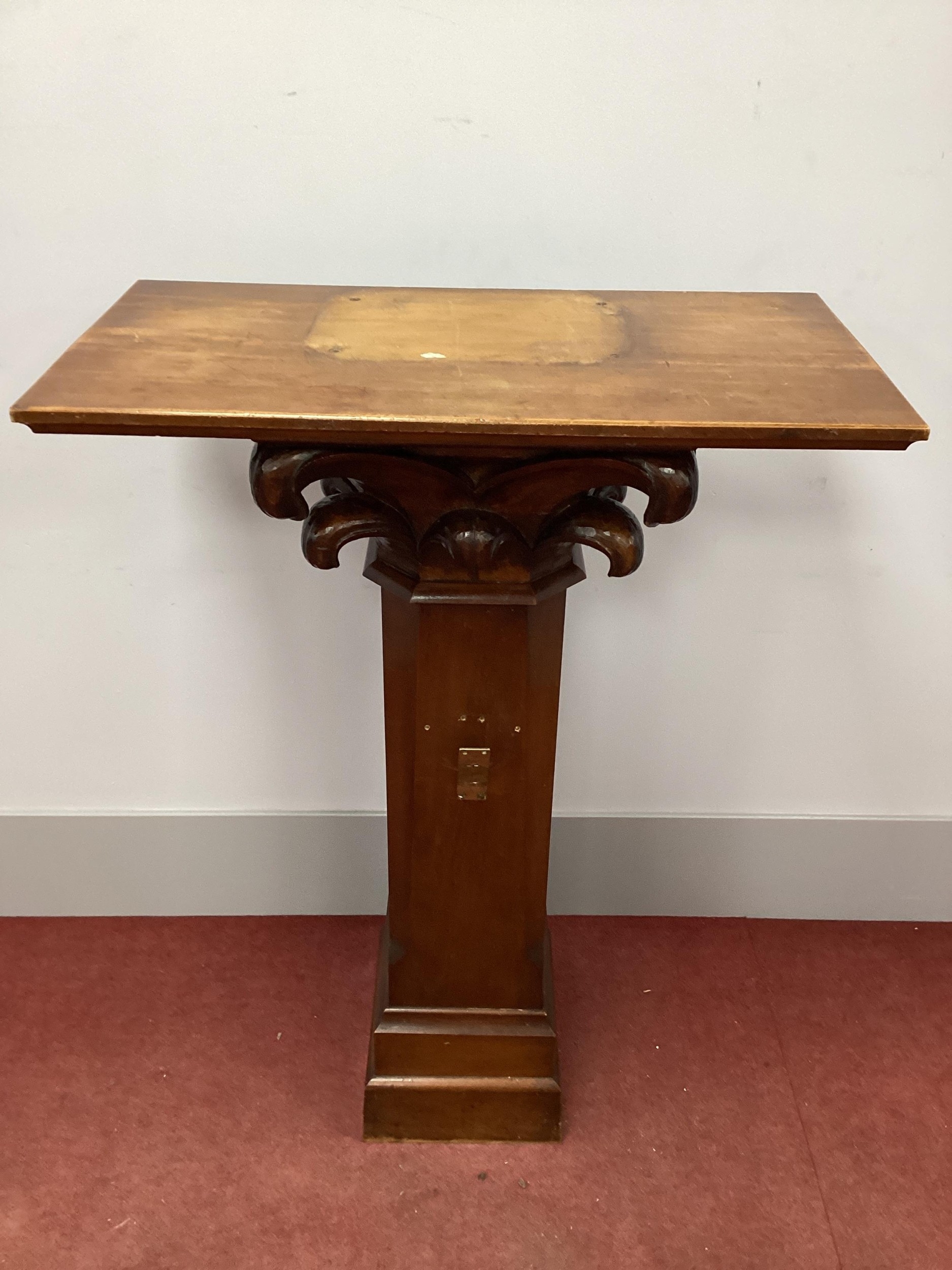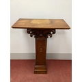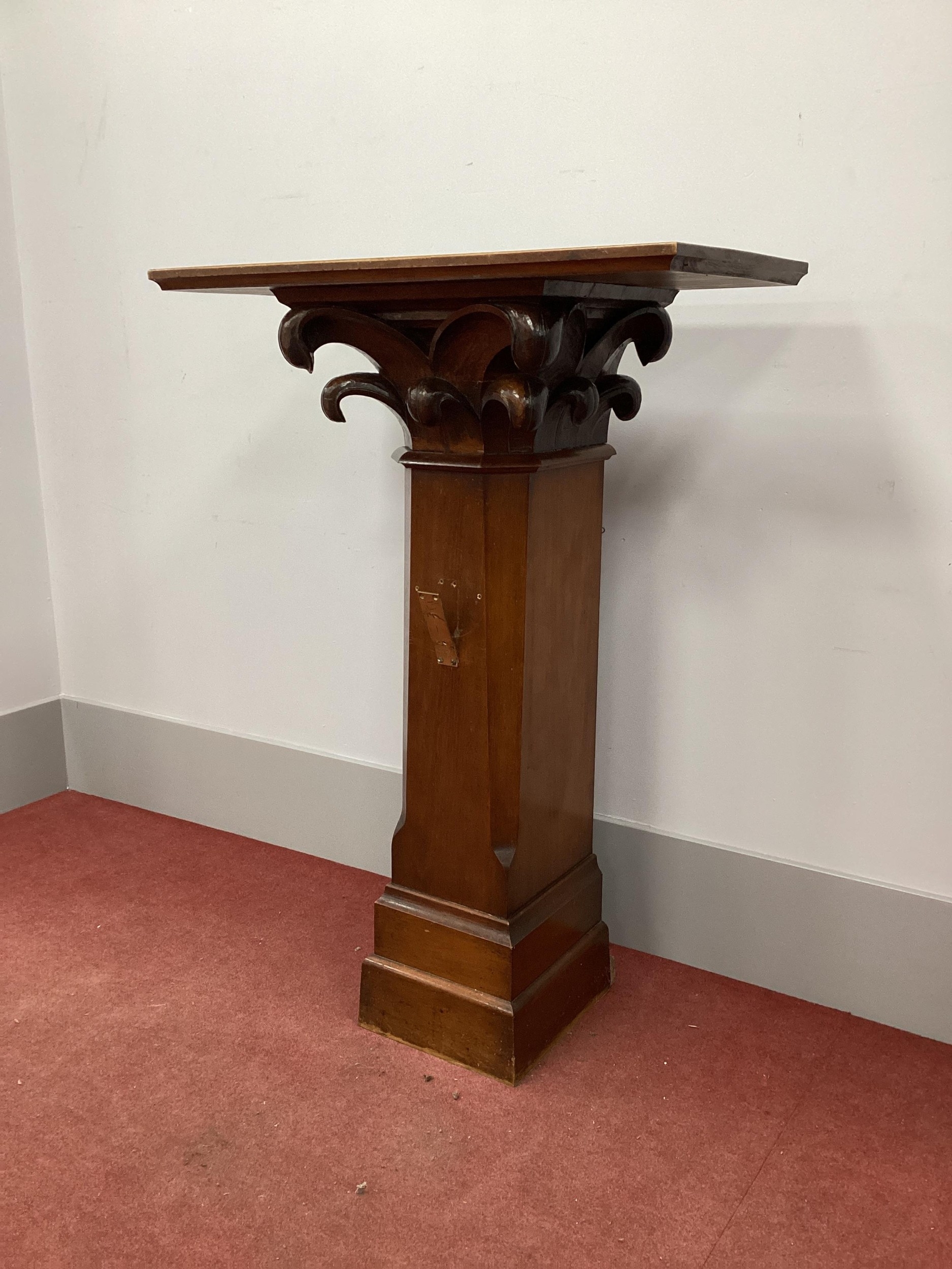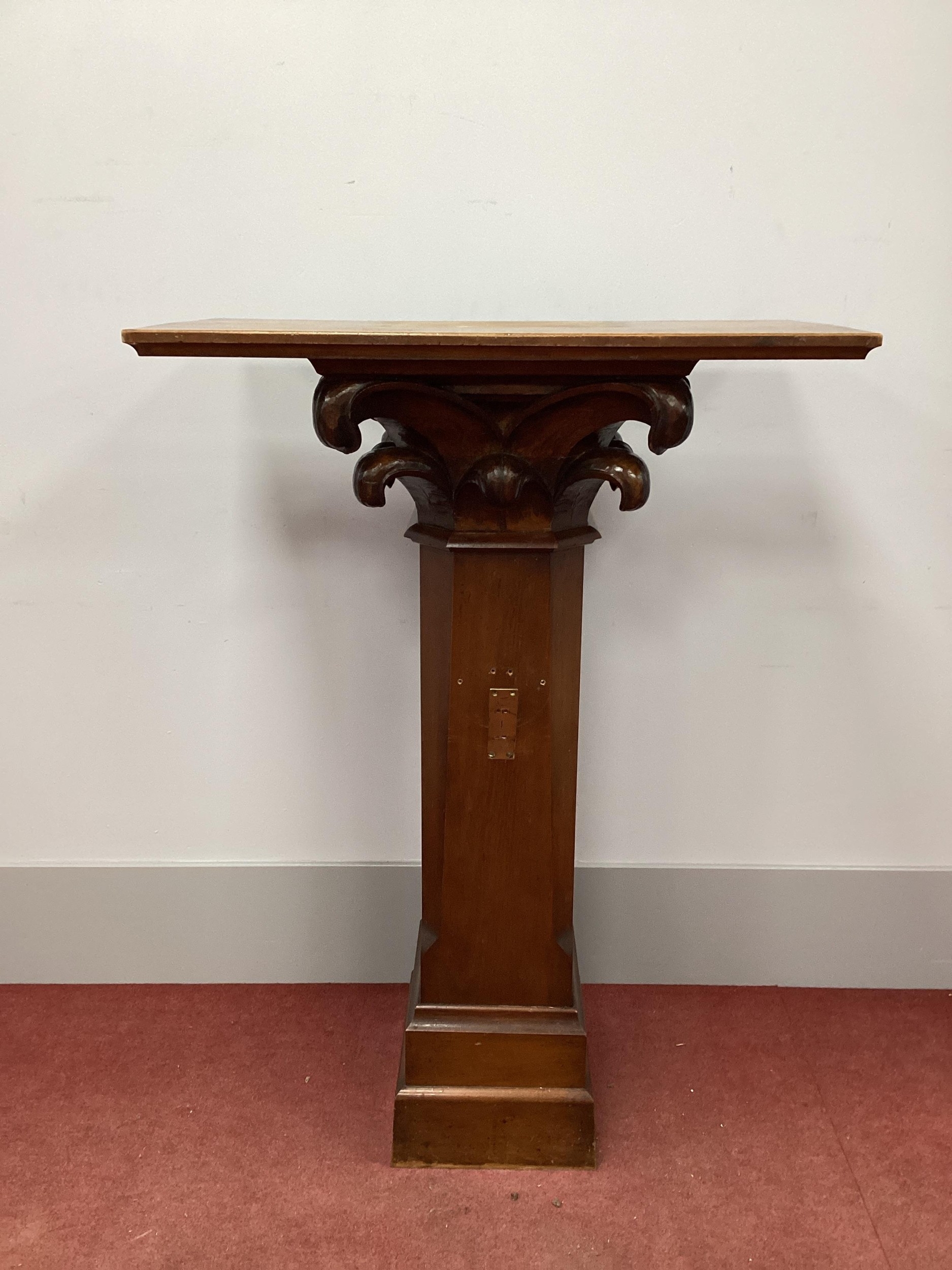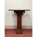 An Oak and Mahogany Pedestal, the pine top with scroll carved decoration, chamfered sides and plinth base, 123cm high.