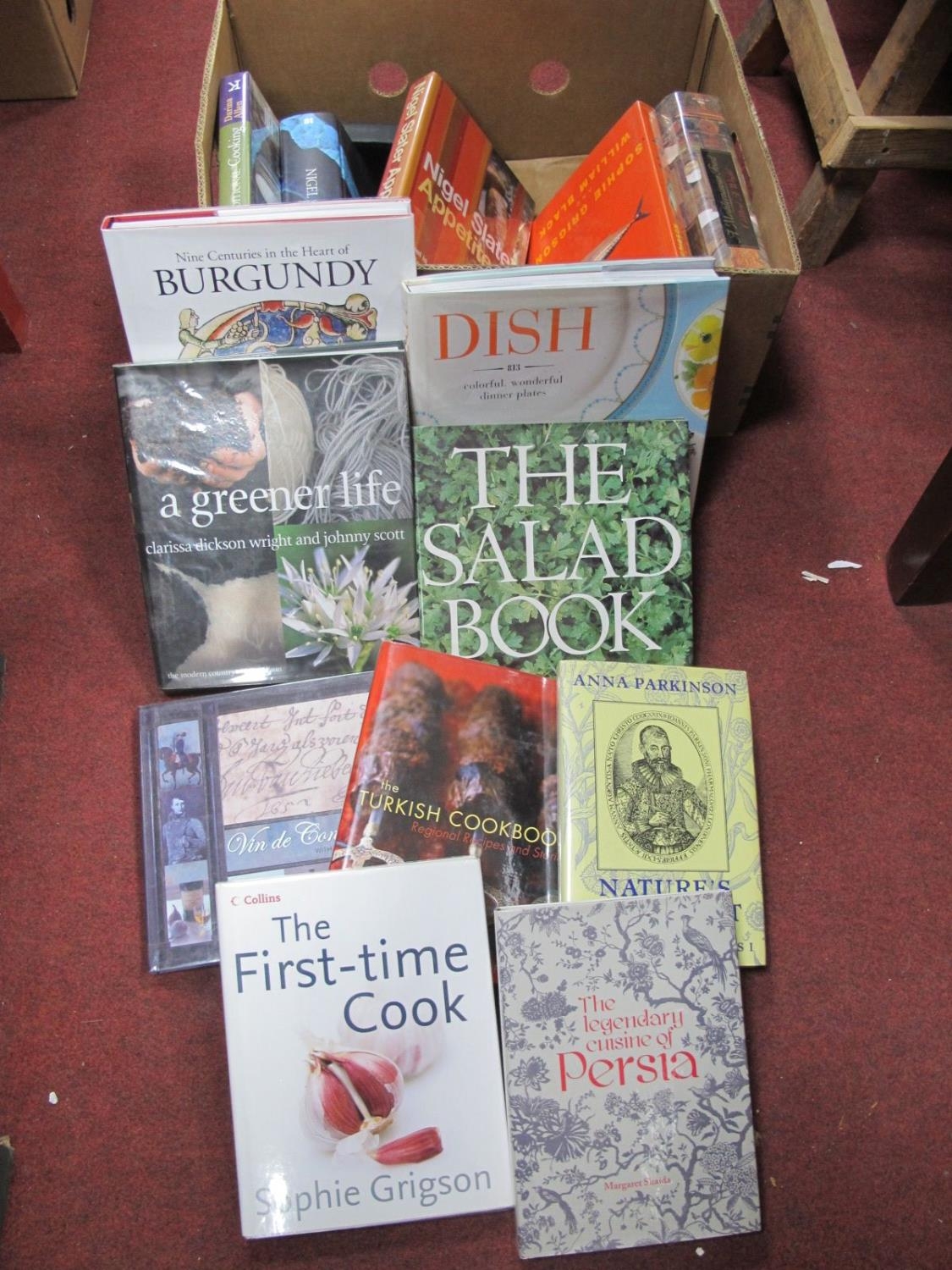 Dish; 813 Colorful, Wonderful Dinner Plates (Shax Riegler), 2011, pub. Artisan, New York; plus cookery and food related books, to include 'Nine Centuries in the Heart of Burgundy', Nigel Slater, Darina Allen, etc:- One Box