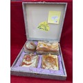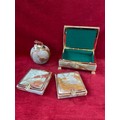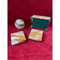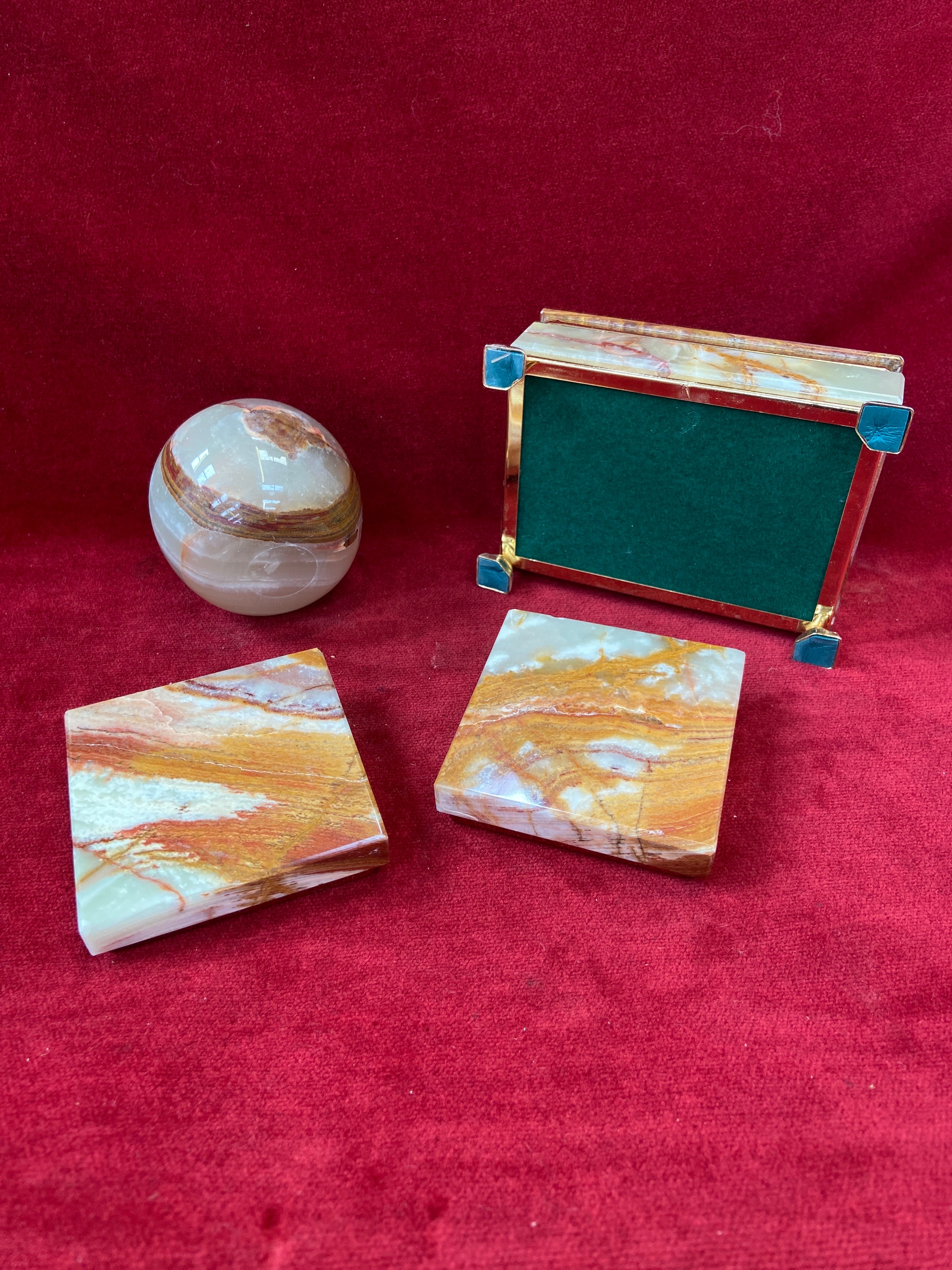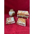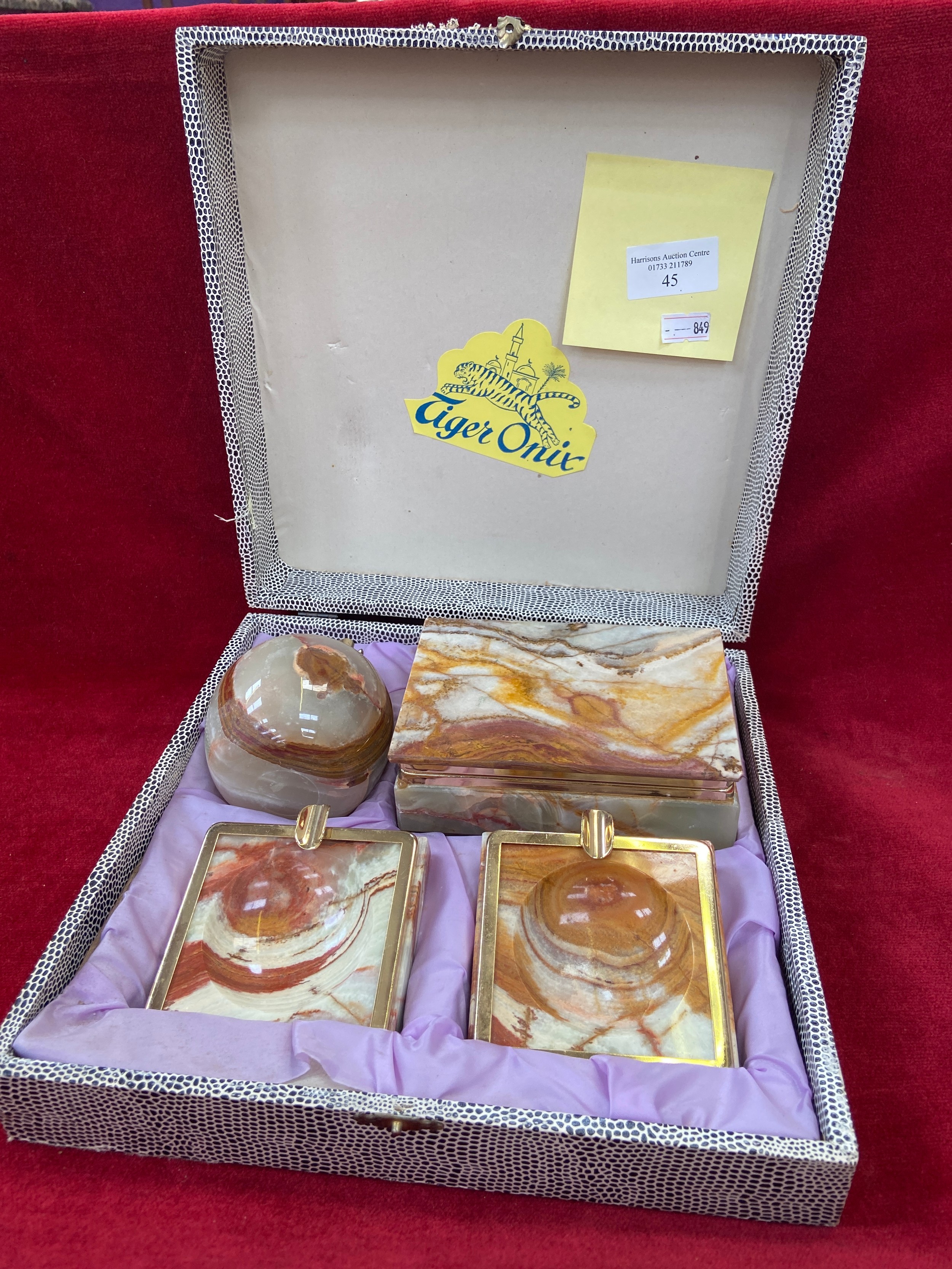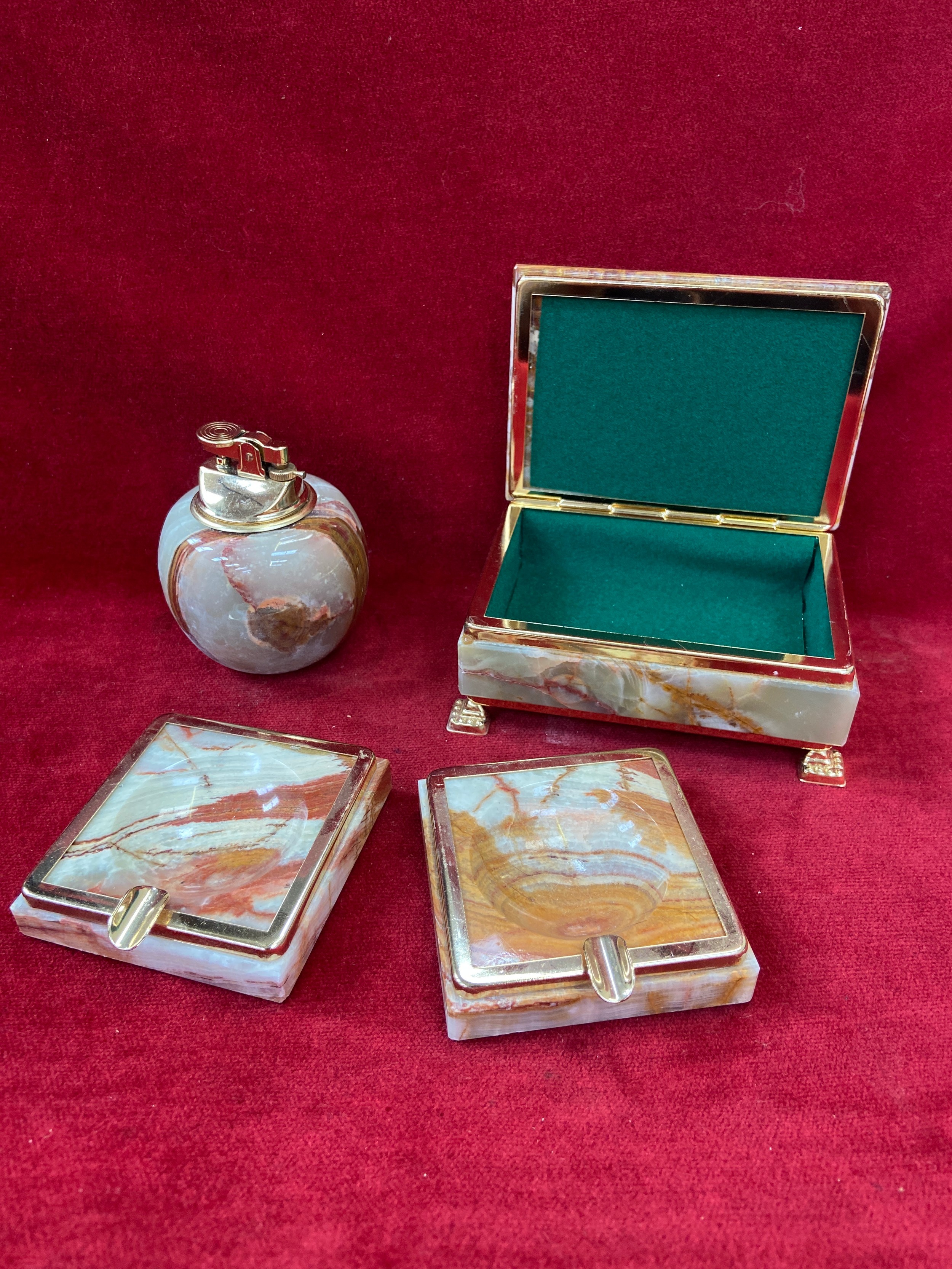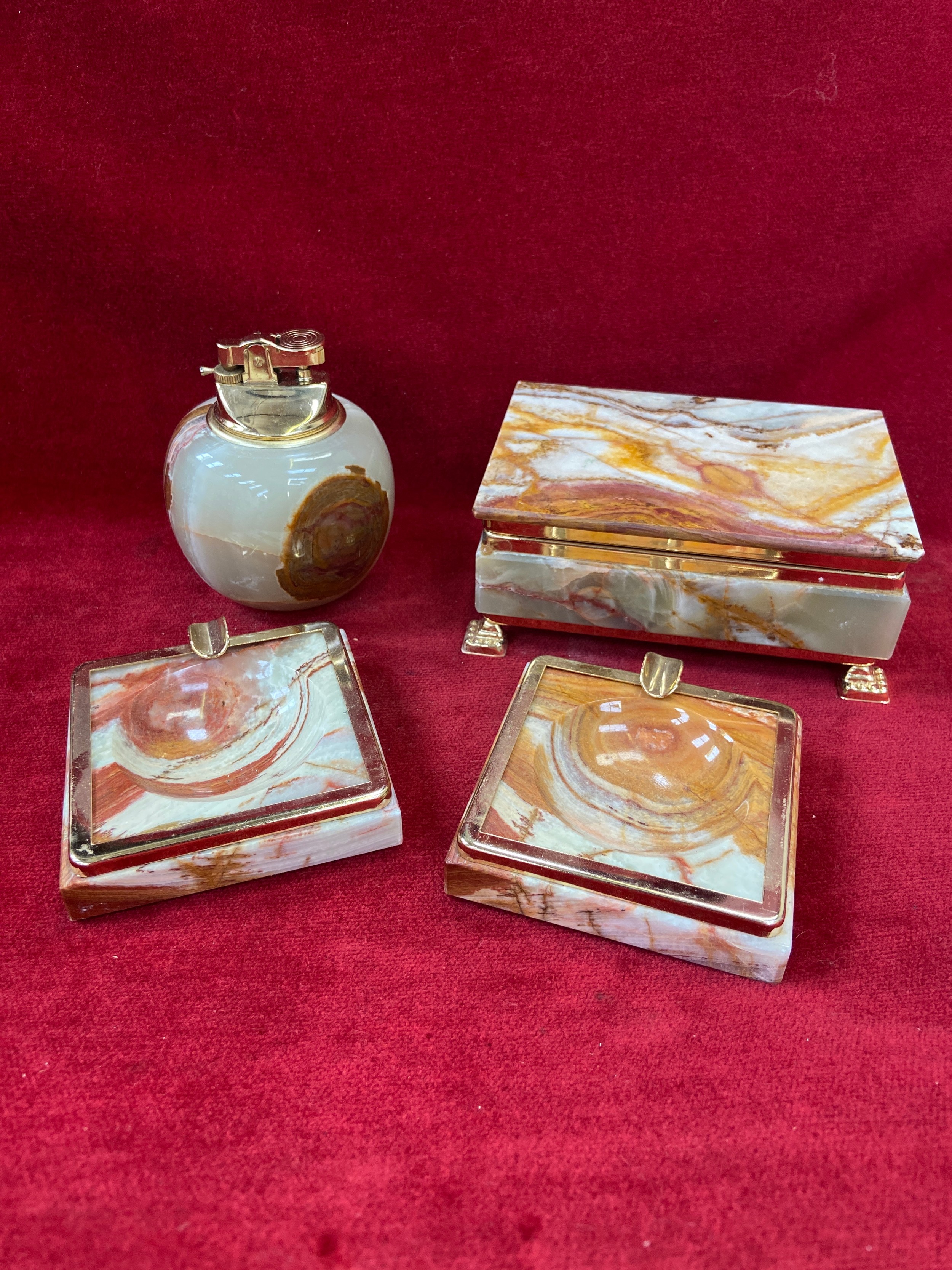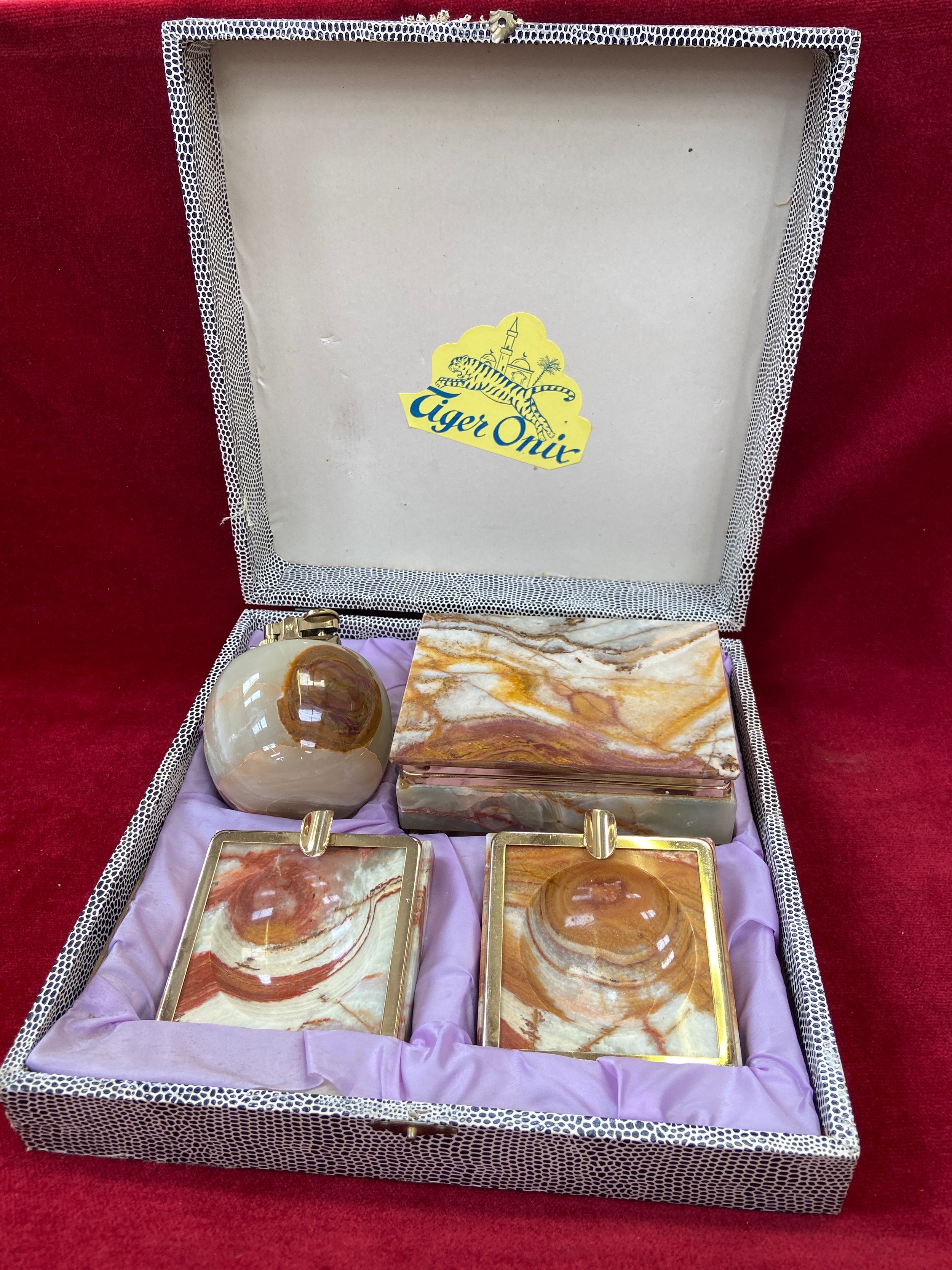 Good quality boxed vintage 'Tiger Onix’ smokers set, including table lighter, cigarette box and two ashtrays made of tiger onyx and gilt metal.