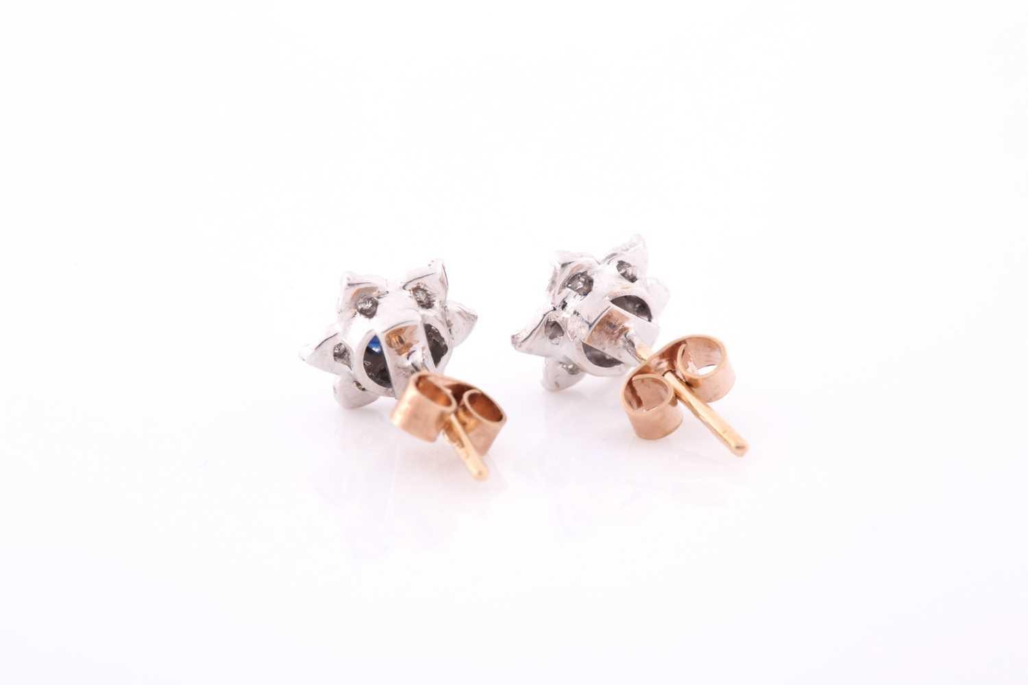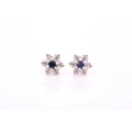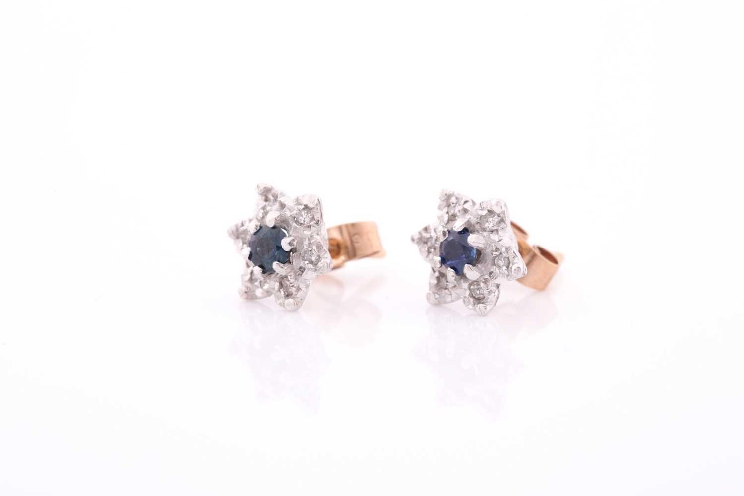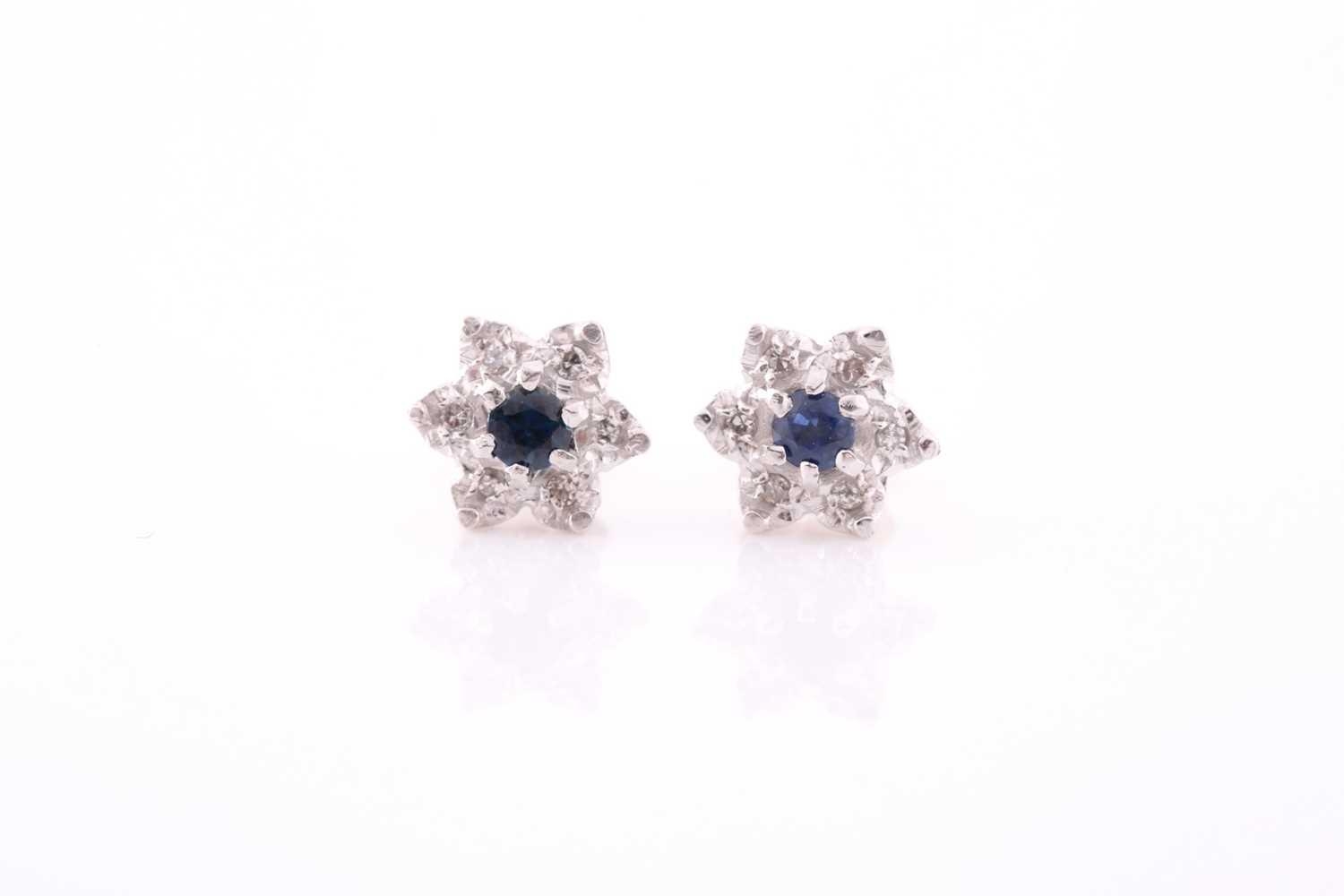 A pair of diamond and sapphire floral cluster earrings, set in white metal mounts, the yellow metal stems marked 375, approximately 1 cm diameter, 2.2 grams.
