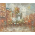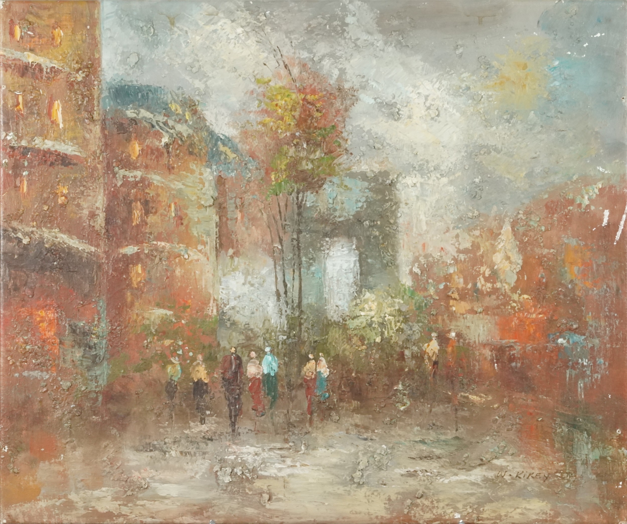 W. Kirey - Figures on a street, 20th century Impressionist school oil on canvas, signed, unframed, 51cm x 62cm.