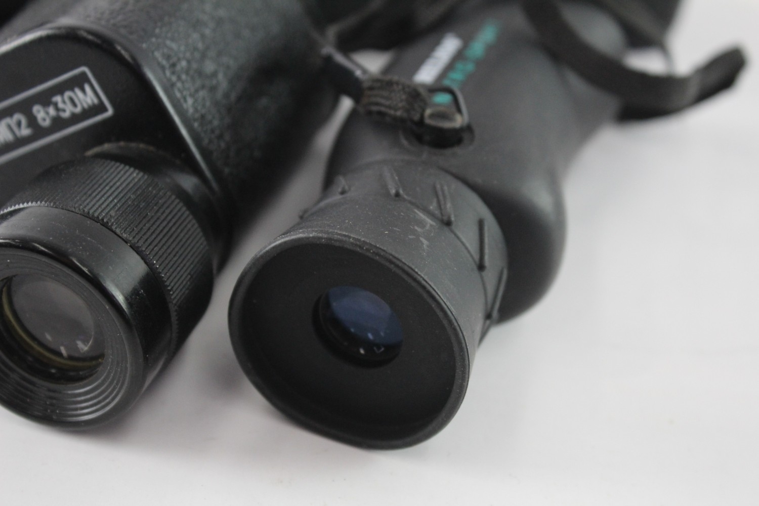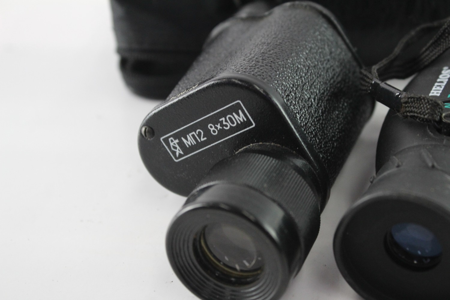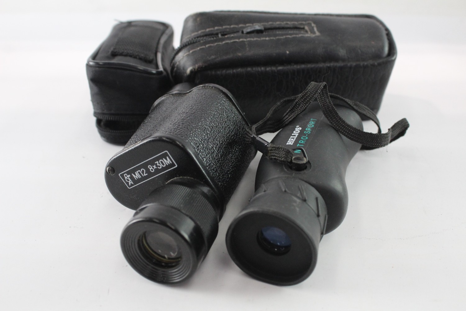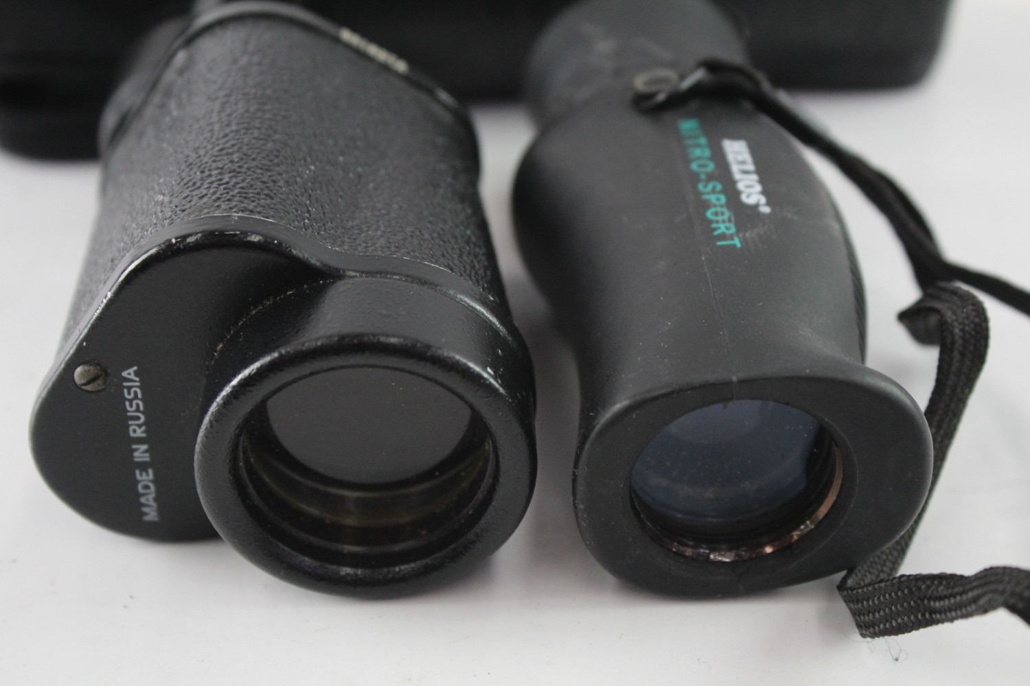 Two cased monoculars, one Helios Nitro-Sport rubber-coated waterproof 8x25 and one KOMZ MП2 8x30M with caps