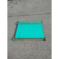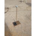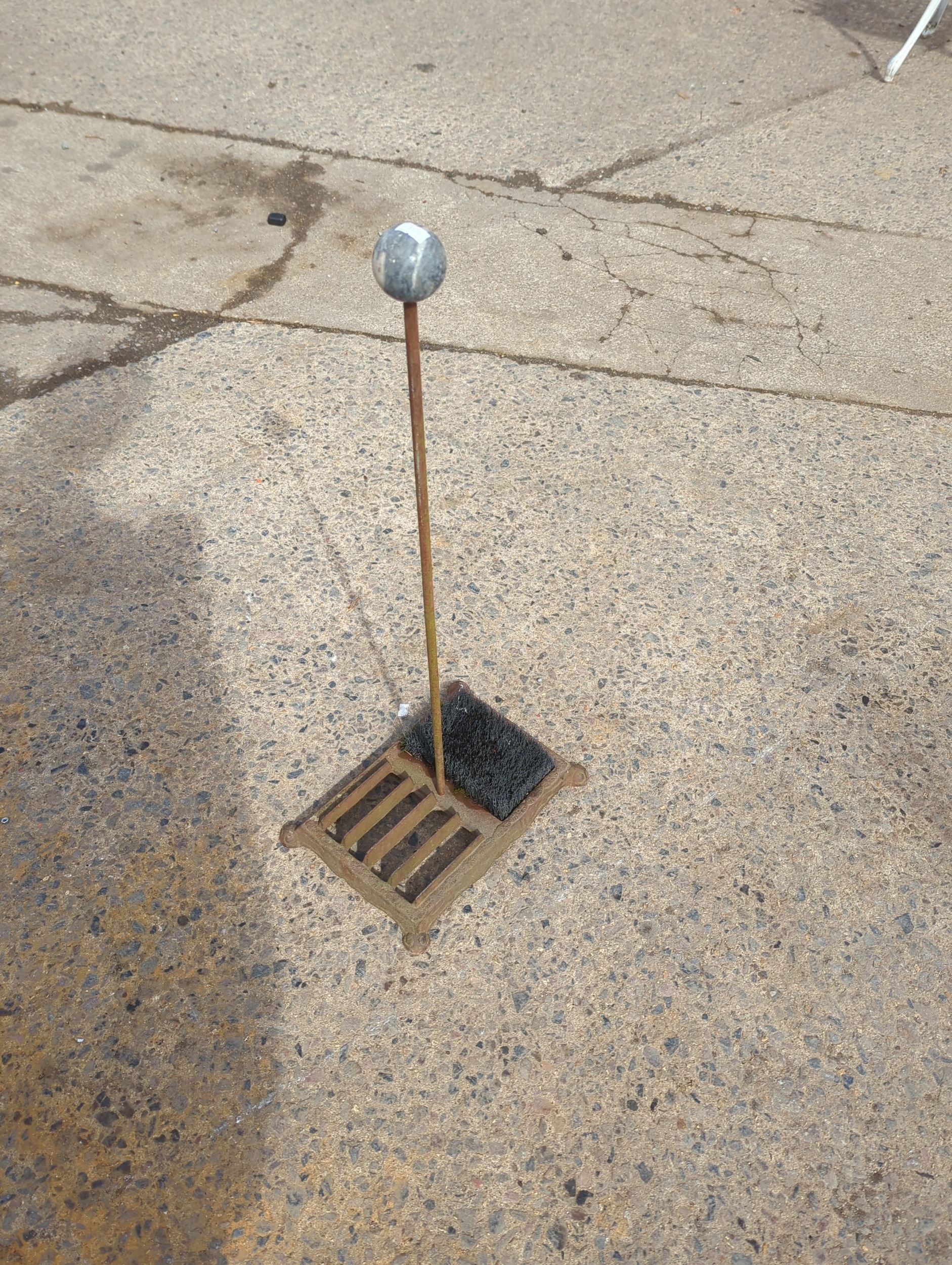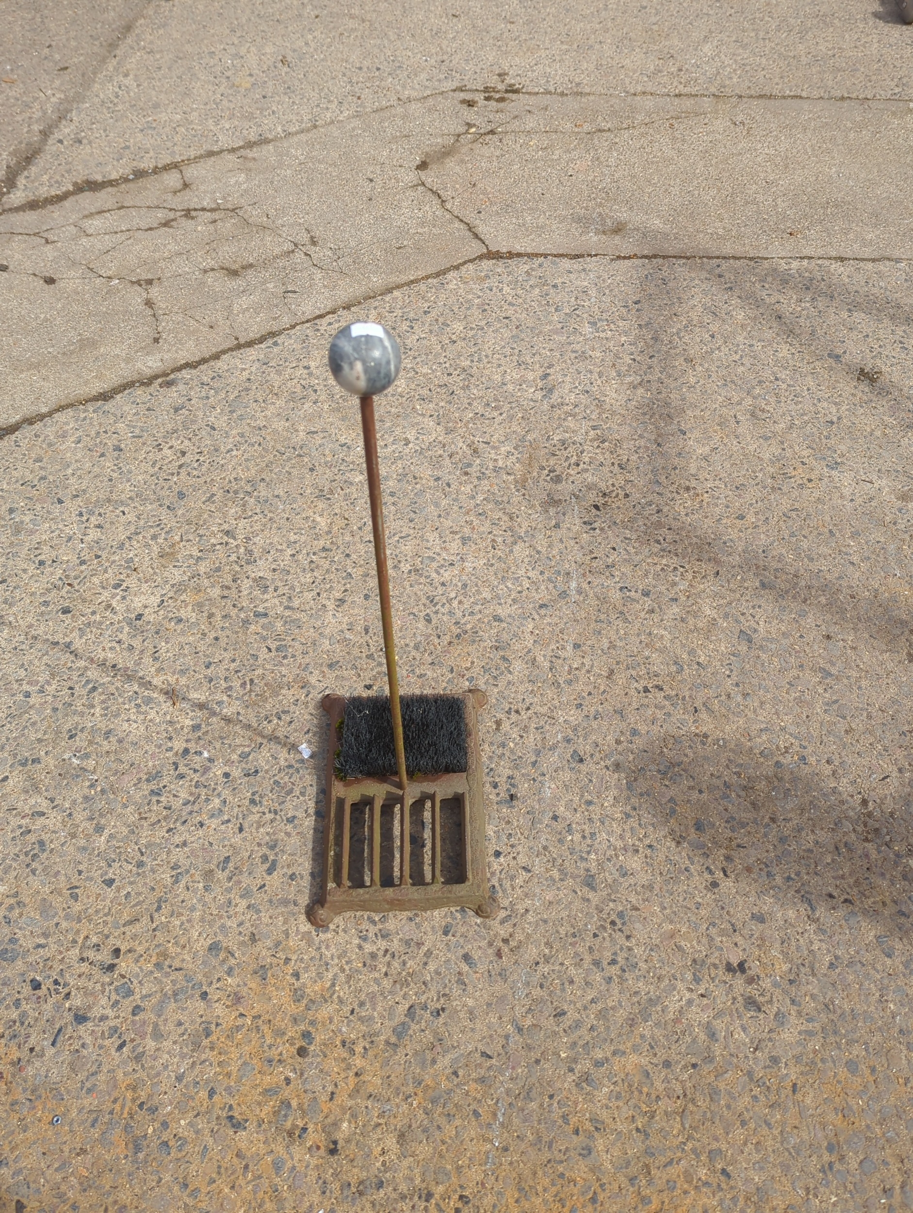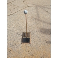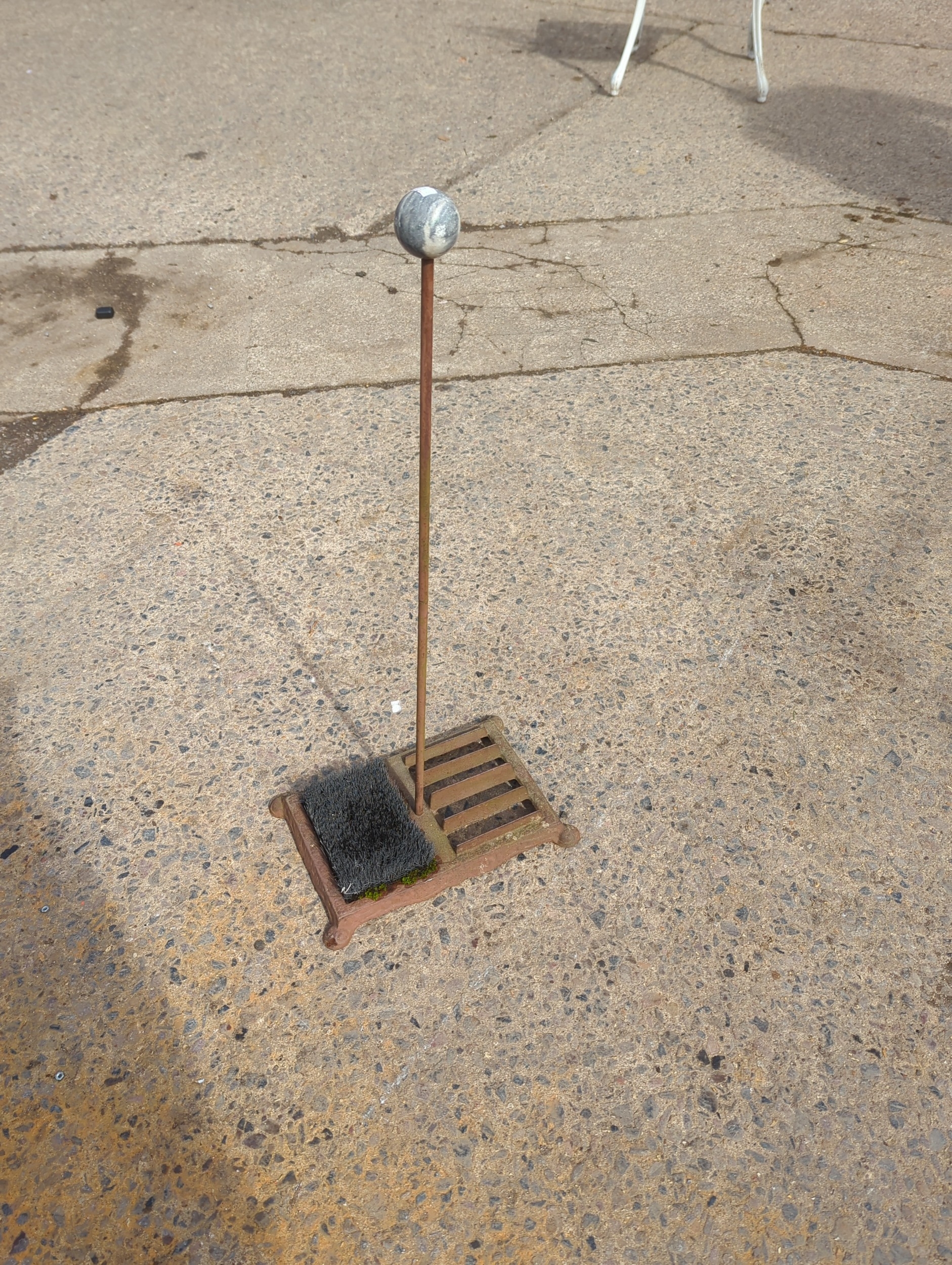 This item is an iron boot scraper featuring a sturdy metal handle with a reflective sphere at the top. Designed for outdoor use, the scraper is ideal for removing dirt and mud from footwear. The base has a grid-like structure for effective cleaning.
