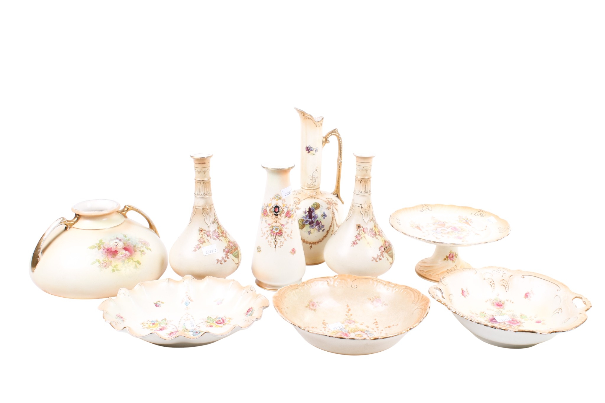 A collection of Victorian Crown Devon blush ivory ceramic items. Including a pair of vases, an ewer, etc. Max. H32cm