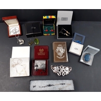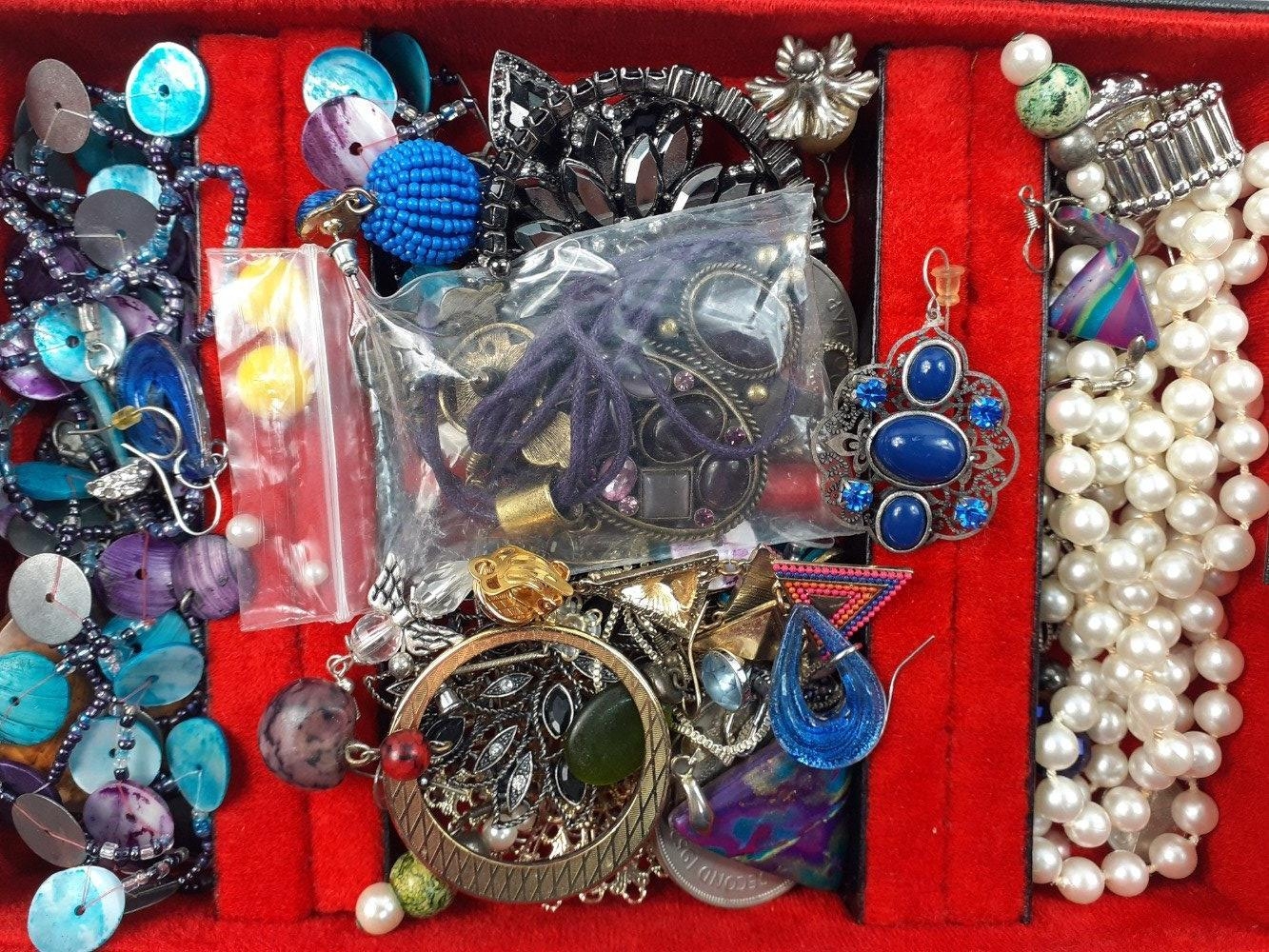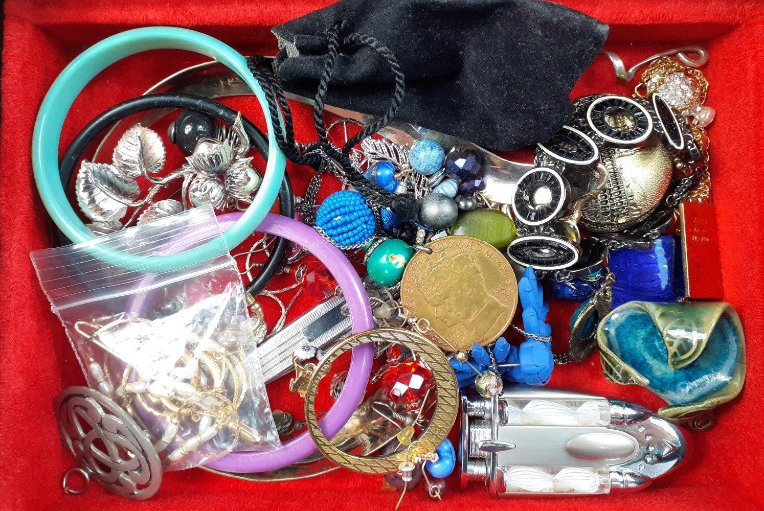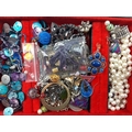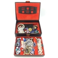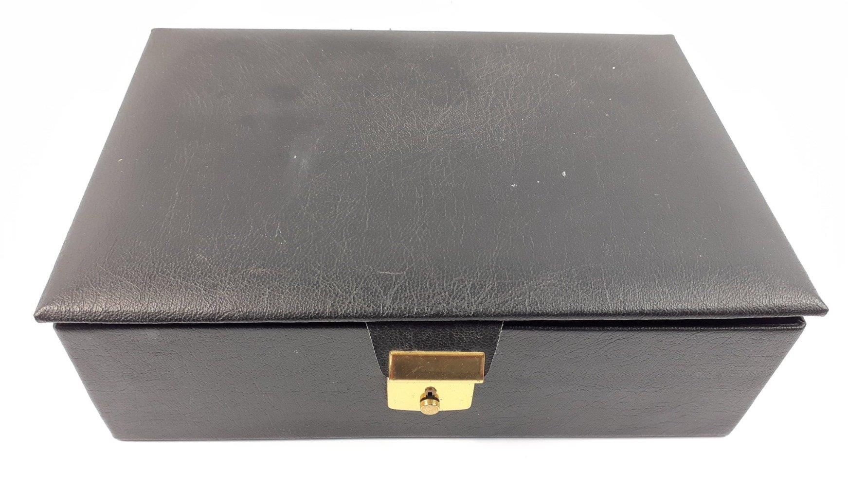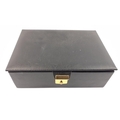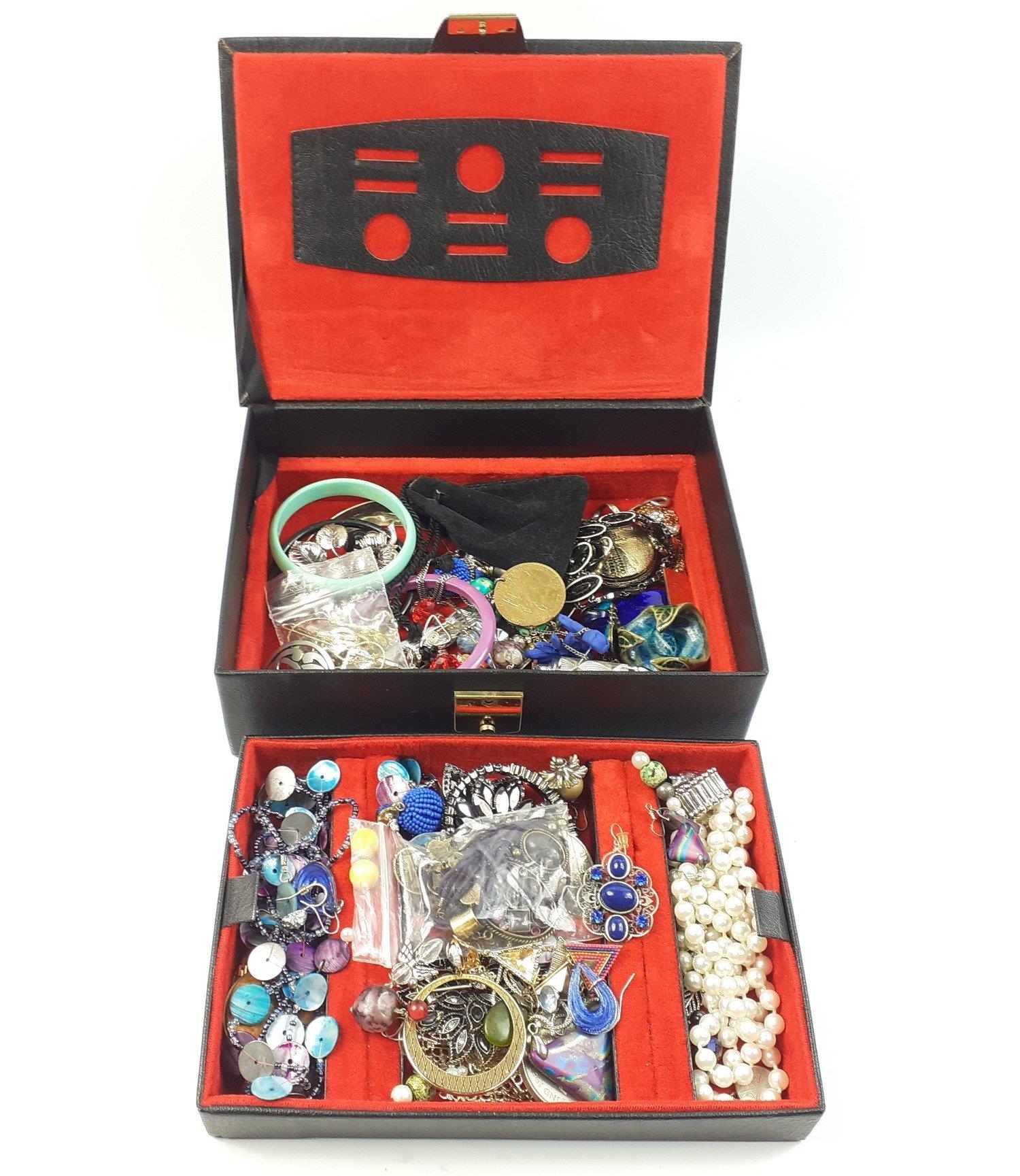A black jewellery box with lift-out shelf and contents of costume jewellery 24x17x7cm approx