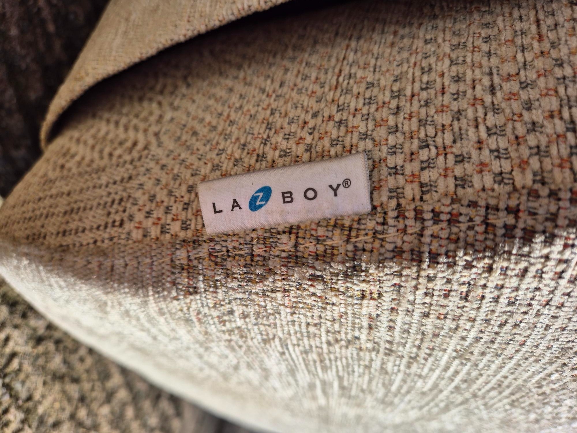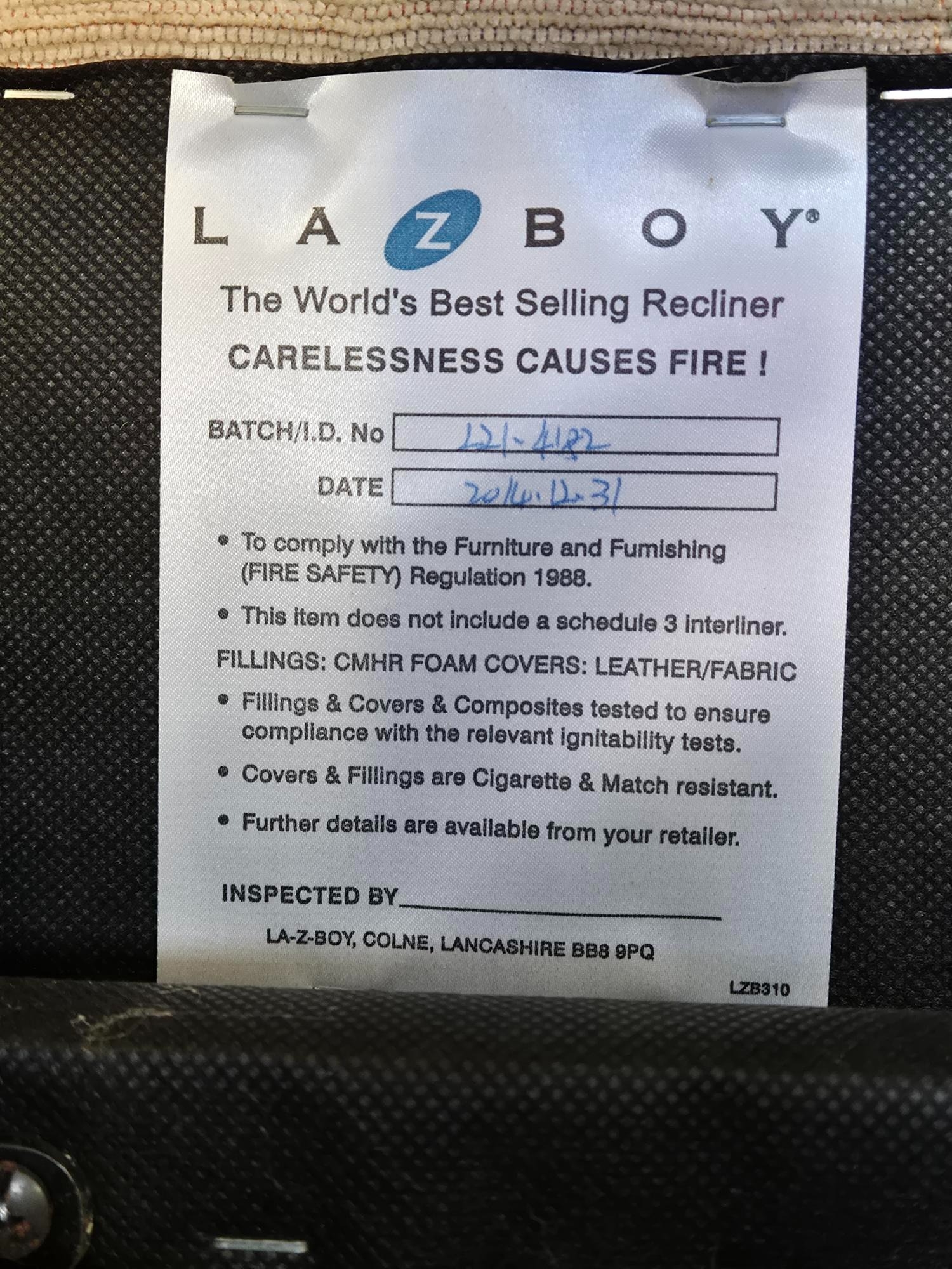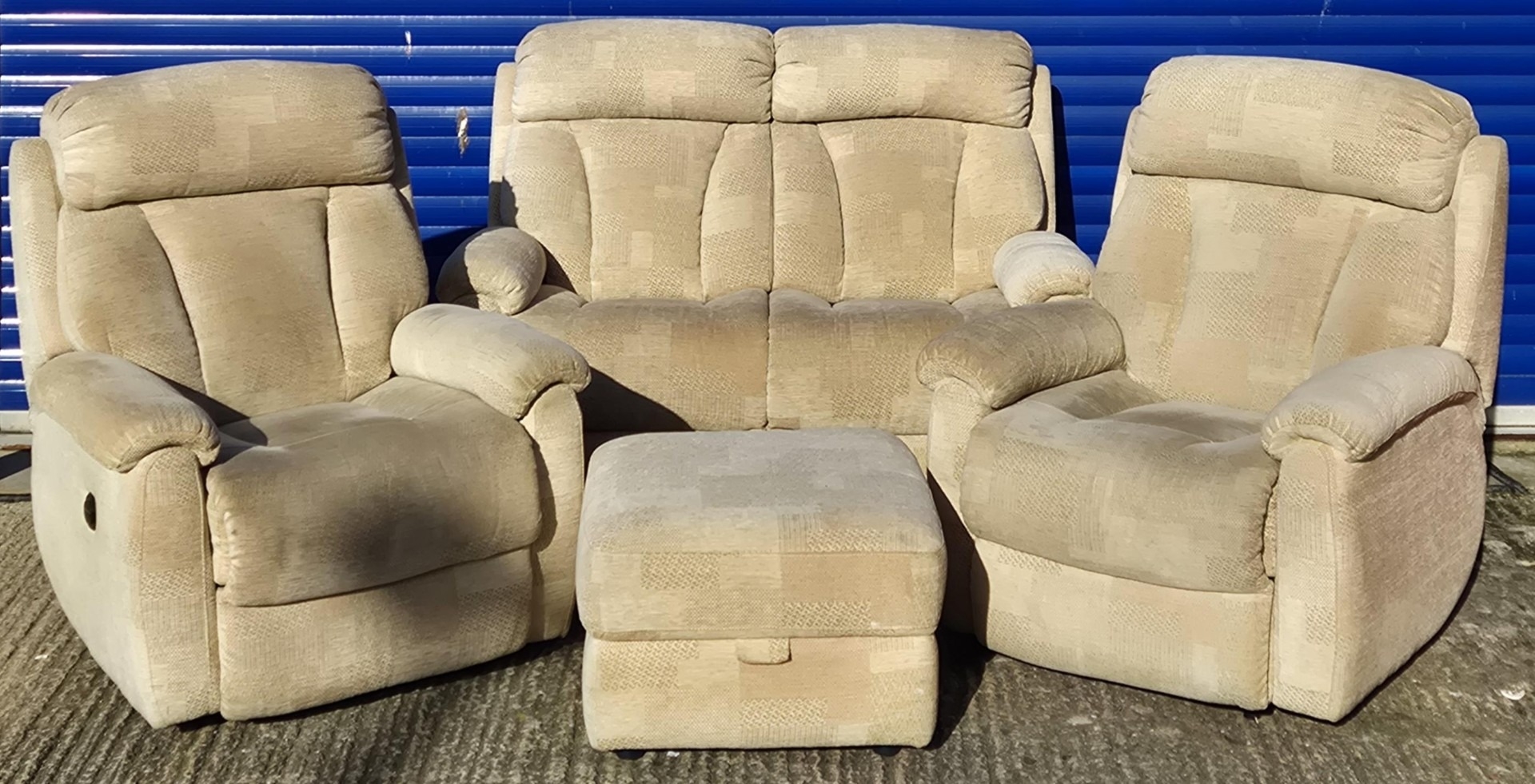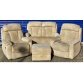 Good quality Lazboy sofa, with two matching armchairs & footstool. Dimensions(cm) Sofa H103, W138, D83; Chairs H103, W79, D83; Footstool H43, W66, D60.
