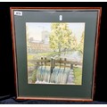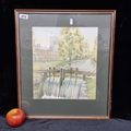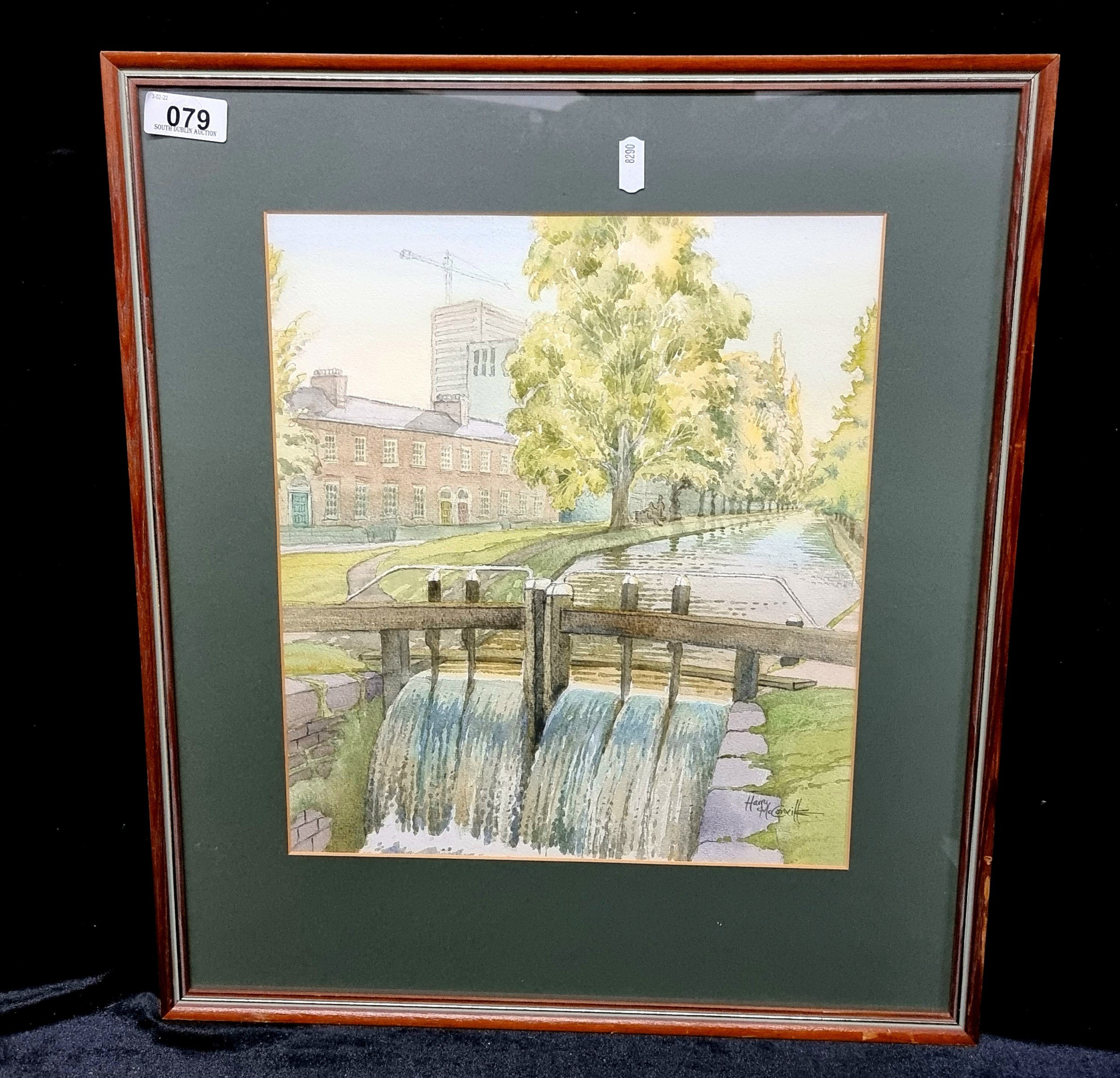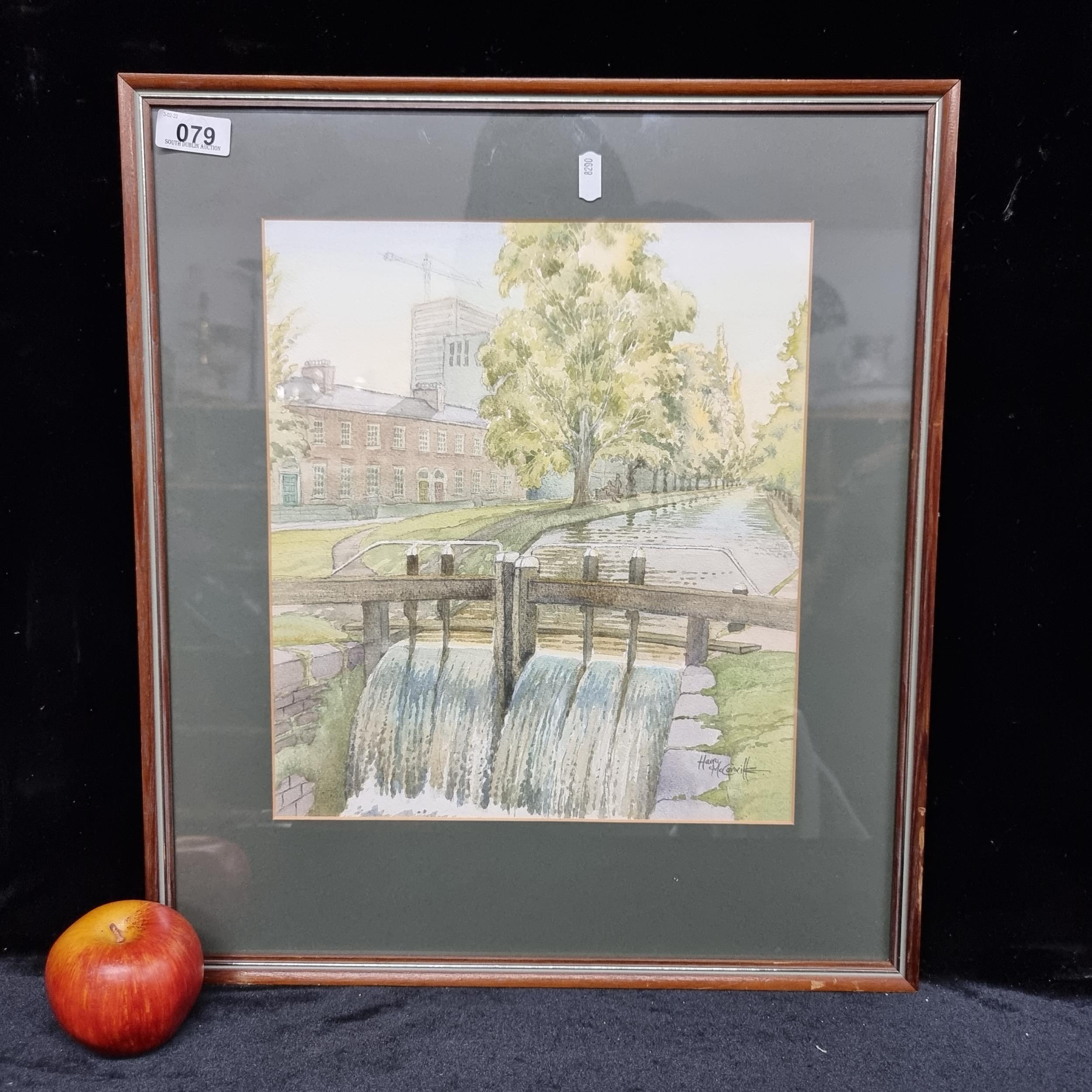 A lovely original watercolour painting of 'Lock Gates near Patrick Kavanagh seat ' (1982) by the established Irist artist Harry McConville. The painting shows water flowing through the lochs in a leafy green scenery with Kavanagh's seat in view. McConville is a very popular Irish artists with extensive auction history and many commissions.
