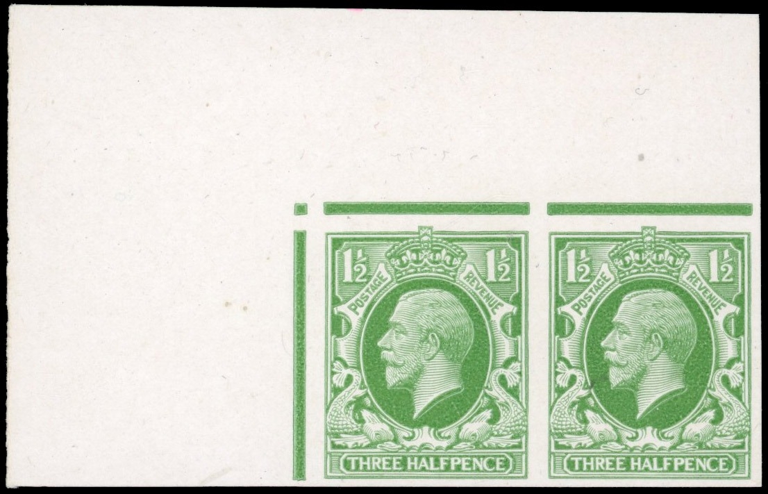 1934 Photogravure 1½d colour trial in emerald-green, top left corner horizontal pair printed on unwatermarked glazed ungummed paper. Fine. SG 441 var