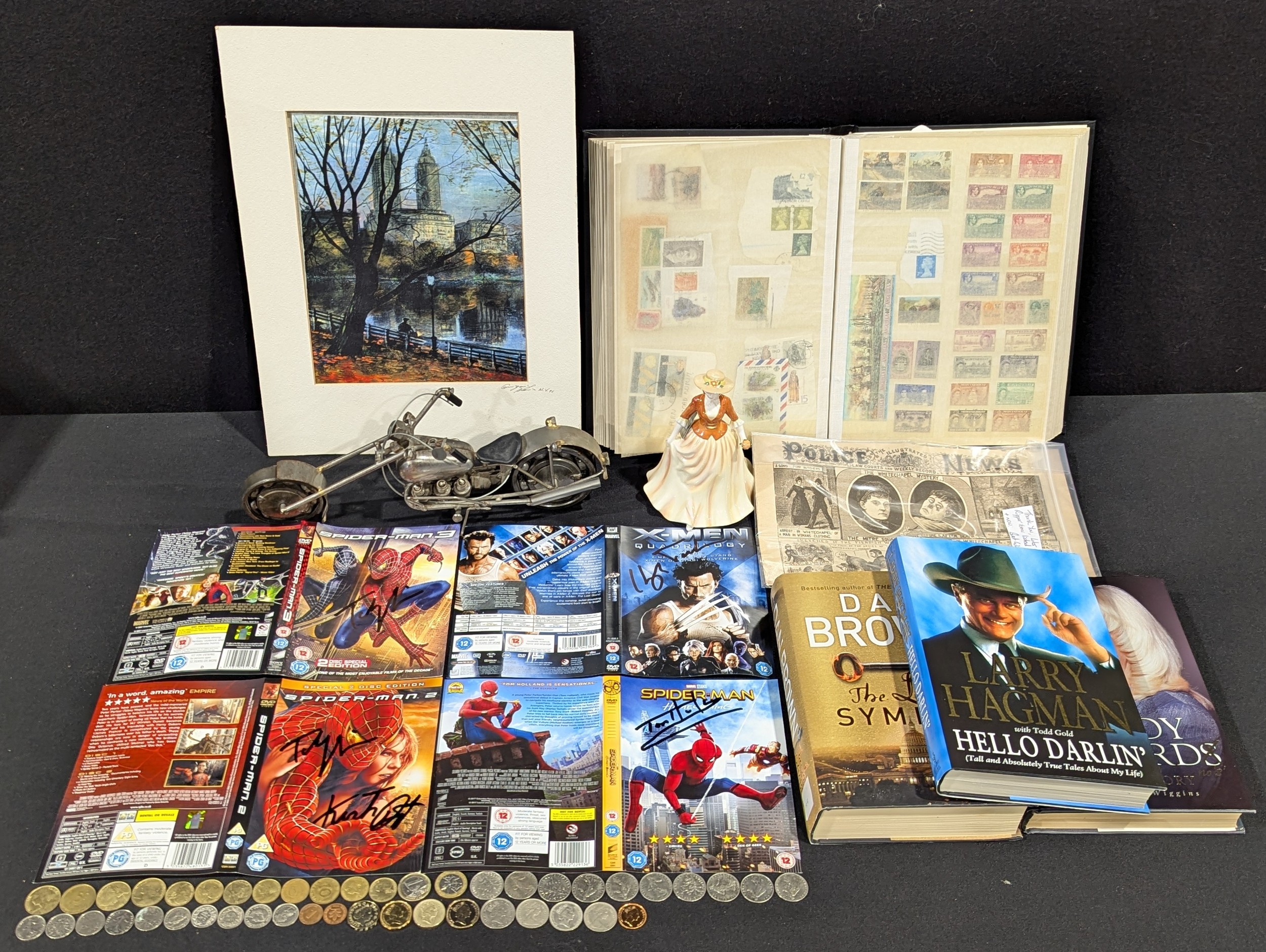 Boxes & Objects - stamps, international, GB and commonwealth one album, autographed books, Dan Brown The Lost Symbol, Larry Hagman, Hello Darlin' Wendy Richards, My Life Story, signed DVD covers signature inc Toby Maguire, Kirsten Dunst, Tom Holland, Hugh Jackman, scratch built up-cycled model of a Chopper motorcycle with bearing wheels, spark plug engine, coins etc