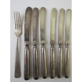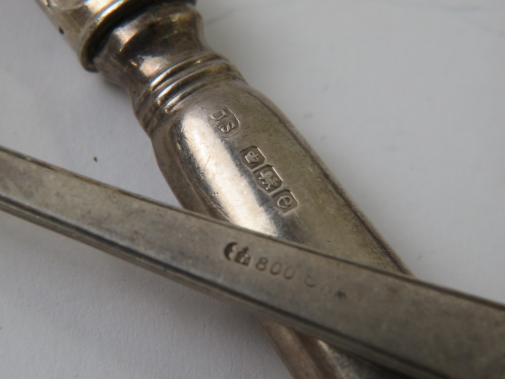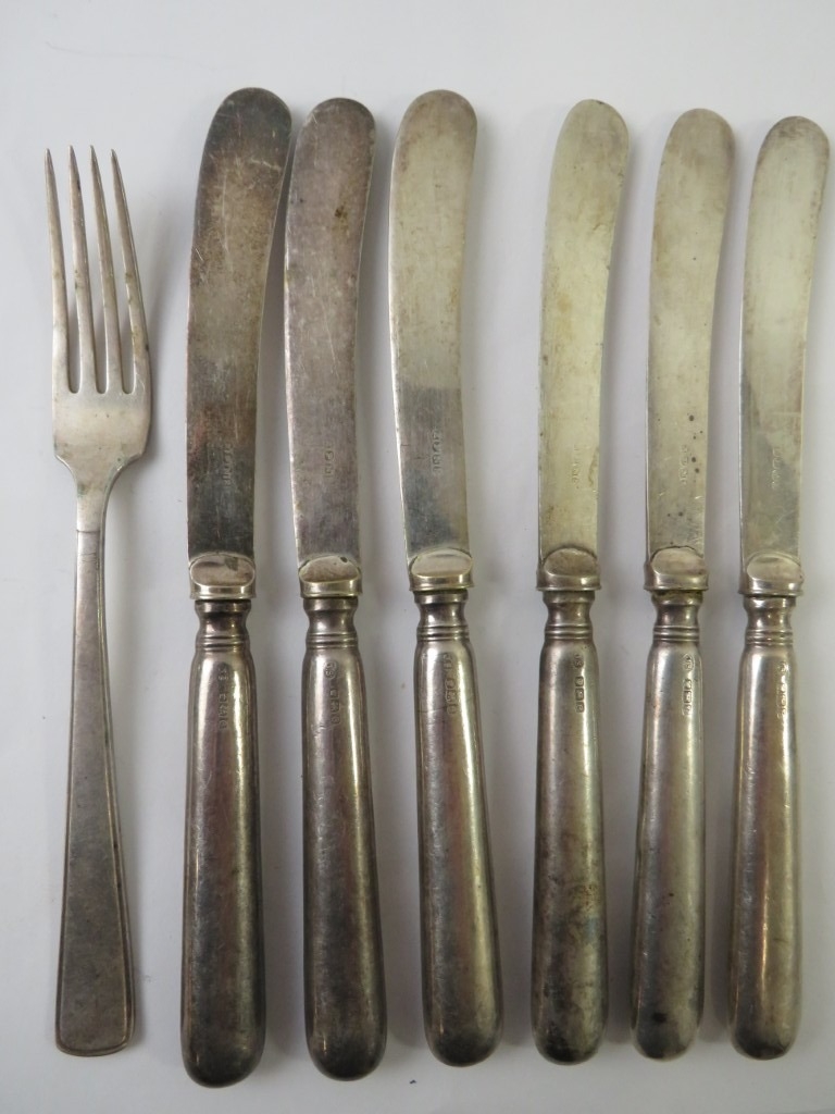 A set of six silver handled butter knives, hallmarked for Sheffield 1922, maker John Sanderson, and a German 800 silver fork. Fork 26 grams. (7)