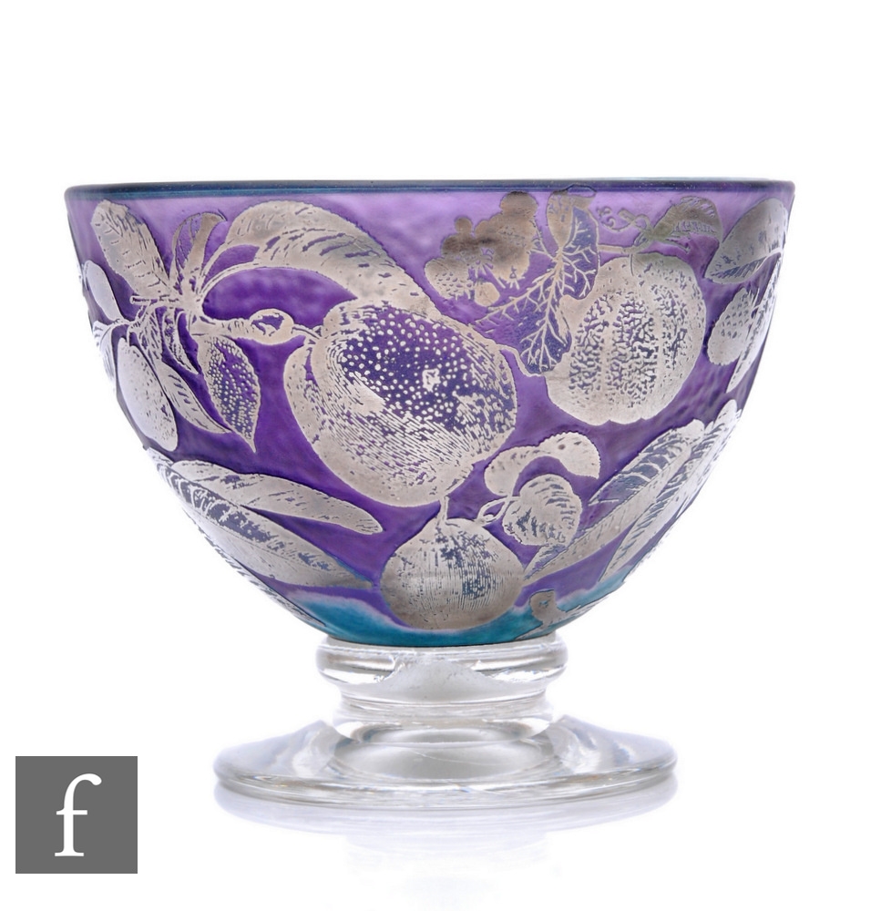 Jonathon Harris - Ironbridge - A contemporary cased cameo glass 'Frost' pattern bowl, of ovoid form on clear glass circular foot, silver fruiting branches over mottled amethyst and emerald green ground, engraved full signature, dated 2001 and No.4/50, height 13cm.