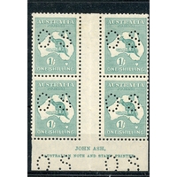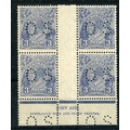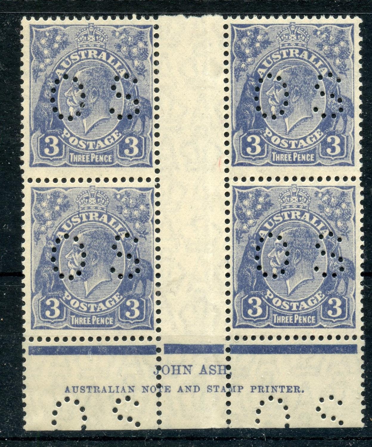 AUSTRALIA - OFFICIAL 1926 - 30 3d deep ultramarine die II in a John Ash imprint block of 4 um. SG 0106b. Cat £100+.