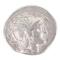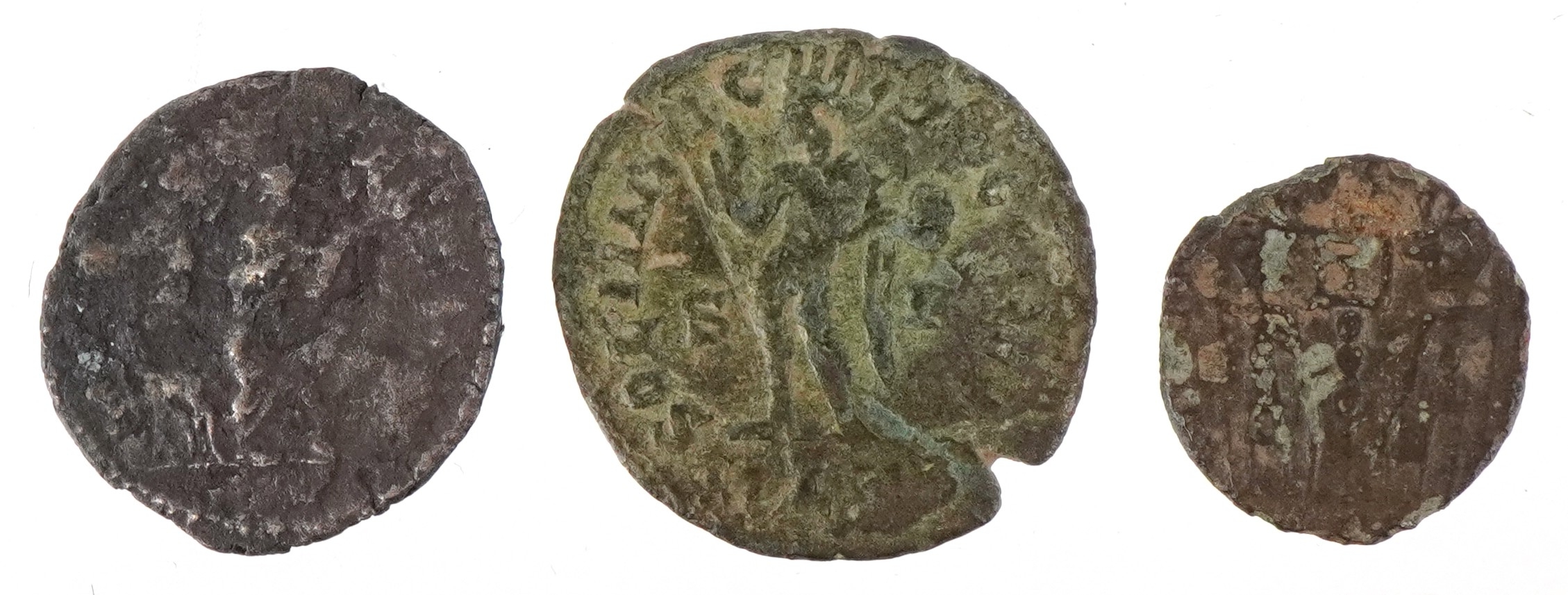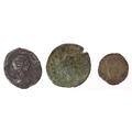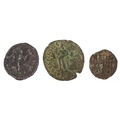 Three Roman coins, a silver denarius with Julia Domner, wife of Emperor Septimius Severus and two bronze coins, the smaller coin with the son of Constantine II Son of Constantine The Great and the reverse having figures standing to the left and right with a religious symbol to the centre, the other with figure standing in the centre with the letter S to the left and a legend to the edge Soli to the reverse.