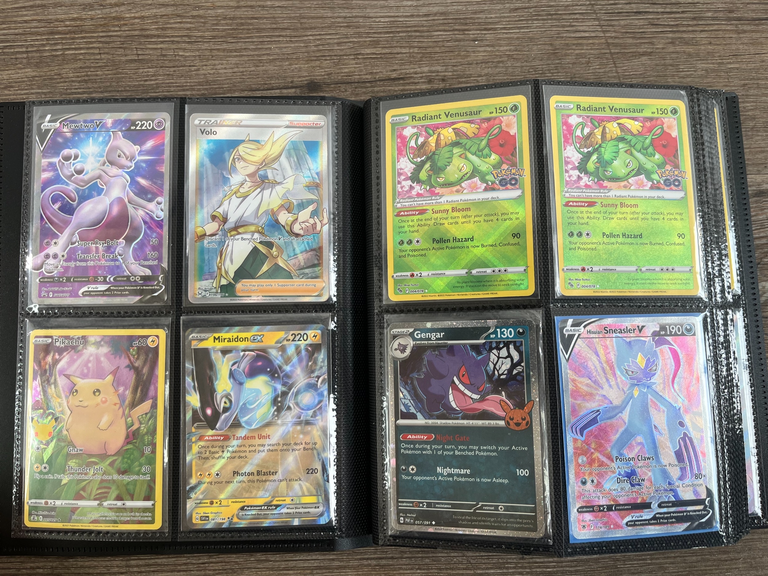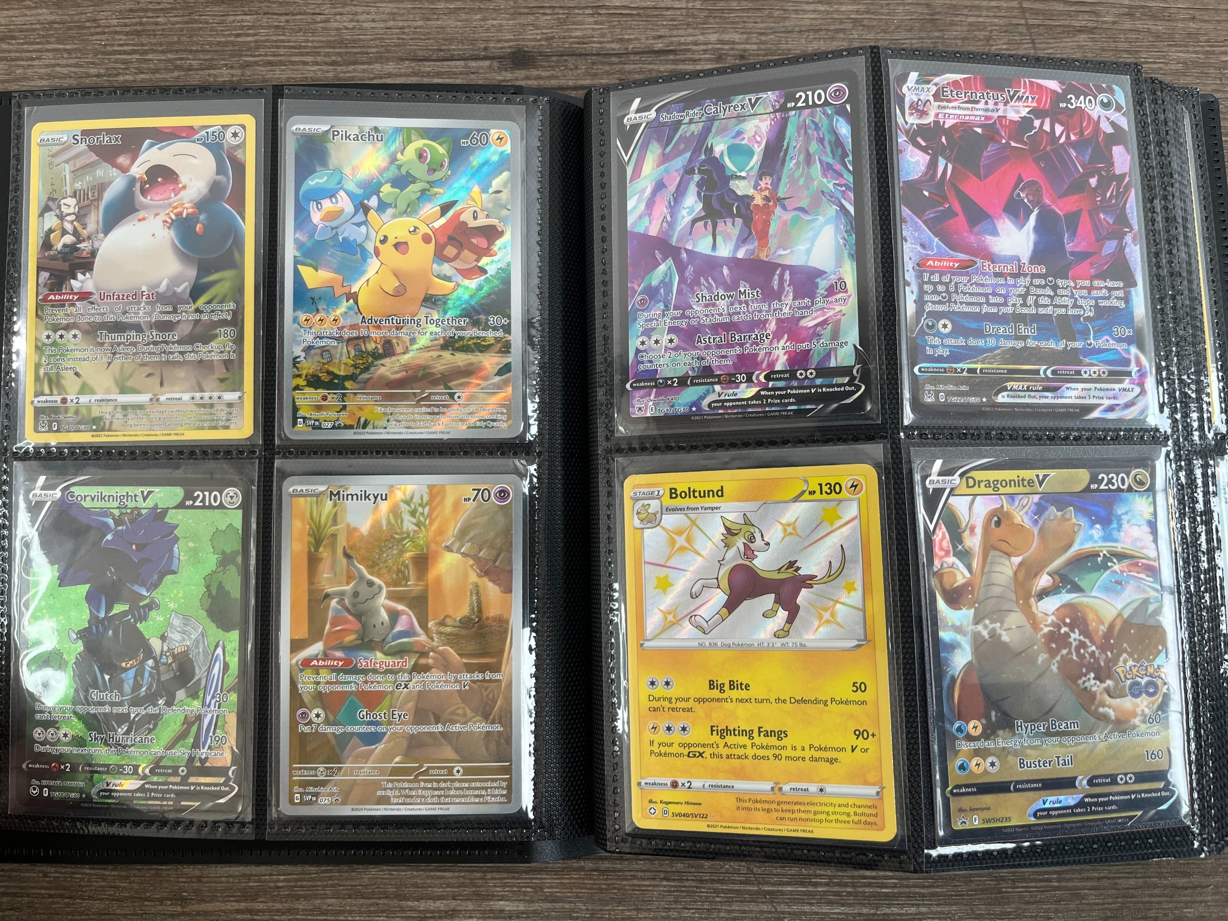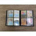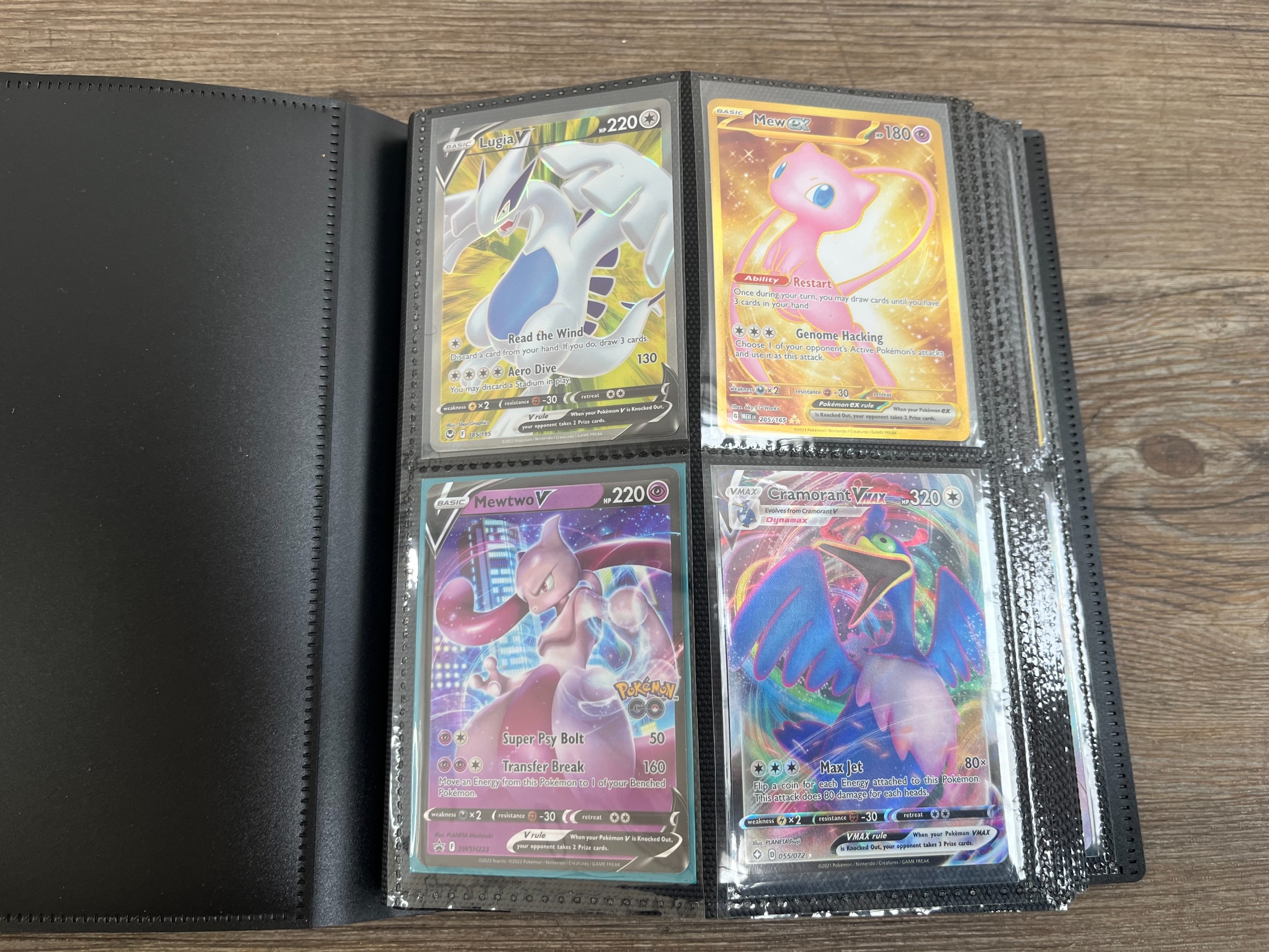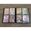 A folder containing a collection of Pokémon trading cards to include Lugia V, Mew EX, Pikachu, Snorlax, Dragonite V, Boltund, Dragonite V Star, Radiant Venusaur, Gengar, Morpeko, Sobble etc.