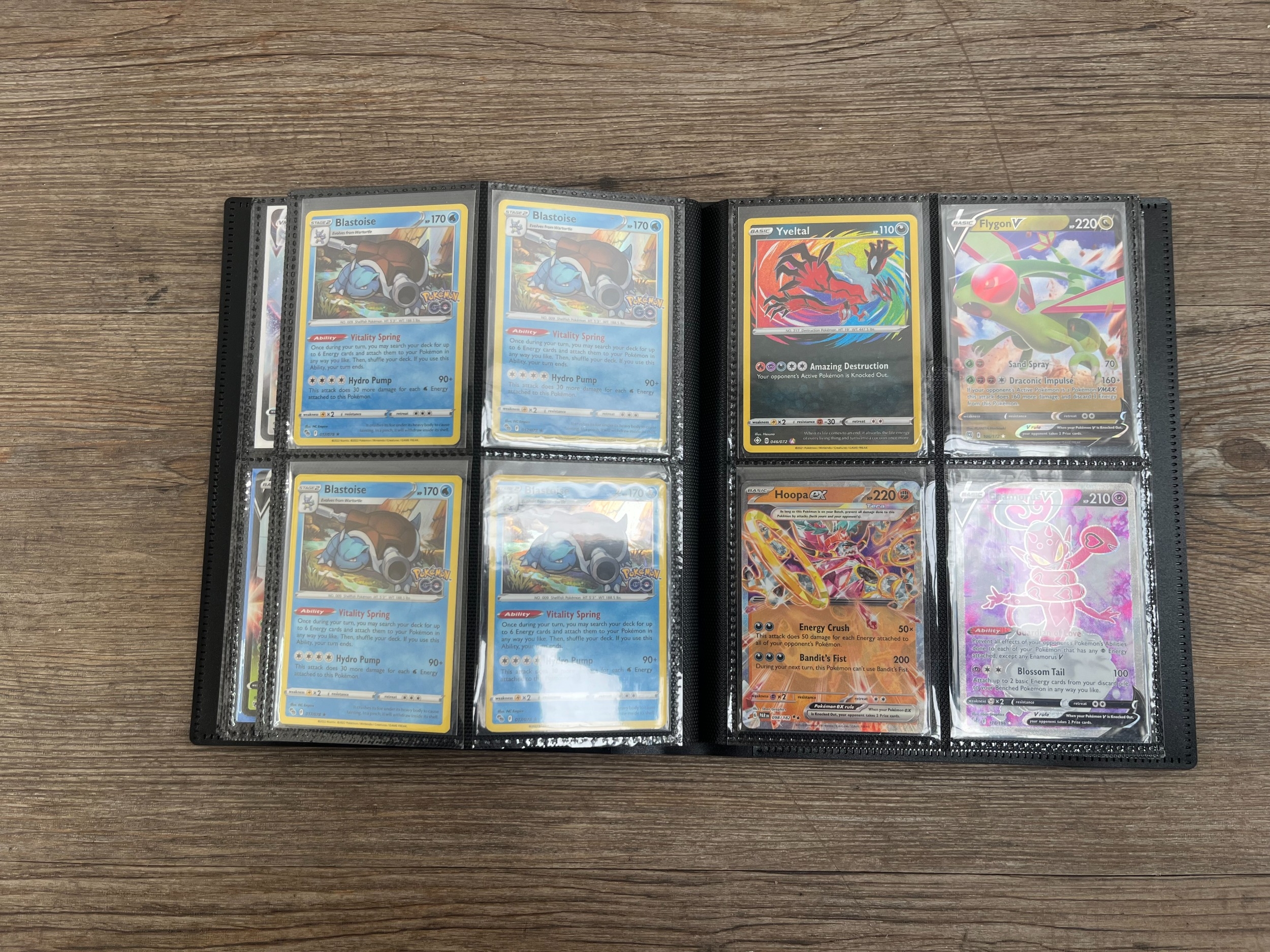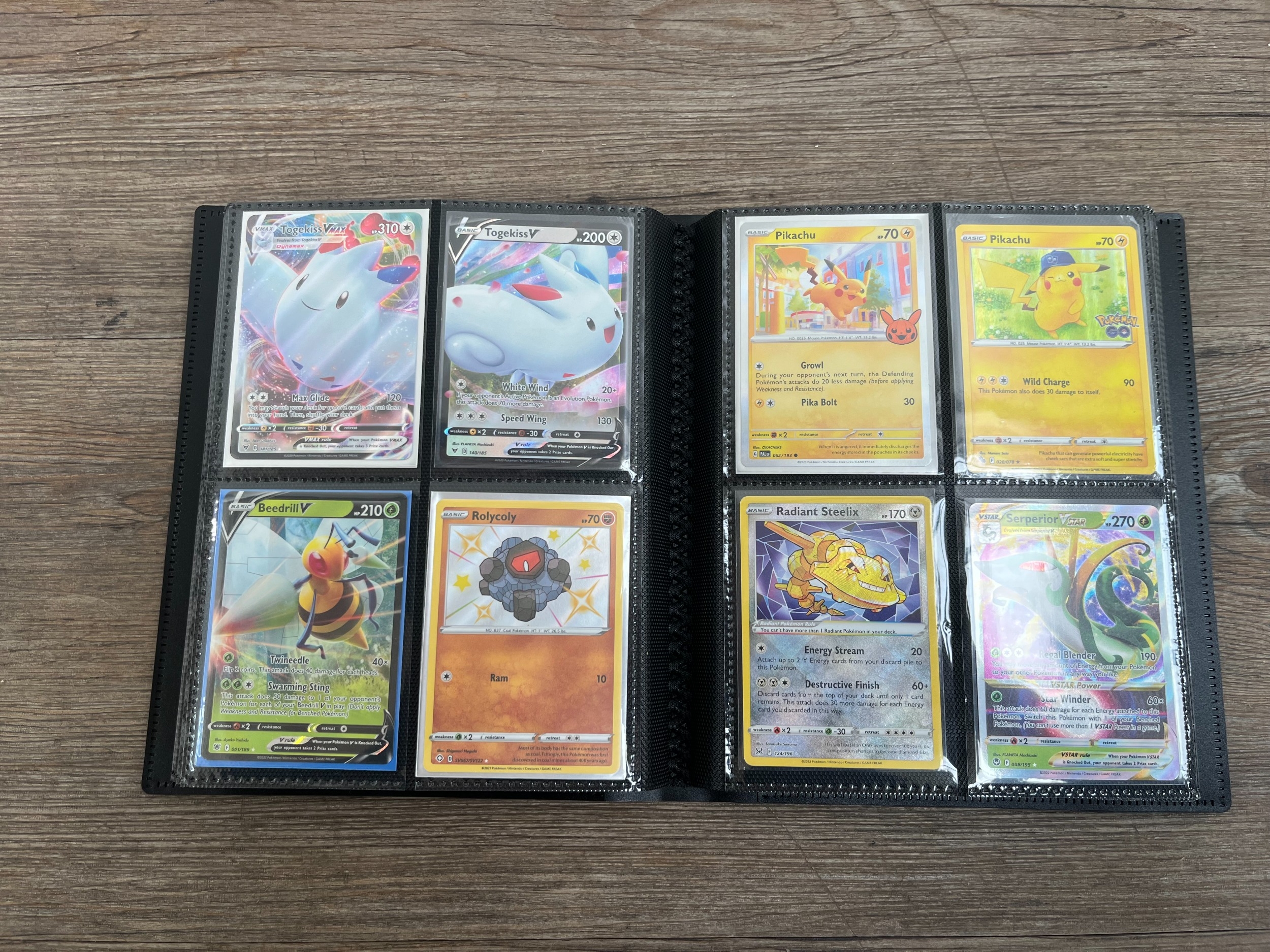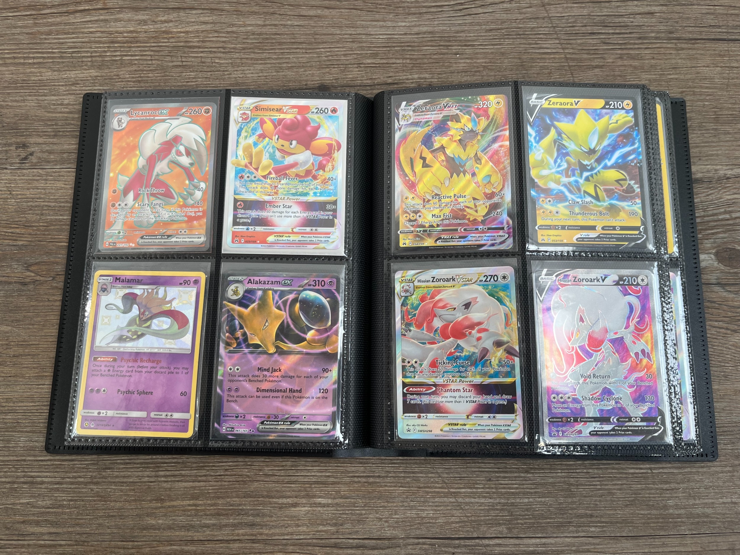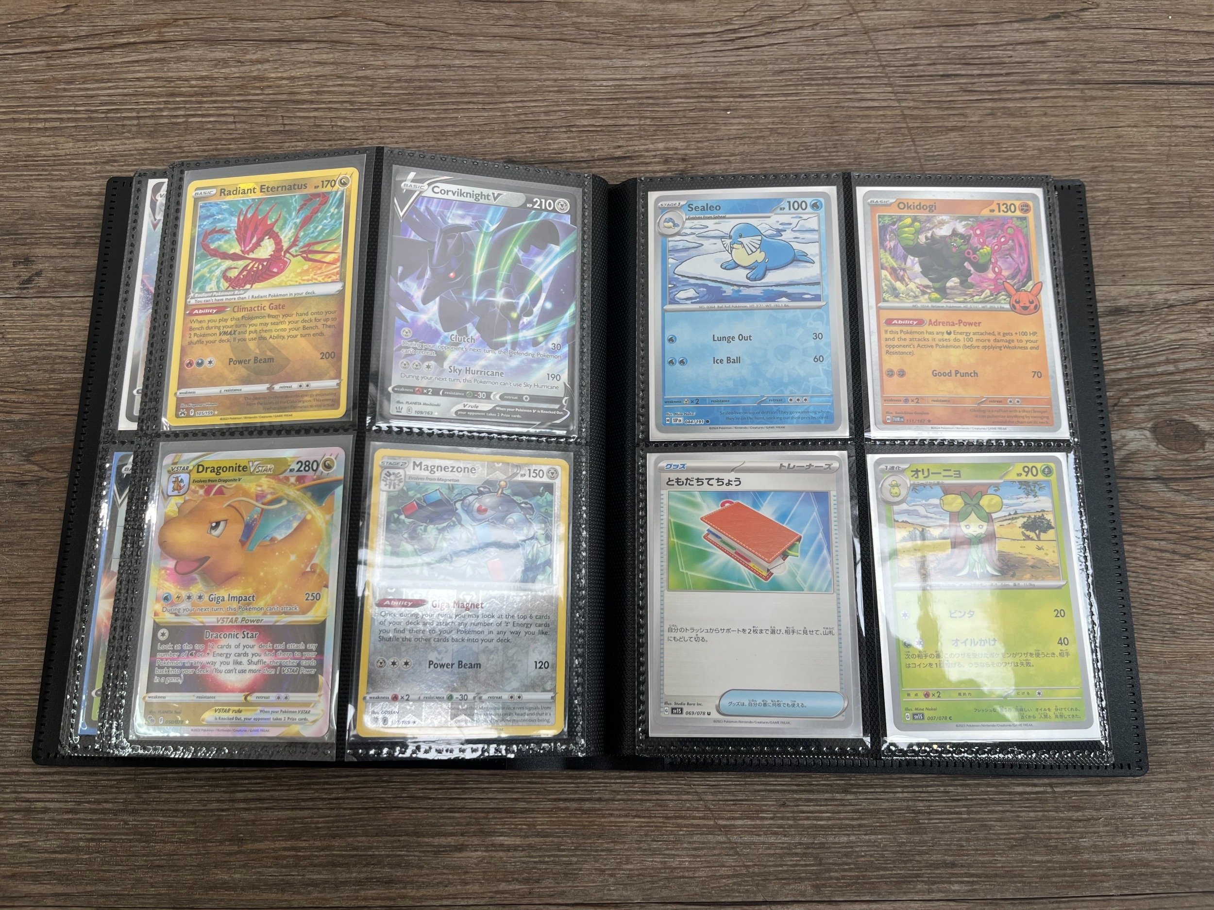 A folder containing a collection of Pokémon trading cards to include Lugia V, Mew EX, Pikachu, Snorlax, Dragonite V, Boltund, Dragonite V Star, Radiant Venusaur, Gengar, Morpeko, Sobble etc.
