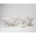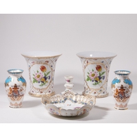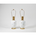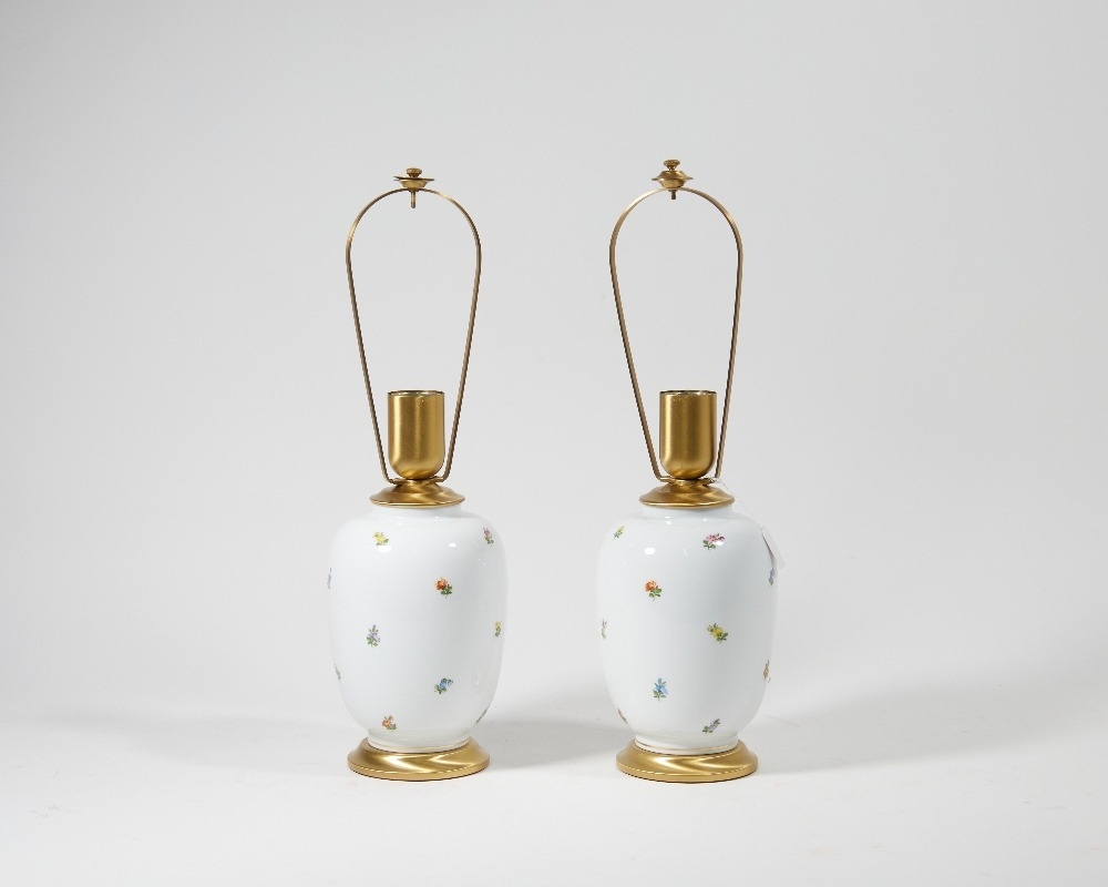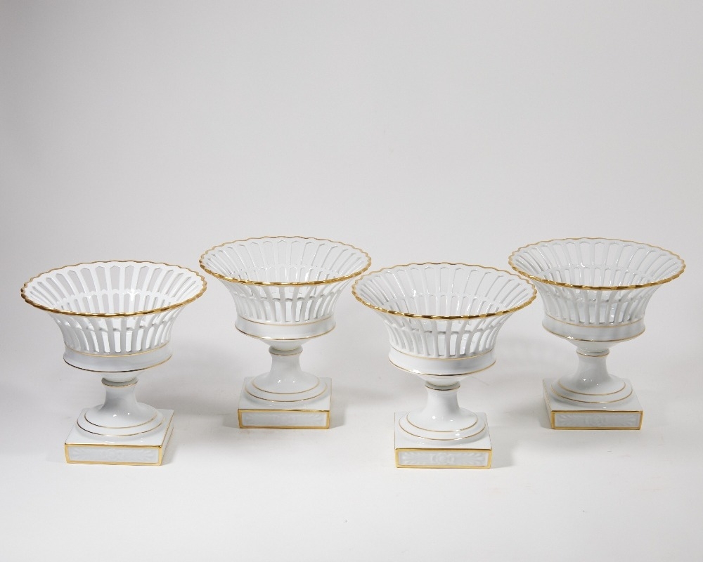 Four Vista Alegre porcelain reticulated basket comports, 20th / 21st century, gilt marks to base, the plinths with moulded decoration, with gilt highlights, 22.5cm high, together with a pair of modern brass-mounted porcelain ovoid vase lamps, painted with floral sprigs, 21cm high excluding fittment (6)