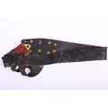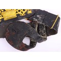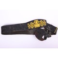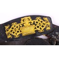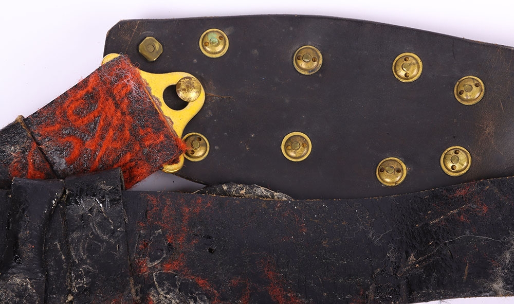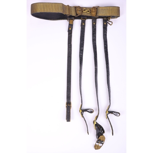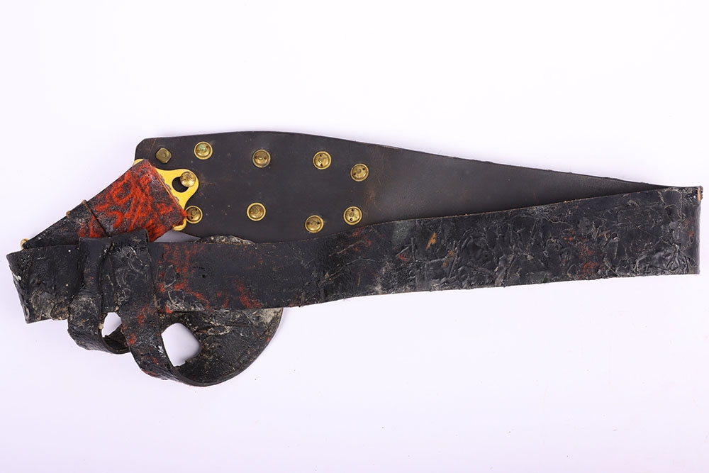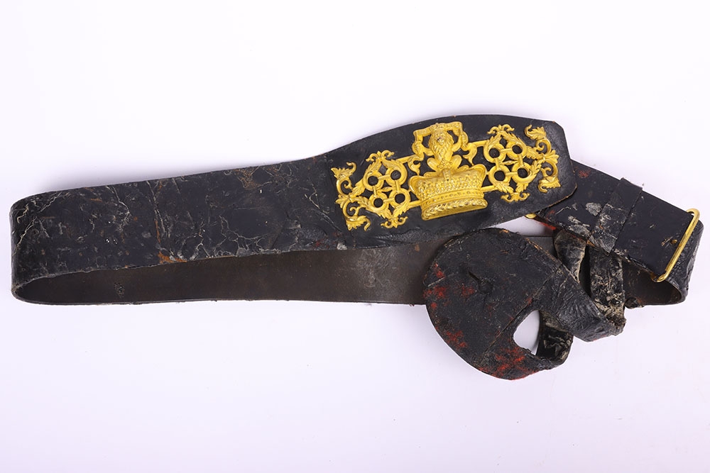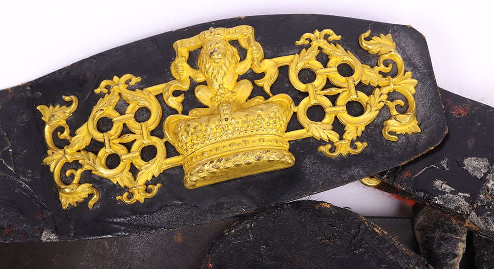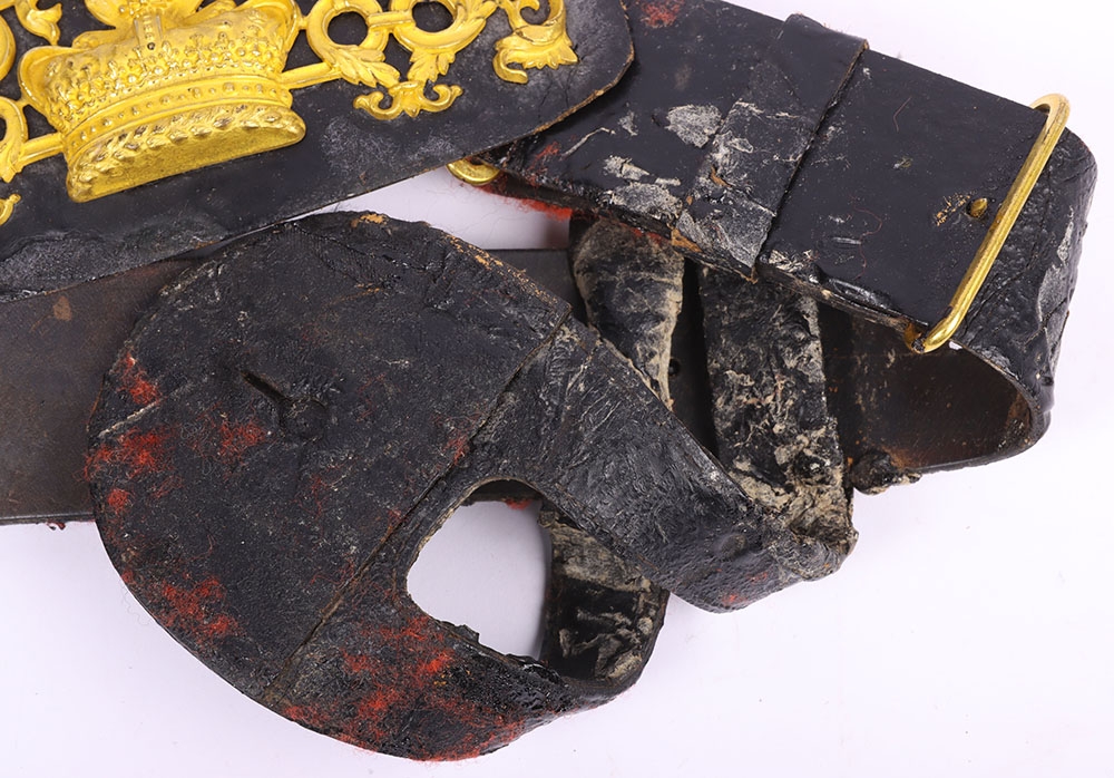 Victorian Royal Company of Archers Queens Bodyguard of Scotland Undress Belt, black patent leather waist belt with fine quality rich gilt metal officers waist belt plate in the form of Victorian crown with lion above holding scroll with motto ‘IN DEF’, within and attendant circular foliate work. Stud fixing to the reverse of the plate which fits to the leather belt. Complete with the sword hanger. Some congealing to the leather but generally a good example with an excellent condition waist belt clasp.