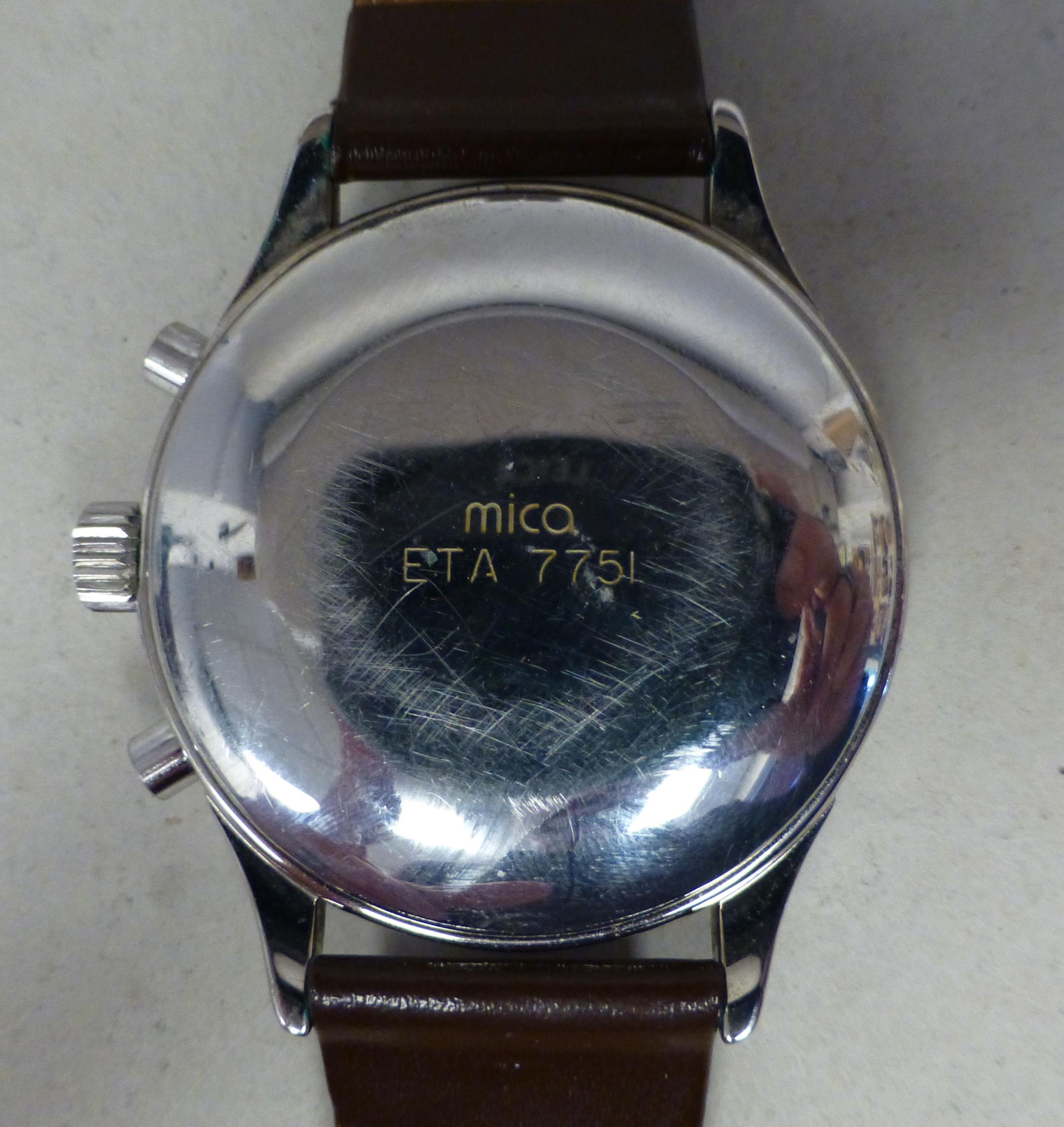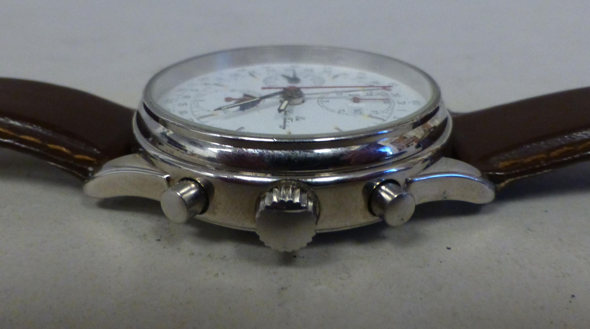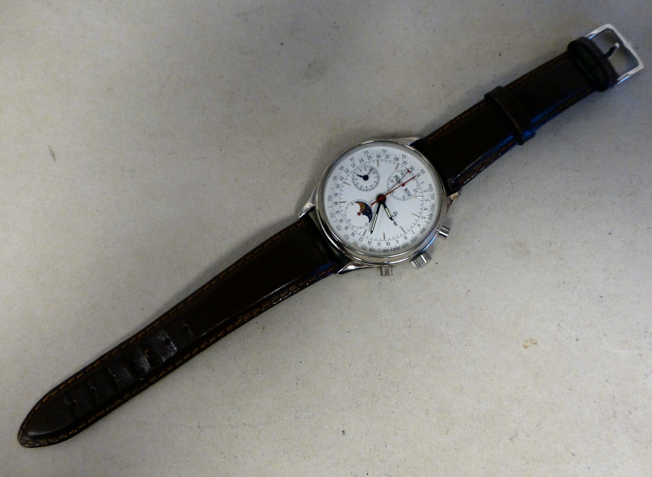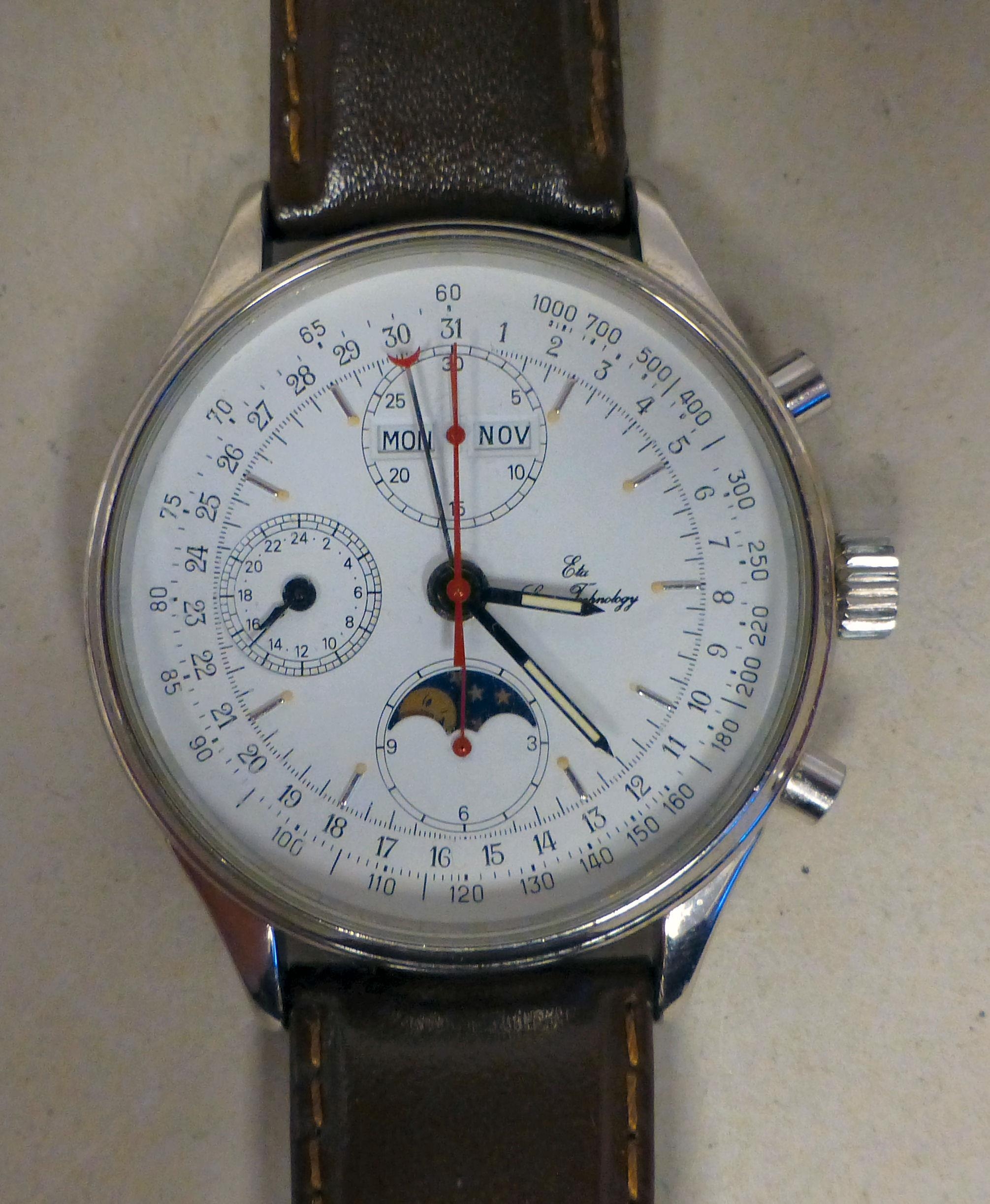 An ETA stainless steel cased, automatic chronograph 7751, calendar moonphase wristwatch, faced by an Arabic dial