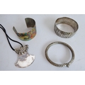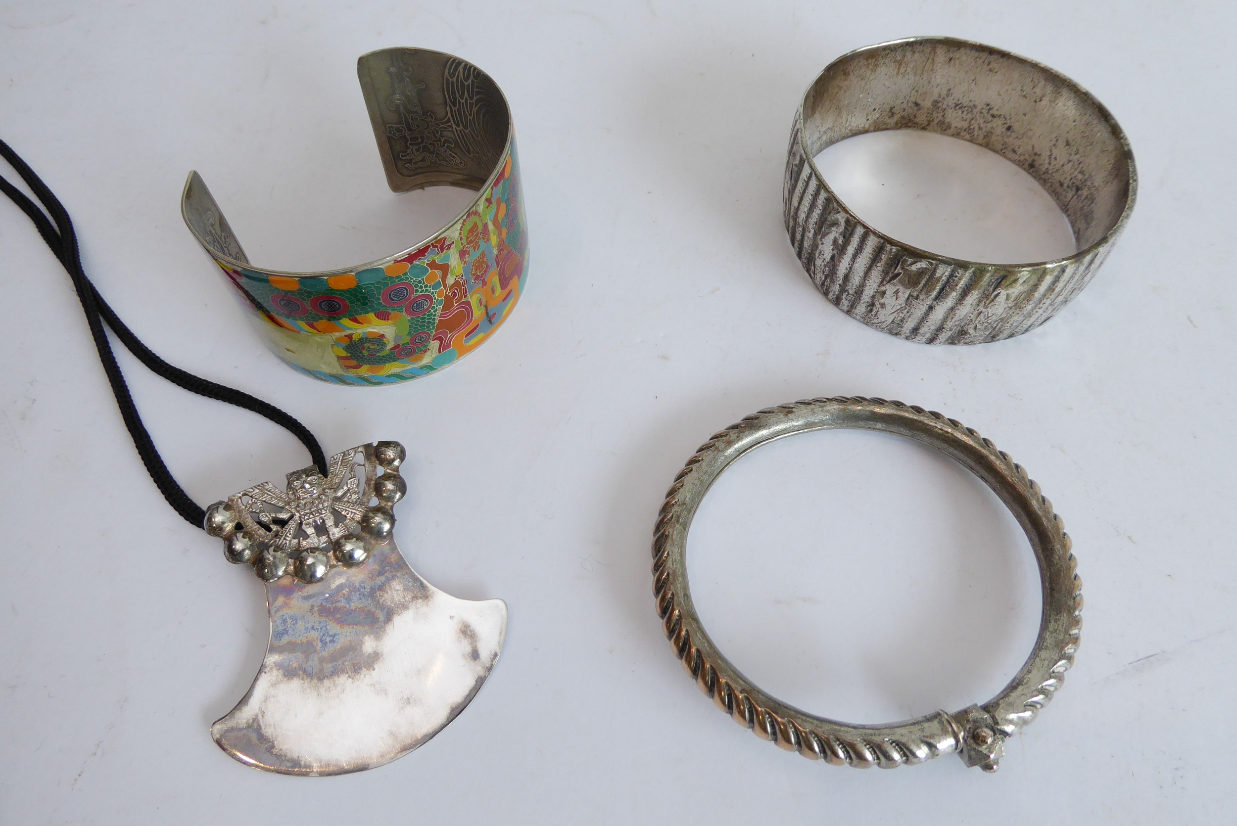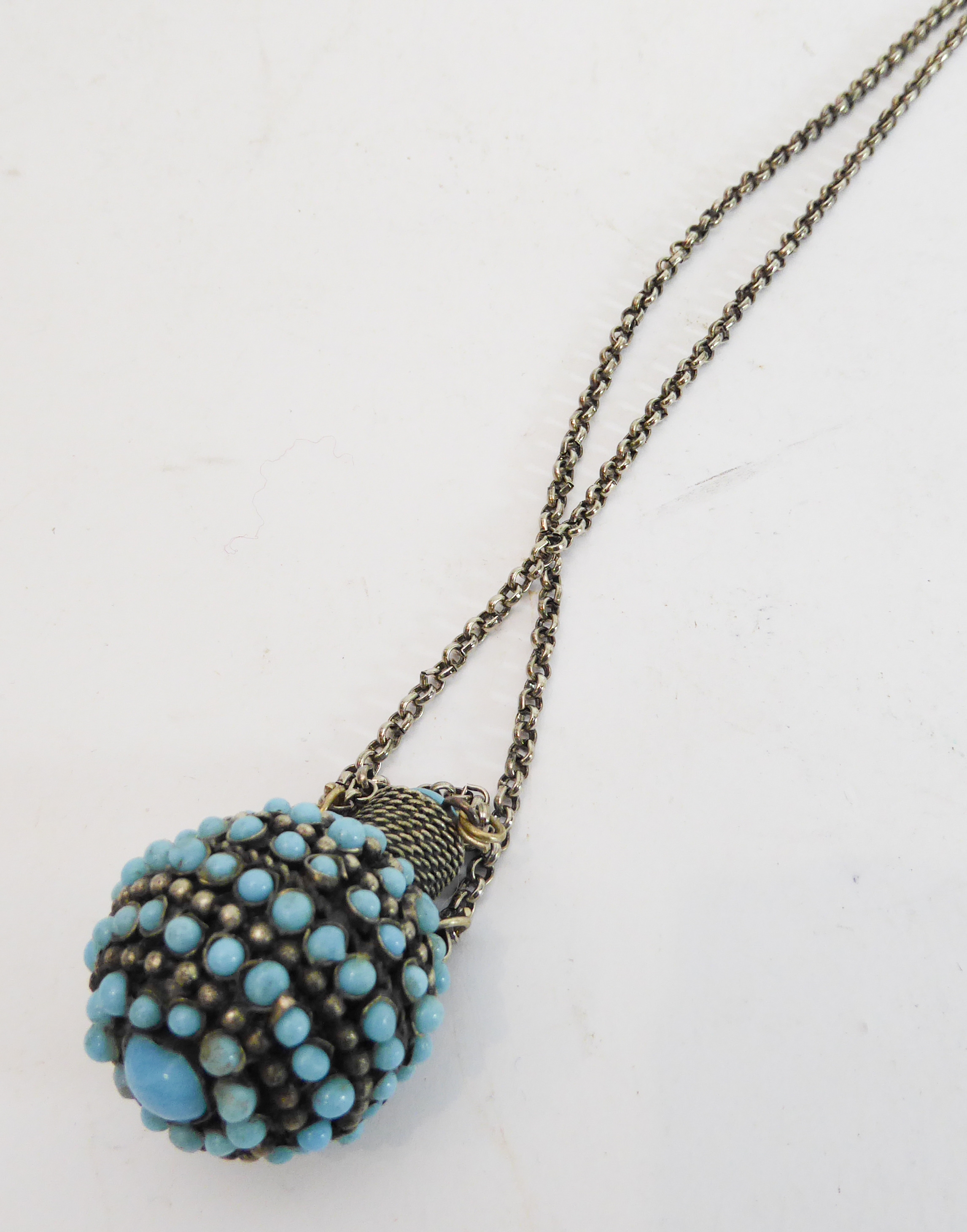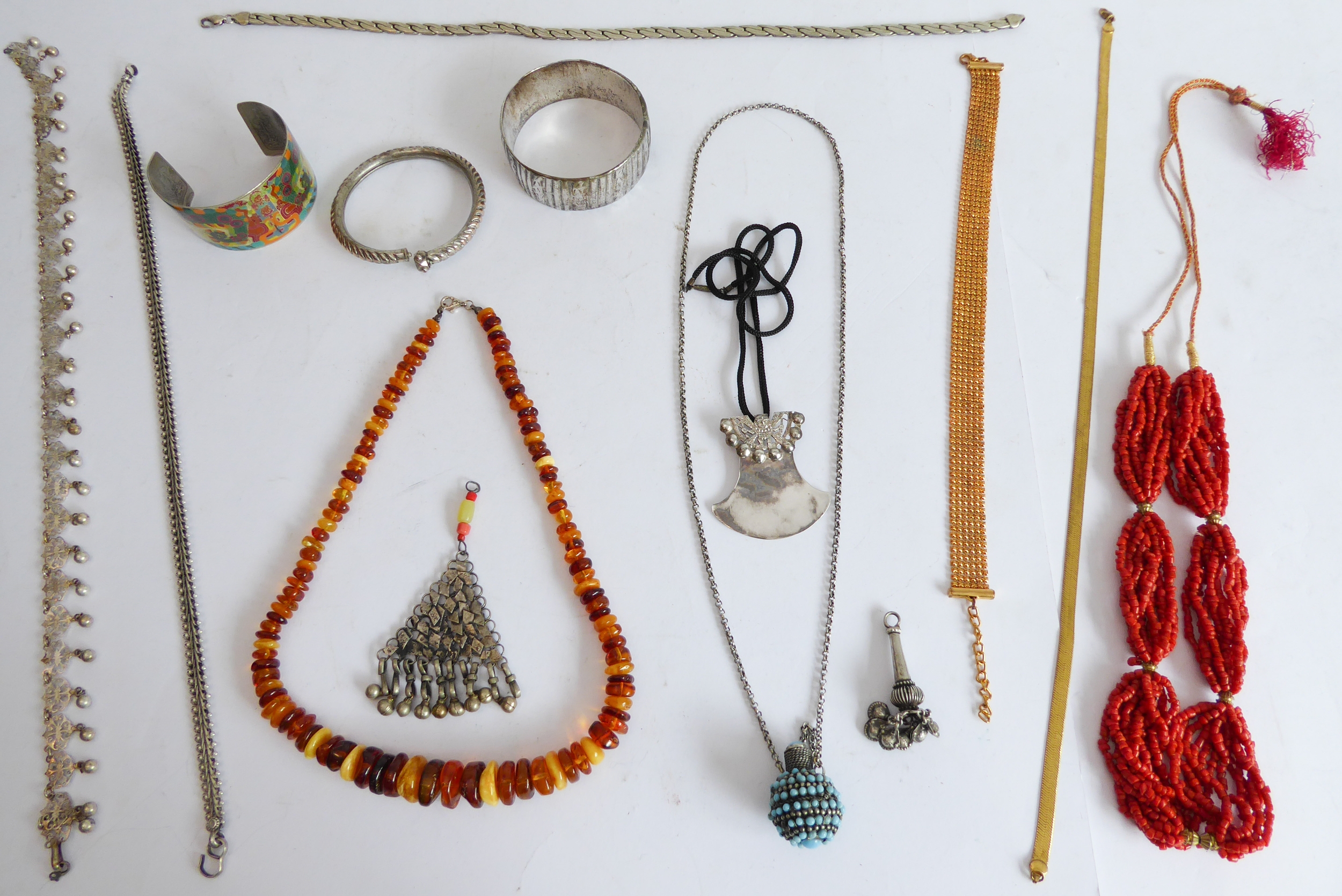 a spherical turquoise-mounted white-metal scent bottle, bangles and necklaces.