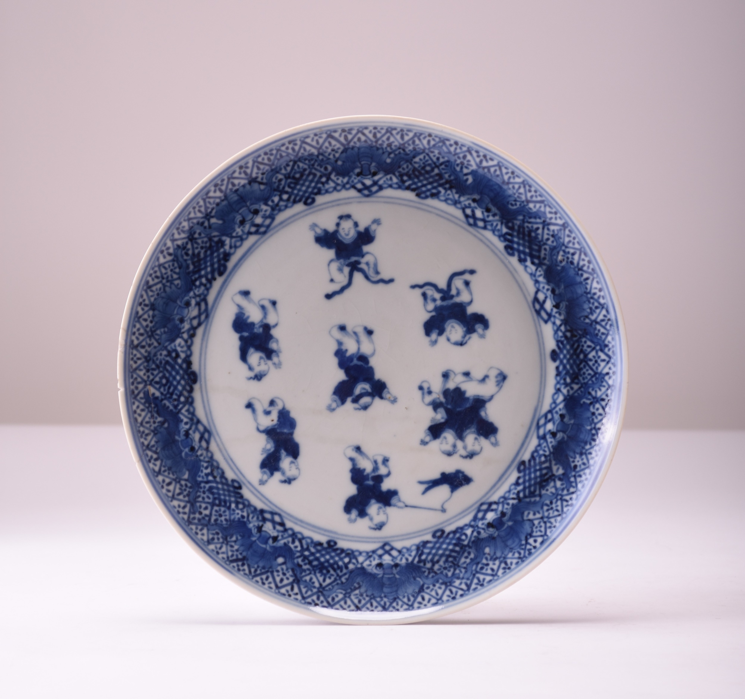 A Chinese blue and white 'hundred boys' dish, 18th century Decorated with playing boys, the rim with ten bats. 24cm dia. (repair to rim) Property of a private London collector. Footnote:The decorative motif of playing boys is attributed to the legend of Zhou Wen Wang (1152–1056 BC), founder of the Zhou Dynasty, who is said to have fathered 99 children and adopted a hundredth.