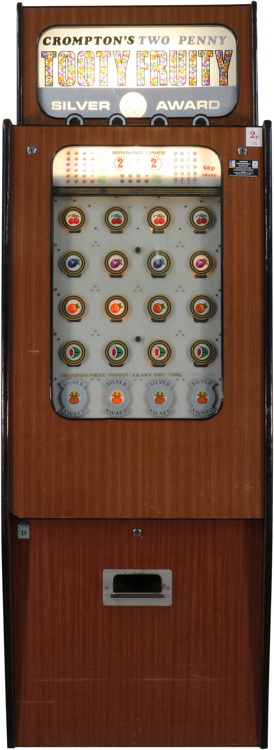 Tooty Fruity Silver Award by Alfred Crompton / Crompton Amusement Machines Ltd., a classic staple of every 1970's amusement arcade! In very good cosmetic condition and full working order, pays a large old 50p coin as Silver Award for lighting the bottom line.