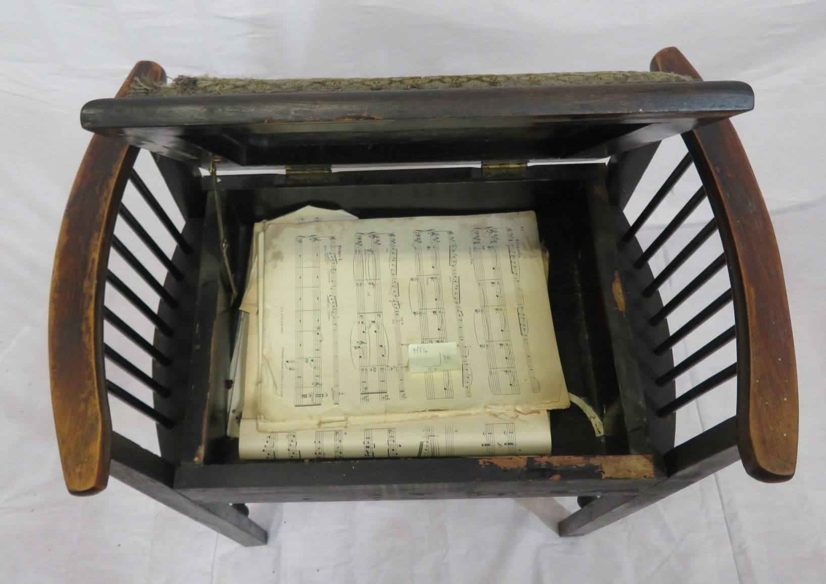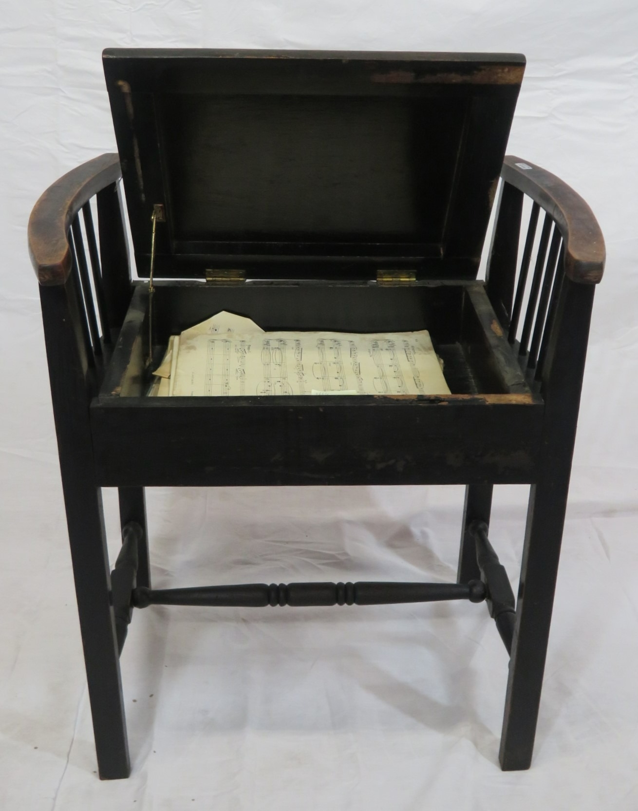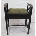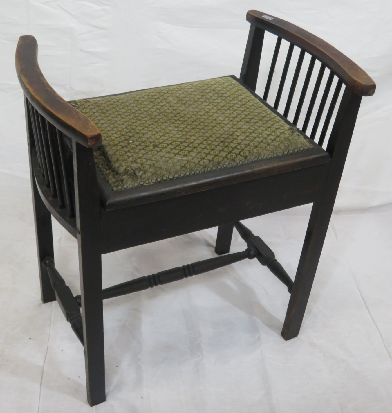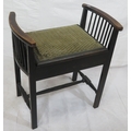 Edward piano stool with upholstered lift-up lid, railed sides, on tapering legs with stretchers