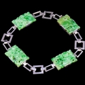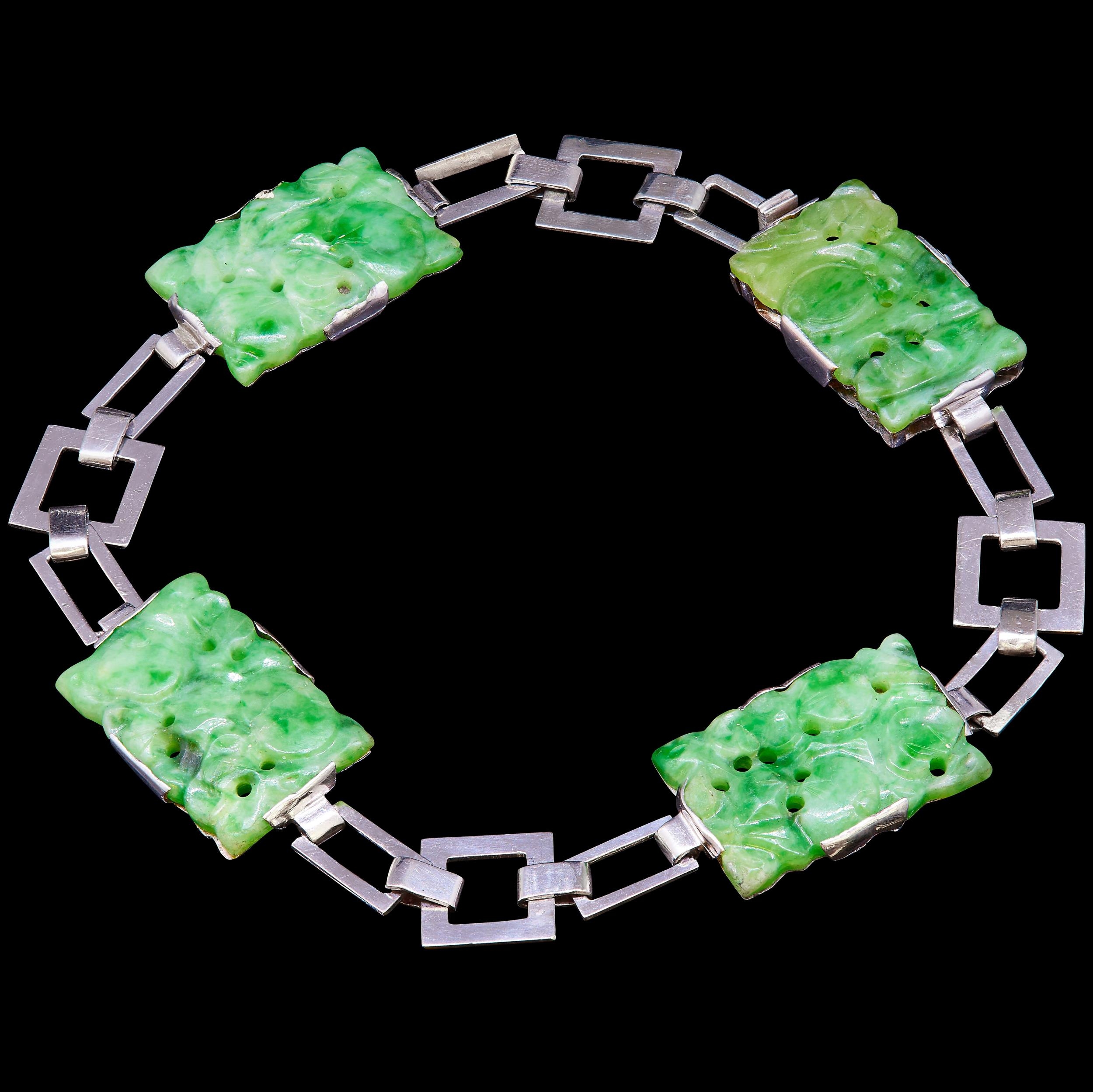 JADE LINK BRACELET, set with 4 green jade plaqyes, carvied with floral decoration. L. 18 cm. 13.1 grams.