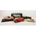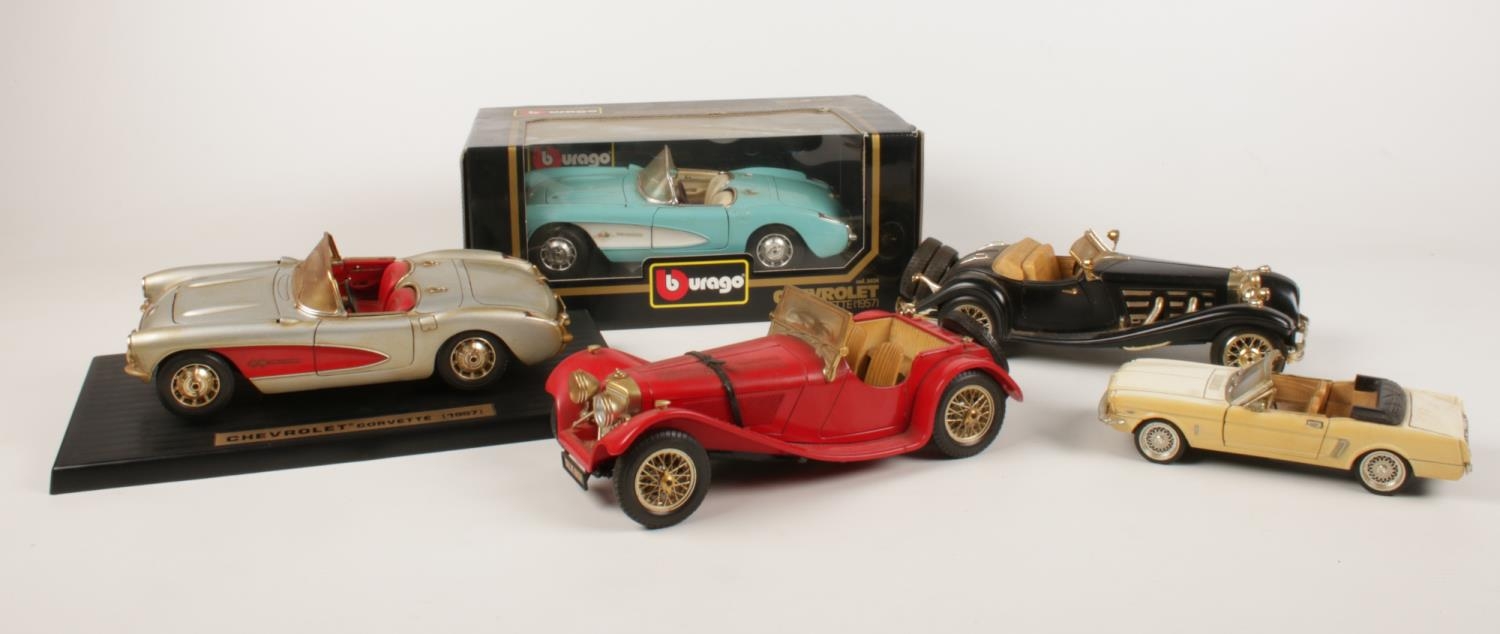 A group of die cast vehicles. Burago Jaguar SS 100 1/18, Burago Mercedes Benz Roadster 1/20, Burago Chevrolet 1/18 . To include a boxed Burago Chevrolet Corvette examples etc