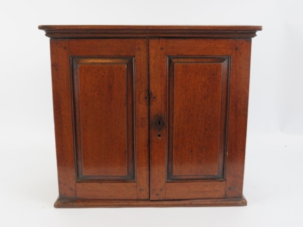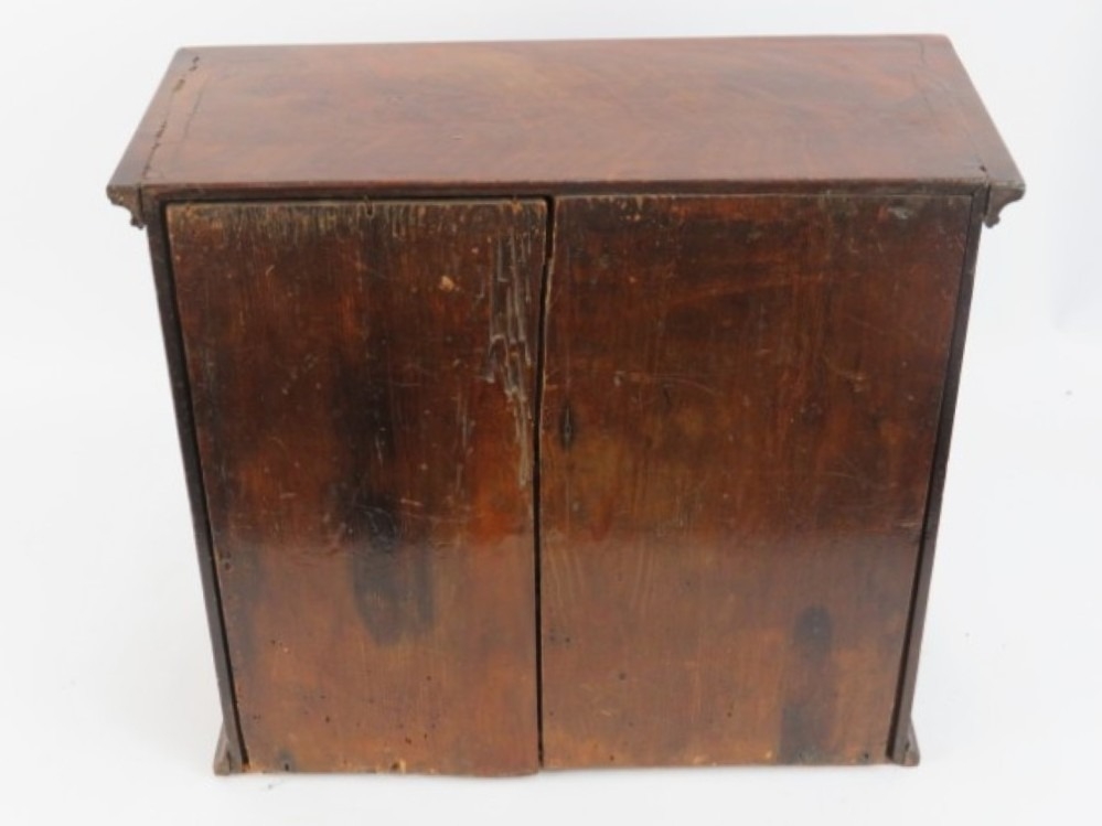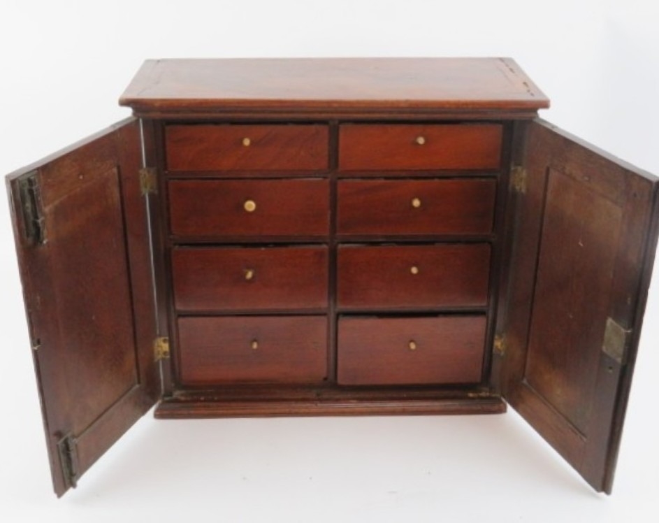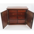 A Victorian mahogany desk top cabinet. The hinged doors open to reveal eight internal drawers with bone handles. 36 cm height, 40.5 cm width, 17.4 cm depth.