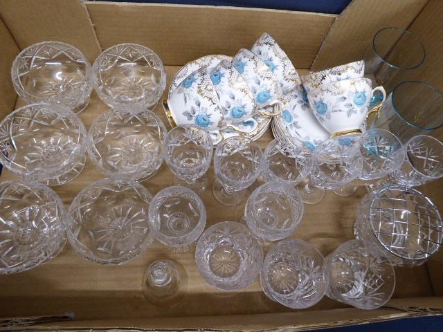 Cut glass trifle dishes, wine glasses, Bowbell China tea set etc