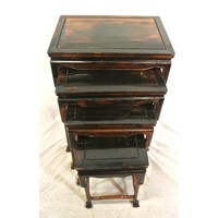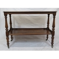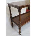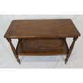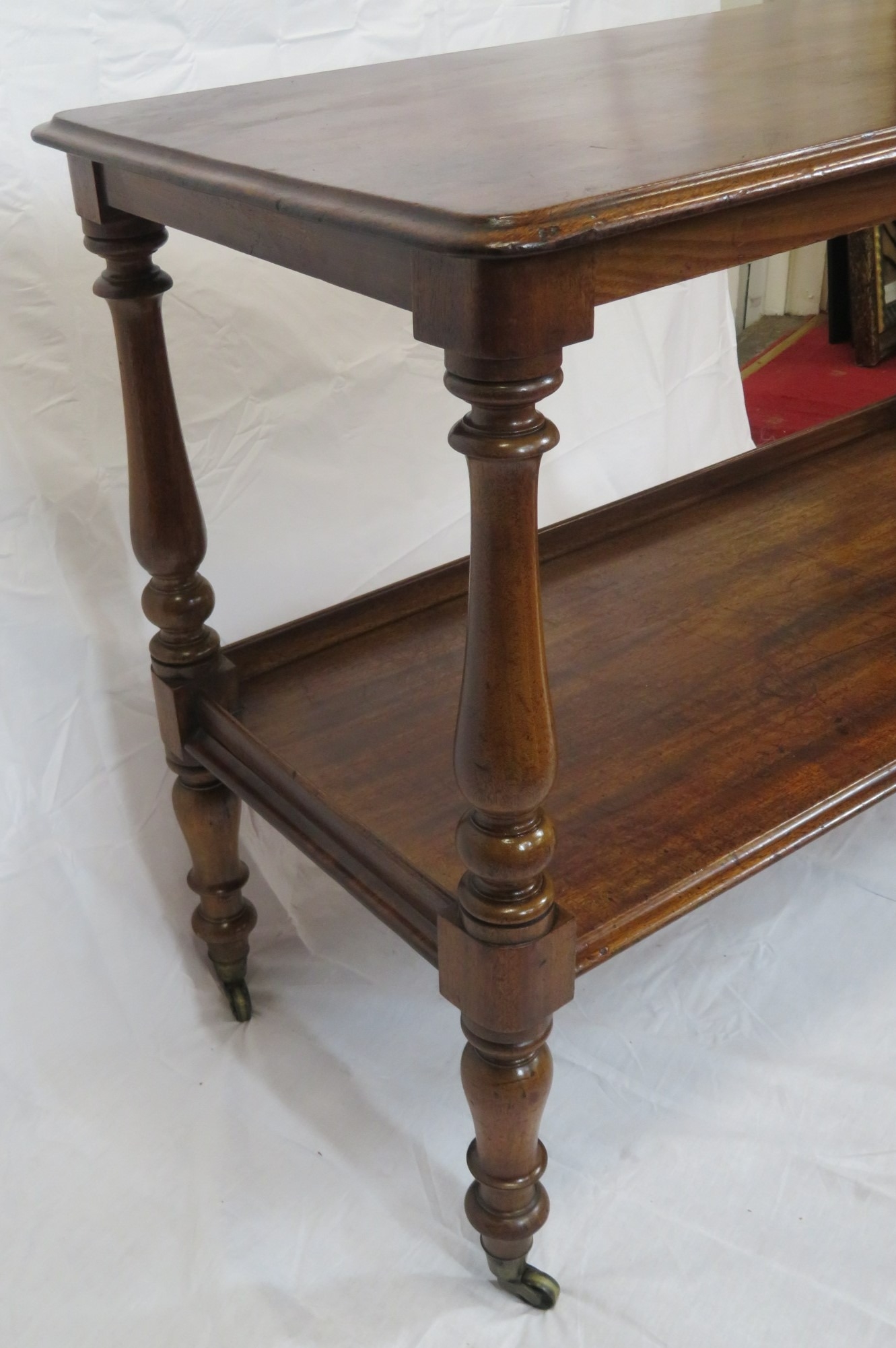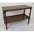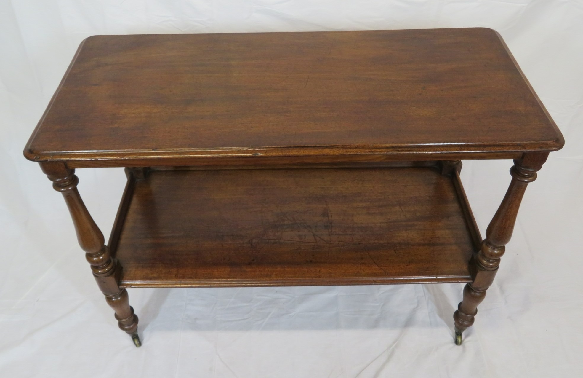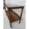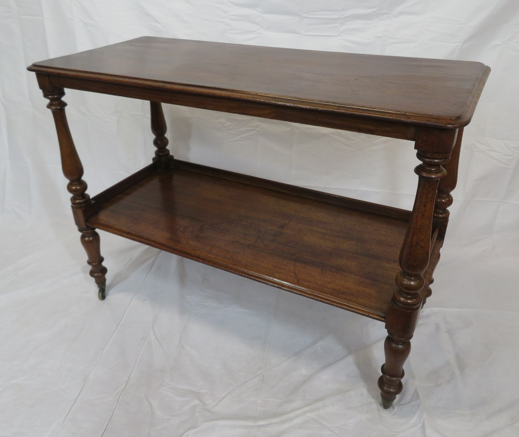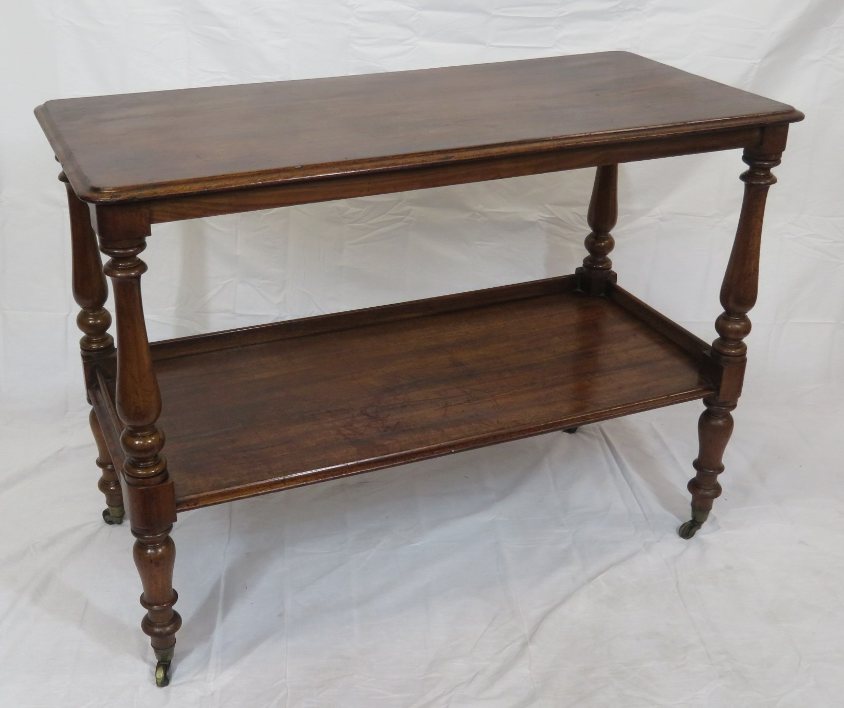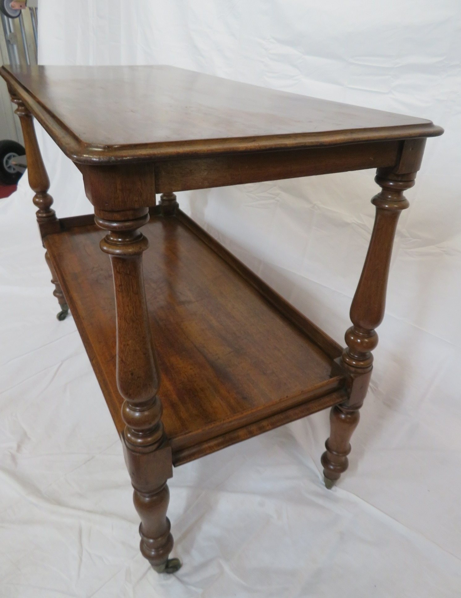 Victorian mahogany 2-tier dumbwaiter with rounded corners, baluster turned columns, on castors
